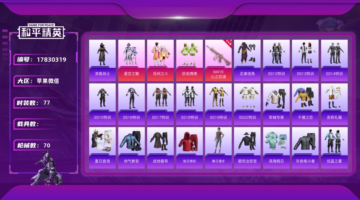 [17830319]【特价出售/店主推荐】苹果 微信-3粉装-1特效枪-0载具-2粉色飞行器-27357热力值-6王牌印记-77套装-70枪皮 【热门品类】:套装-忍者信条,套装-浪客战士 【粉色套装】:粉装-星空之魅,粉装-花间之火,粉装-恐龙拽拽 【粉色枪皮等级】:M416-心之恋语(六级) 【粉色枪皮】:M416-心之恋语 【粉色飞行器】:四圣焕新飞行器,心之恋语飞行翼 【粉色降落伞】:四圣焕新降落伞,心之恋语降落伞,马卡龙降落伞,潮汐统领降落伞,银刃赛罗降落伞,星之彼岸降落伞,蓝莓炮弹降落伞,海螺星光降落伞,异瞳寒姬降落伞,炫彩糖果降落伞 【稀有枪皮】:AKM-四圣焕新,AKM-夜灯,AKM-萌趣颜团子,AKM-虎虎生威,SCAR-L-兔兔白日梦,SCAR-L-炫彩节奏,SCAR-L-红色方程式,M416-潮汐统领,M416-红色方程式,GROZA-异彩先驱,GROZA-影袭,GROZA-紫翼圣骑,AUG-耀粉歌者,AUG-青春冒险家,QBZ-原初圣火,QBZ-潮汐统领,QBZ-飞驰魅影,M762-奇异狩猎者,M762-牛气冲天,M762-镭射皇者,G36C-时空追击者,UMP45-时空追击者,Vector-彩虹符号,汤姆逊-天降萌叽,汤姆逊-异彩先驱,野牛-夜灯,MP5K-异彩先驱,P90-飞驰魅影,Kar98K-炫彩节奏,Kar98K-飞驰魅影,SKS-心之恋语,SKS-时空追击者,VSS-镭射皇者,Mini14-原初圣火,Mini14-异彩先驱,Mini14-炫彩节奏,SLR-四圣焕新,SLR-葫芦兄弟,S686-奇异狩猎者,S686-橘柚倾心,S686-生命誓言,S1897-镭射皇者,S1897-飞驰魅影,DBS-时空追击者,M249-四圣焕新,M249-百万伏特,M249-糯团青竹,M249-镭射皇者,DP-28-原初圣火,DP-28-紫翼圣骑,MG3-幻世战舞者,P18C-原初圣火 【其他套装】:套装-SS12特训,套装-SS13特训,套装-SS14特训,套装-SS15特训,套装-SS16特训,套装-SS17特训,套装-SS18特训,套装-SS19特训,套装-SS22特训,套装-军械专家,套装-千禧之恋,套装-吉莉礼服,套装-夏日音浪,套装-帅气教官,套装-战地督导,套装-旭日情侣,套装-春日漫步,套装-朋克治安官,套装-滨海假日,套装-灰色格斗者,套装-炫蓝之夏