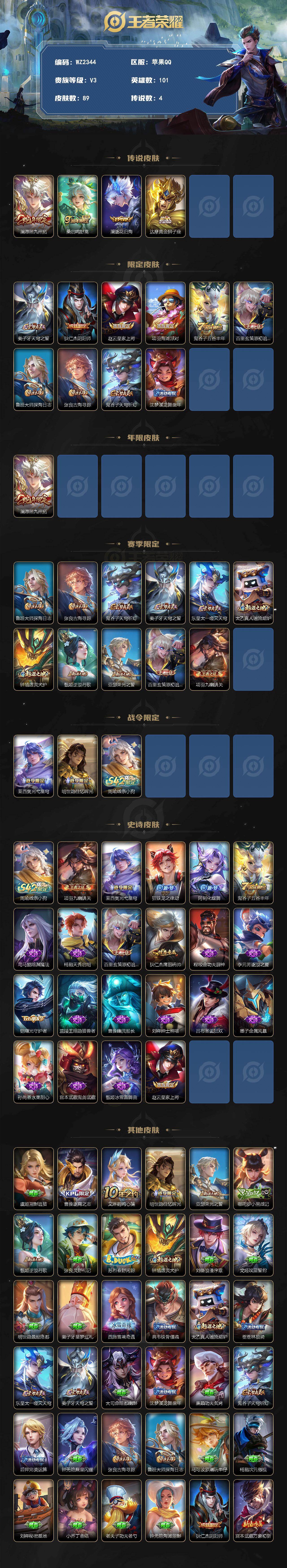[17830432]苹果Q-89皮肤-4传说-21史诗 【传说皮肤】:澜愿照九州拓,桑启鸣野蒿,澜逐花归海,达摩黄金狮子座 【限定皮肤】:姜子牙天穹之誓,狄仁杰阴阳师,赵云皇家上将,项羽海滩派对,鬼谷子五谷丰年,百里玄策原初追逐者,鲁班大师探海日志,张良古海寻踪,鬼谷子天穹祈灯,沈梦溪龙舞盛年 【年限皮肤】:澜愿照九州拓 【赛季限定】:鲁班大师探海日志,张良古海寻踪,鬼谷子天穹祈灯,姜子牙天穹之誓,东皇太一噬灭天穹,太乙真人谧流熔炉,钟馗虚灵犬护,甄姬逆浪荇歌,亚瑟荣光之誓,百里玄策原初追逐者,项羽九幽镇关 【战令限定】:莱西奥光弋星穹,明世隐往忆晖光,周瑜线条小狗 【史诗皮肤】:周瑜线条小狗,项羽九幽镇关,莱西奥光弋星穹,狂铁龙之律动,阿轲化蝶舞,鬼谷子五谷丰年,司马懿暗渊魔法,杨戬天秀启明,百里玄策原初追逐者,狄仁杰鹰眼统帅,程咬金功夫厨神,李元芳逐浪之夏,铠曙光守护者,兰陵王暗隐猎兽者,曹操幽灵船长,刘禅绅士熊喵,吕布圣诞狂欢,墨子金属风暴,孙尚香水果甜心,宫本武藏鬼剑武藏,甄姬冰雪圆舞曲,赵云皇家上将 【其他皮肤】:虞姬溯影追猎,曹操逐霄之志,艾琳鹤鸣心笺,明世隐往忆晖光,亚瑟荣光之誓,哪吒罗小黑战记,甄姬逆浪荇歌,张良灵野札记,苏烈春野闲踪,钟馗虚灵犬护,刘备浪漫序章,戈娅玫蓝誓约,明世隐景韶洛都,姜子牙星梦巡礼,西施雪境奇遇,典韦铁骨偃魂,太乙真人谧流熔炉,苍苍林狼骑,东皇太一噬灭天穹,姜子牙天穹之誓,大司命暗都幽影,沈梦溪龙舞盛年,廉颇功夫炙烤,鬼谷子天穹祈灯,后羿完美运算,钟无艳聚星闪耀,张良古海寻踪,鲁班大师探海日志,马可波罗潮玩牛仔,杨戬次元傲视,刘禅秘密基地,小乔丁香结,老夫子功夫老勺,钟无艳海滩丽影,狄仁杰阴阳师,宫本武藏万象初新,张飞五福同心,达摩拳王,亚瑟死亡骑士,典韦黄金武士,妲己少女阿狸,扁鹊化身博士,白起白色死神,赵云忍炎影,韩信街头霸王,韩信教廷特使,项羽海滩派对,司空震启蛰,澜孤猎,李信灼热之刃,司马懿魇语军师,弈星踏雪寻梅,明世隐占星师,铠龙域领主,东皇太一东海龙王,大乔伊势巫女,诸葛亮星航指挥官,马可波罗激情绿茵,夏侯惇战争骑士,后羿精灵王,孙悟空西部大镖客,曹操超能战警,老夫子潮流仙人 【营地ID】:1746152565