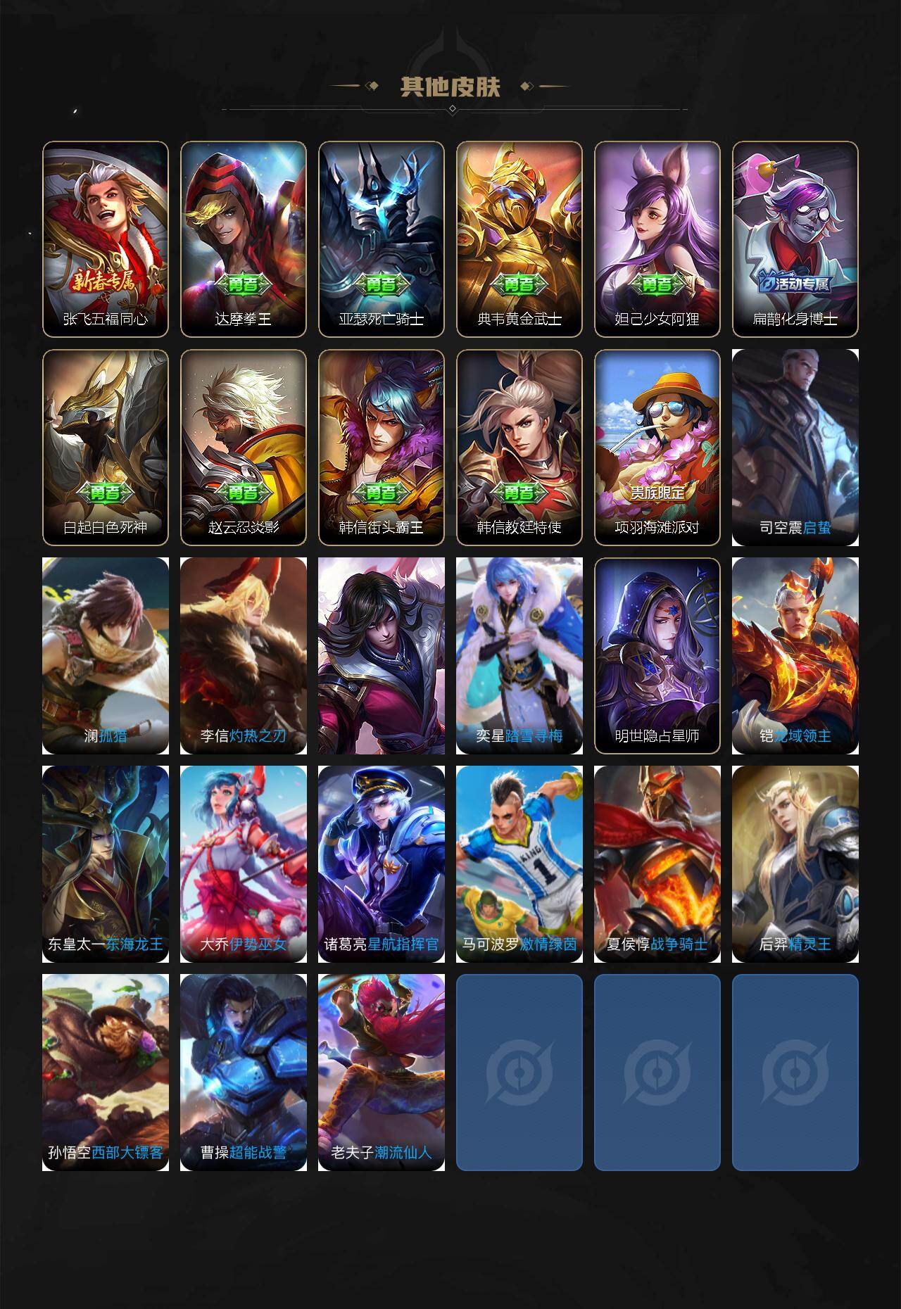 【其他皮肤】:虞姬溯影追猎,曹操逐霄之志,艾琳鹤鸣心笺,明世隐往忆晖光,亚瑟荣光之誓,哪吒罗小黑战记,甄姬逆浪荇歌,张良灵野札记,苏烈春野闲踪,钟馗虚灵犬护,刘备浪漫序章,戈娅玫蓝誓约,明世隐景韶洛都,姜子牙星梦巡礼,西施雪境奇遇,典韦铁骨偃魂,太乙真人谧流熔炉,苍苍林狼骑,东皇太一噬灭天穹,姜子牙天穹之誓,大司命暗都幽影,沈梦溪龙舞盛年,廉颇功夫炙烤,鬼谷子天穹祈灯,后羿完美运算,钟无艳聚星闪耀,张良古海寻踪,鲁班大师探海日志,马可波罗潮玩牛仔,杨戬次元傲视,刘禅秘密基地,小乔丁香结,老夫子功夫老勺,钟无艳海滩丽影,狄仁杰阴阳师,宫本武藏万象初新,张飞五福同心,达摩拳王,亚瑟死亡骑士,典韦黄金武士,妲己少女阿狸,扁鹊化身博士,白起白色死神,赵云忍炎影,韩信街头霸王,韩信教廷特使,项羽海滩派对,司空震启蛰,澜孤猎,李信灼热之刃,司马懿魇语军师,弈星踏雪寻梅,明世隐占星师,铠龙域领主,东皇太一东海龙王,大乔伊势巫女,诸葛亮星航指挥官,马可波罗激情绿茵,夏侯惇战争骑士,后羿精灵王,孙悟空西部大镖客,曹操超能战警,老夫子潮流仙人