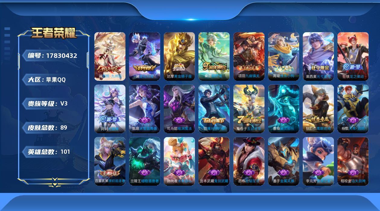 - [11553670]V7 1典藏 10传说 123英雄 216皮肤 可修改实名 优质装备:神鉴启示录,黄金射手座,云鹰飞将(小将军),久胜战神,一念神魔,零号·赤焰,时之恋人-刘备(电焊工),无双飞将 珍宝阁皮:胡桃夹子,女武神 限定皮:愿照·九州拓(澜年限),愿照·岁时盈(虞姬年限),愿照·众生和(妲己年限),神威(电光马子),高山流水,五谷丰年,梁祝,烈魂,逐梦之音,李小龙,逐梦之影,孙行者,山海·玄木吟(马可年限) 史诗皮:鸭鸭历险记-刘禅,化蝶舞,龙之律动,雪豹·霜爪,石田雨龙,茶境仙,百相守梦-百里守约,百相守梦-黄忠,紫霞仙子,白龙吟,黄金分割率,特工魅影,千年之狐,电玩·爆裂旋风,蒙恬荣光圣徽,偶像歌手,龙骑士(小龙虾),暗夜猫娘,晚萤,青蛇,末日机甲-吕布,猫狗日记-孙策,时之恋人-孙尚香,节奏热浪,修罗,女仆咖啡,水果甜心,星夜王子,心灵骇客,时之奇旅-安琪拉,德古拉伯爵,暗隐猎兽者,鬼剑武藏,心灵战警,乐园奇幻夜,地狱岩魂,缤纷独角兽,曙光守护者,热力回旋,金属风暴,圣诞狂欢,圣诞恋歌,鹰眼统帅,魅力维加斯,黎明之约,无心