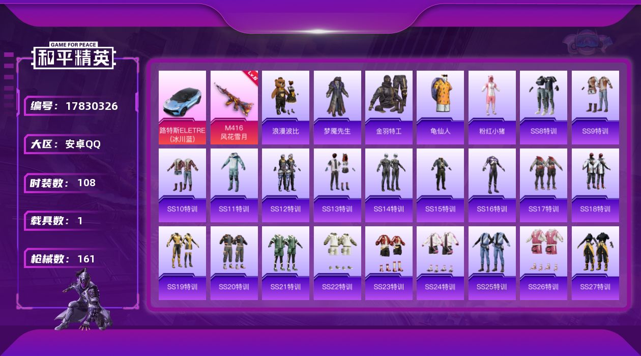 [17830326]【特价出售/店主推荐】安卓 手Q-0粉装-1特效枪-1载具-1粉色飞行器-46843热力值-5王牌印记-108套装-161枪皮 【热门品类】:套装-金羽特工,套装-龟仙人,套装-浪漫波比,套装-粉红小猪 【粉色枪皮等级】:M416-风花雪月(六级) 【粉色载具】:路特斯ELETRE(冰川蓝) 【粉色枪皮】:M416-风花雪月 【粉色飞行器】:古堡领主飞行器 【粉色降落伞】:深海曼妙降落伞,快乐主宰降落伞,至尊龙雀降落伞,古堡领主降落伞,繁花小夜曲降落伞,烈焰拳霸降落伞,洛神天依降落伞,绒雪飘舞降落伞 【稀有套装】:套装-龟仙人 【稀有枪皮】:AKM-冰凉西瓜,AKM-夜灯,AKM-彩虹符号,AKM-灼热熔岩,AKM-玉龙,AKM-生命誓言,AKM-萌趣颜团子,AKM-虎虎生威,AKM-龙的传人,M16A4-幻世战舞者,M16A4-机械英豪,M16A4-甜心亚梦,SCAR-L-炫彩节奏,SCAR-L-玉兔迎春,SCAR-L-红色方程式,SCAR-L-雷霆特警,SCAR-L-黄金龙骨,M416-夜灯,M416-糯团青竹,M416-红色方程式,M416-蓝色火焰,GROZA-异彩先驱,GROZA-彩虹符号,GROZA-生命誓言,GROZA-田园牧歌,GROZA-蓝莓炮弹,AUG-天降萌叽,AUG-耀粉歌者,AUG-青春冒险家,QBZ-原初圣火,QBZ-彩虹符号,QBZ-神秘黑猫,M762-拳皇97,M762-牛气冲天,M762-瑞龙福将,Mk47-洛神天依,Mk47-青春冒险家,G36C-不夜海上花,G36C-时空追击者,G36C-金风玉露,AC-VAL-天降萌叽,AC-VAL-甜心亚梦,蜜獾-天降萌叽,蜜獾-娇憨猪猪,UZI-众神之王,UZI-天降萌叽,UZI-娇憨猪猪,UZI-炫彩节奏,UZI-红色方程式,UMP45-夜灯,UMP45-时空追击者,UMP45-生命誓言,UMP45-蓝色火焰,UMP45-诡娃娃,Vector-夜灯,Vector-彩虹符号,Vector-生命誓言,Vector-田园牧歌,汤姆逊-勇闯险境,汤姆逊-异彩先驱,汤姆逊-耀粉歌者,野牛-夜灯,野牛-机械英豪,野牛-青春冒险家,MP5K-众神之王,MP5K-异彩先驱,MP5K-蓝莓炮弹,P90-飞驰魅影,Kar98K-勇闯险境,Kar98K-红色方程式,M24-众神之王,AWM-不夜海上花,SK