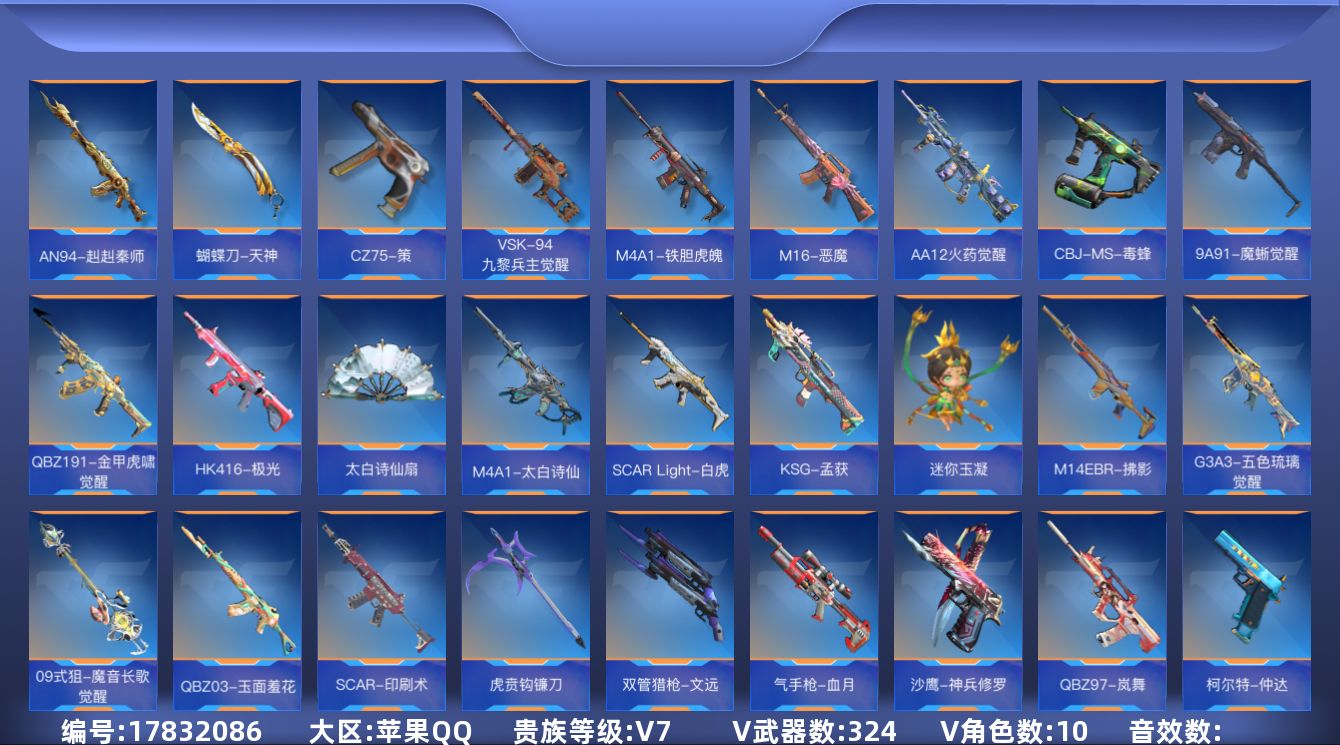 [17832086]10英雄角色数-314英雄武器数 【王者系列】:王者之影,王者之心,王者之迹,王者之蝶,王者之兽,王者之狱,王者之魂,王者之霆,王者之业,王者之誉 【热门武器】:KSG-孟获,81式-光明之神,M4A1-仲达,AK47-常胜,M4A1-星象,AK47-游骑兵,M4A1-游骑兵,TAC-慈,M200-幻神,AWM-游骑兵,VEPR12-宙斯,COP 357-赤龙,黄金COP 357,COP 357-A,COP 357-绚樱*4,CZS2-仲康,AN94-盖 【角色】:幽灵刀锋-觉醒,樱,瞳,关小雨,职场灵狐-赛事经理,零-水下丽影,炽天使-X,零-新生,步练师,罗峰&巴巴塔-X 【英雄武器】:AK47-无影,AK47-火麒麟,AK47-麒麟,AK47-角斗士,AK47-耀金伯爵,AK47-游骑兵,AK47-常胜,AK47-樱斗士-二觉,AK47-竞技战魂,AK47-猩红传说,AK47-燎天净火,AK47-雷麒麟,AK47-心动次元,AK47-血武士,AK47-华夏传说,AK47-黑鲨,AK47-木兰,AK47-谜城烟火*2,M4A1-雷神*2,M4A1-黑骑士,M4A1-黑龙,M4A1-死神*2,M4A1-玫瑰精灵,M4A1-天使,M4A1-游骑兵,M4A1-枪娘,M4A1-星象,M4A1-雷神-萝拉,M4A1-龙血,M4A1-仲达,M4A1-机械迷城,M4A1-破空冰刃,M4A1-心动次元,M4A1-运输船*2,M4A1-猎神,M4A1-夏清,M4A1-太白诗仙*2,M4A1-铁胆虎魄,SCAR-幽暗骑士,SCAR Light-白虎,SCAR-探星者,SCAR-印刷术,SCAR-心动PICK,剑齿虎-炫彩,AN94-四凶觉醒,AN94-赳赳秦师,AN94-盖,AUG-机械纪元,9A91-天神,9A91-魔蜥觉醒,M14EBR-天神,M14EBR-拂影,M14EBR-葫芦山庄*2,M16-恶魔,AK12-天启,QBZ03-湮灭*2,QBZ03-金色蔷薇,QBZ03-死神*2,QBZ03-玉面羞花,HK416-极光,HK417-炎龙铠甲,81式-光明之神,MK47-云舞,G3A3-五色琉璃觉醒,G3A3-衍神兵*2,QBZ97-岚舞,QBZ97-浩瀚征途,QBZ191-金甲虎啸觉醒,QBZ191-封神榜,AWM-天龙,AWM-游骑兵,AWM-指南针,巴雷特-毁灭*2,