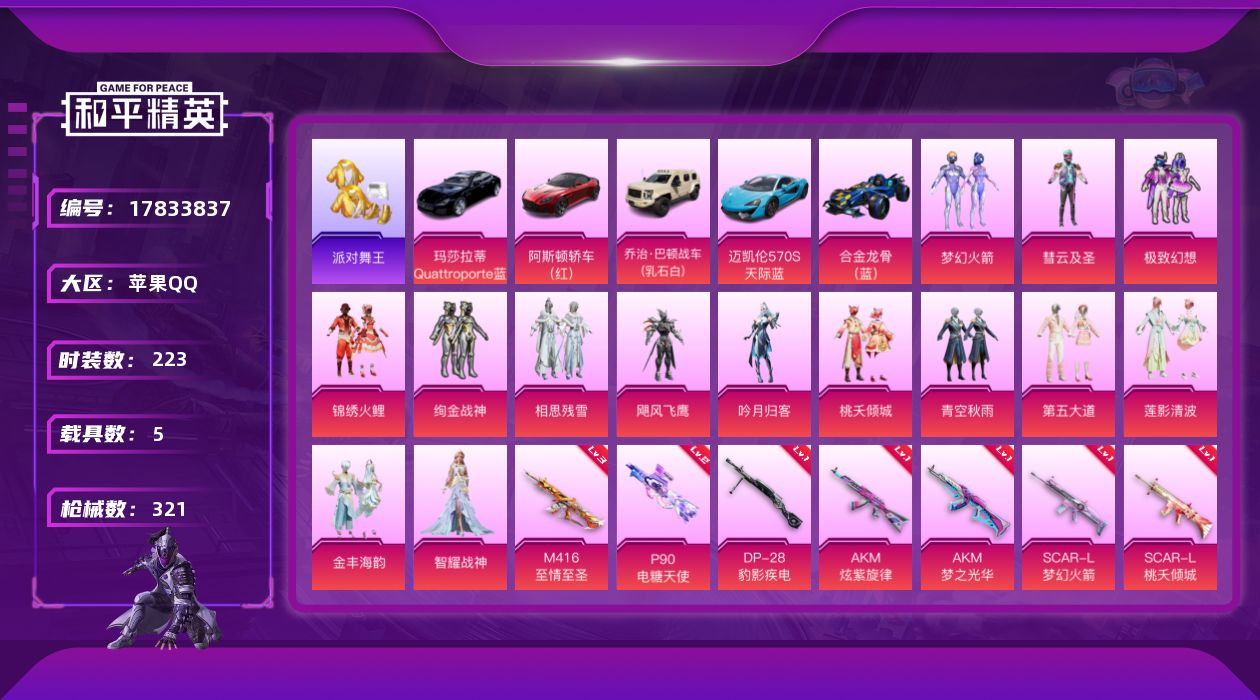 [17833837]苹果 手Q-14粉装-18特效枪-5载具-4粉色飞行器-112659热力值-12王牌印记-223套装-321枪皮