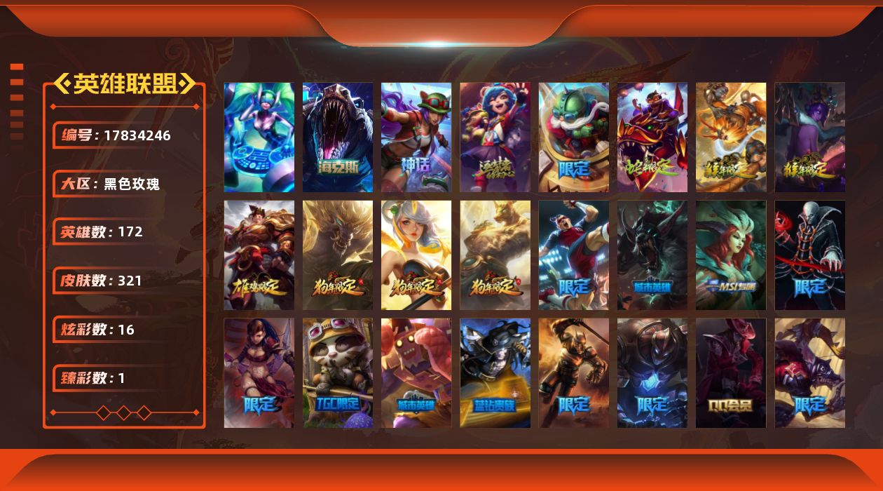 [17834246]【店主推荐捡漏号】青铜段位-172英雄-321皮肤-16炫彩-1终极-3神话-55限定-32传说-80史诗