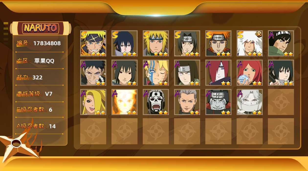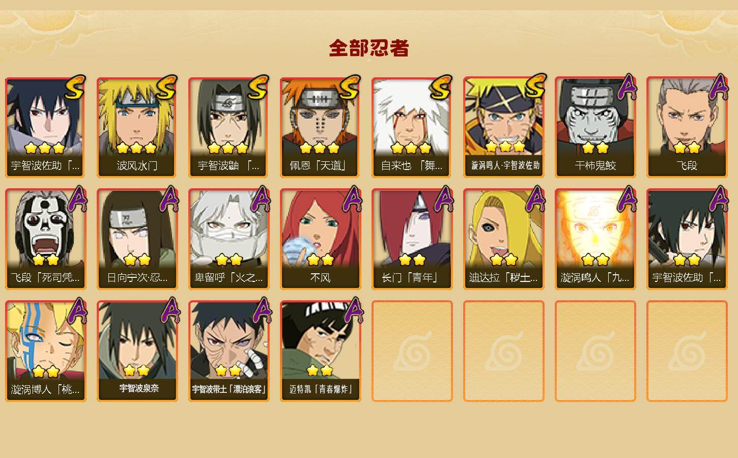 【S级忍者】:宇智波鼬「须佐能乎」(3星),自来也「舞之豪杰」(3星),波风水门(3星),佩恩「天道」(3星),宇智波佐助「永恒万花筒」(3星),漩涡鸣人·宇智波佐助(3星)