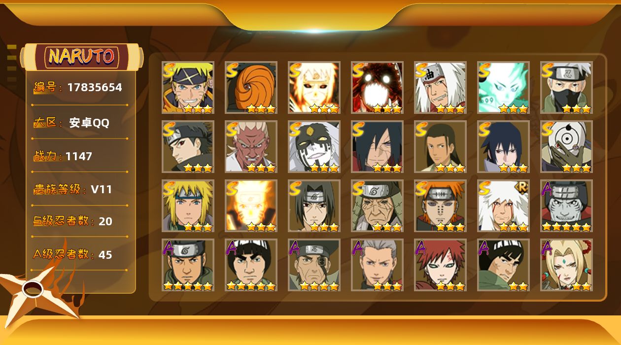 - [17491937]16S级忍者数-43A级忍者数 【S级忍者】:波风水门「秽土转生」(3星),宇智波斑「秽土转生·解」(3星),春野樱「忍界大战」(3星),宇智波鼬「须佐能乎」(3星),自来也「舞之豪杰」(3星),大蛇丸(3星),波风水门(3星),漩涡鸣人「九喇嘛连结」(3星),迈特凯「死门」(3星),佩恩「天道」(3星),宇智波佐助「永恒万花筒」(3星),漩涡鸣人「暴怒·第六尾」(3星),波风水门「九喇嘛连结」(3星),宇智波斑「五影会谈」(3星),漩涡鸣人·宇智波佐助(3星),宇智波带土「十尾人柱力」(3星) 【A级忍者】:艾「青年」(2星),长门「青年」(2星),达鲁伊「博人传」(2星),迪达拉「秽土转生」(2星),大蛇丸「晓」(2星),大蛇丸「新春限定」(2星),飞段(3星),飞段「死司凭血」(2星),干柿鬼鲛(5星),漩涡博人「桃式显现」(2星),机械鸣人「初始形态」(2星),迈特凯(5星),旗木卡卡西「元气夏日」(2星),旗木卡卡西「幻之真容」(2星),桃地再不斩(2星),桃地再不斩「秽土转生」(2星),我爱罗「疾风传」(3星),我爱罗「忍界大战」(2星),蝎(2星),小南「神驹佑将」(2星),猿飞阿斯玛(5星),宇智波鼬(2星),宇智波鼬「新春限定」(2星),宇智波鼬「夏日限定」(2星),宇智波佐助「疾风传咒印」(2星),宇智波佐助「万花筒写轮眼」(2星),宇智波佐助「侠隐江湖」(2星),药师兜「半蛇斗篷」(2星),照美冥「五代目水影」(2星),日向宁次「忍界大战」(2星),长十郎「六代目水影」(2星),神秘面具男「忍者之路」(2星),佩恩·六道「漂泊浪客」(2星),李洛克「忍界大战」(2星),秋道丁次「忍界大战」(2星),千代「近松十人卫」(2星),神农「羁绊」(2星),土台「忍界大战」(2星),宇智波泉奈(2星),不动(2星),大野木「侠隐江湖」(2星),巳月「仙人模式」(2星),迈特凯「青春爆炸」(2星)
