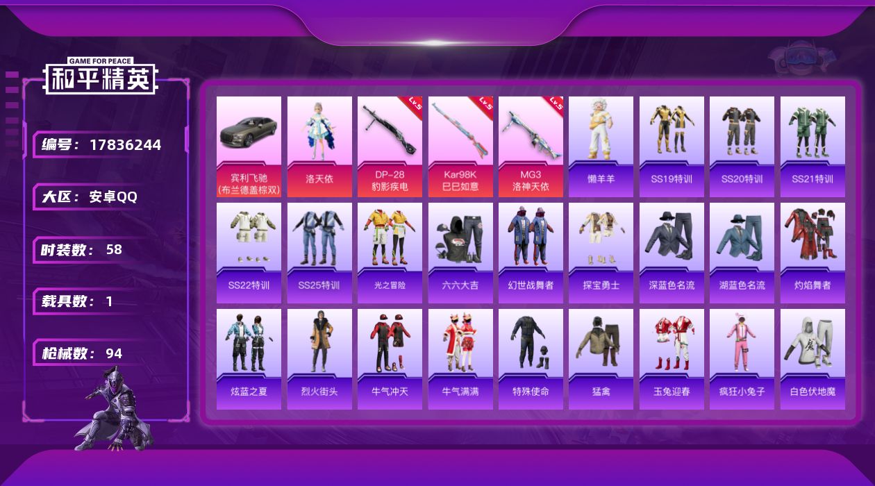 [17836244]安卓 手Q-1粉装-4特效枪-1载具-1粉色飞行器-23920热力值-2王牌印记-58套装-94枪皮【粉色套装】:角色-洛天依【粉色枪皮等级】:Kar98K-巳巳如意(五级),Mk14-福马献瑞(一级),DP-28-豹影疾电(五级),MG3-洛神天依(五级)【粉色载具】:宾利飞驰(布罗德盖棕双色)【粉色枪皮】:Kar98K-巳巳如意,Mk14-福马献瑞,DP-28-豹影疾电,MG3-洛神天依【粉色飞行器】:炫彩糖果飞行器