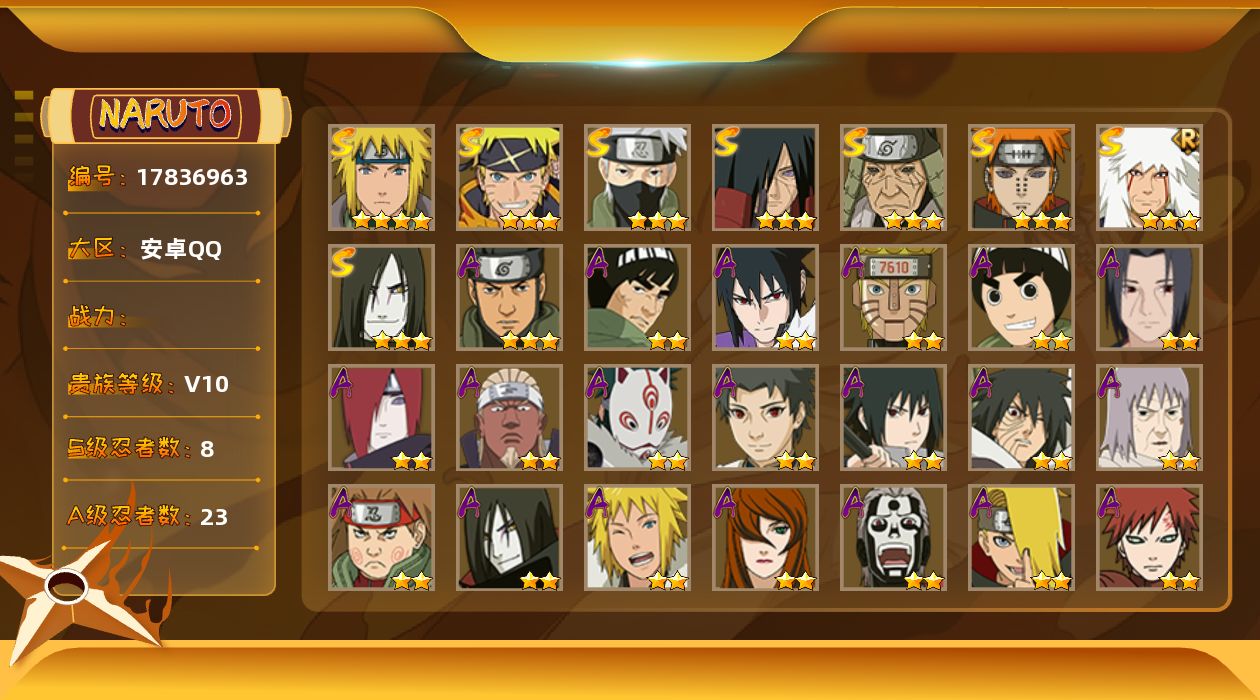 【S级忍者】:猿飞日斩「秽土转生」(3星),宇智波斑「秽土转生」(3星),旗木卡卡西「须佐能乎」(3星),自来也「舞之豪杰」(3星),大蛇丸(3星),波风水门(4星),佩恩「天道」(3星),漩涡鸣人·宇智波佐助(3星)