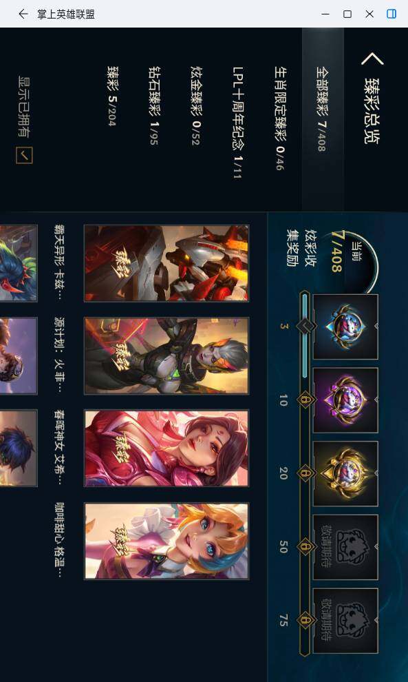 【臻彩皮肤】:无畏骑士瑟庄妮赤子初心,神龙尊者圣龙李青龙腾云起,源计划火菲奥娜惩戒,霸天异形卡兹克刹那银光,灵魂莲华锐雯流火,春晖神女艾希玉露金风,咖啡甜心格温酒醉樱桃