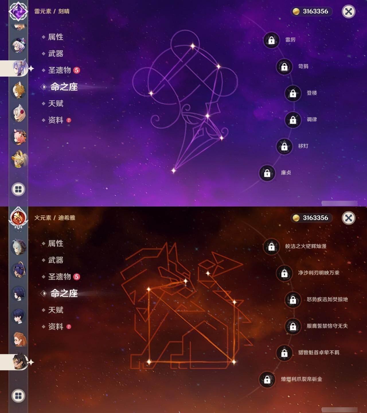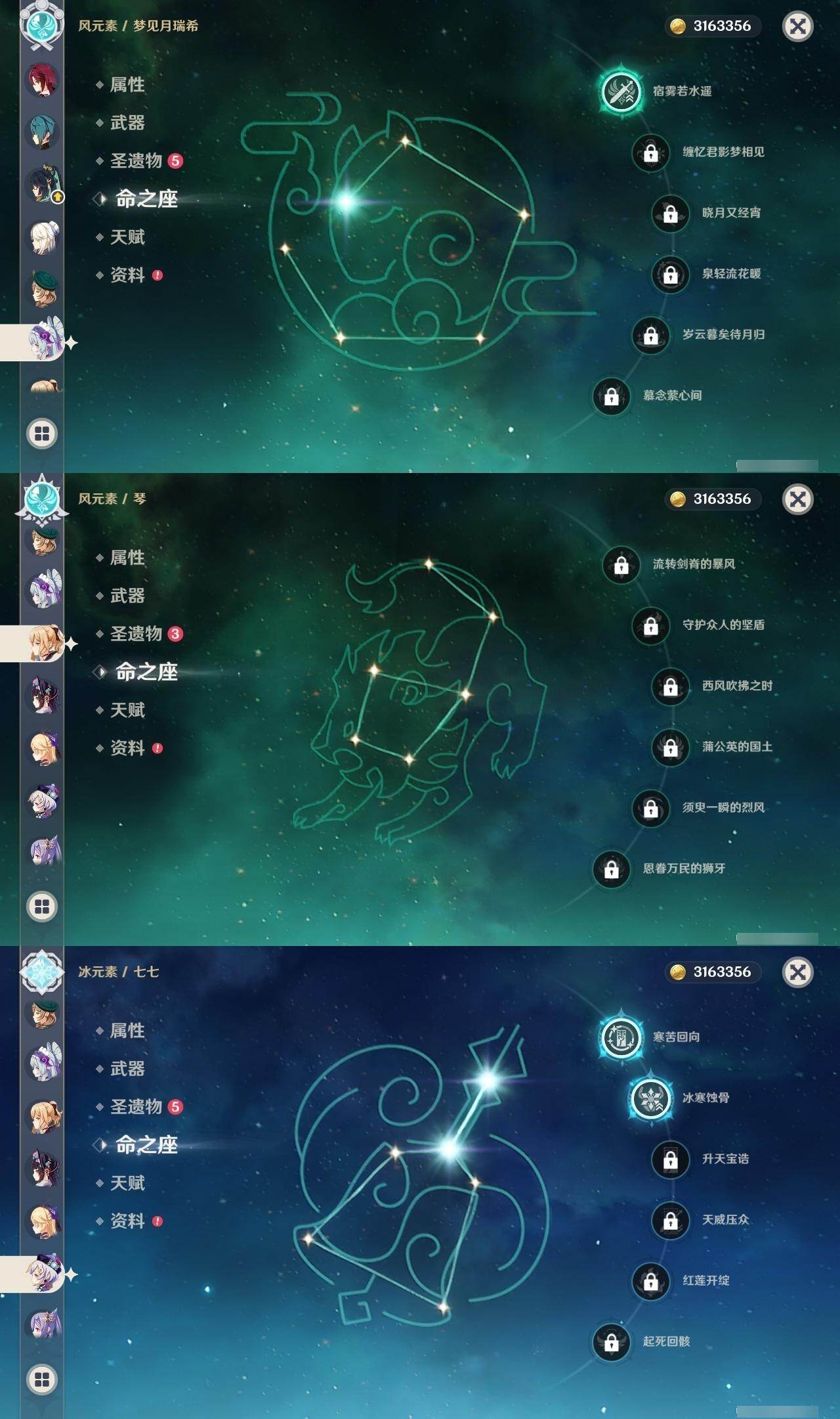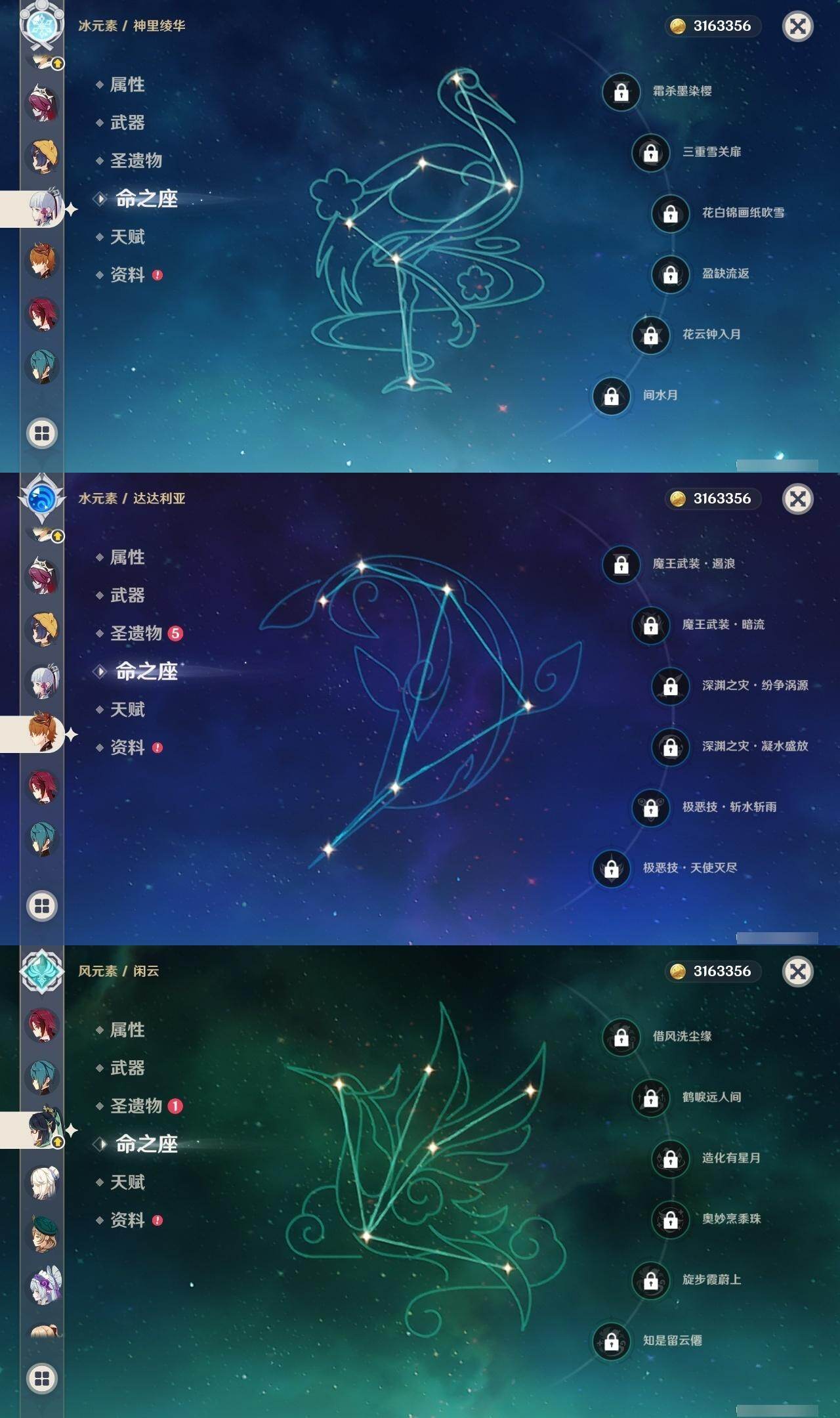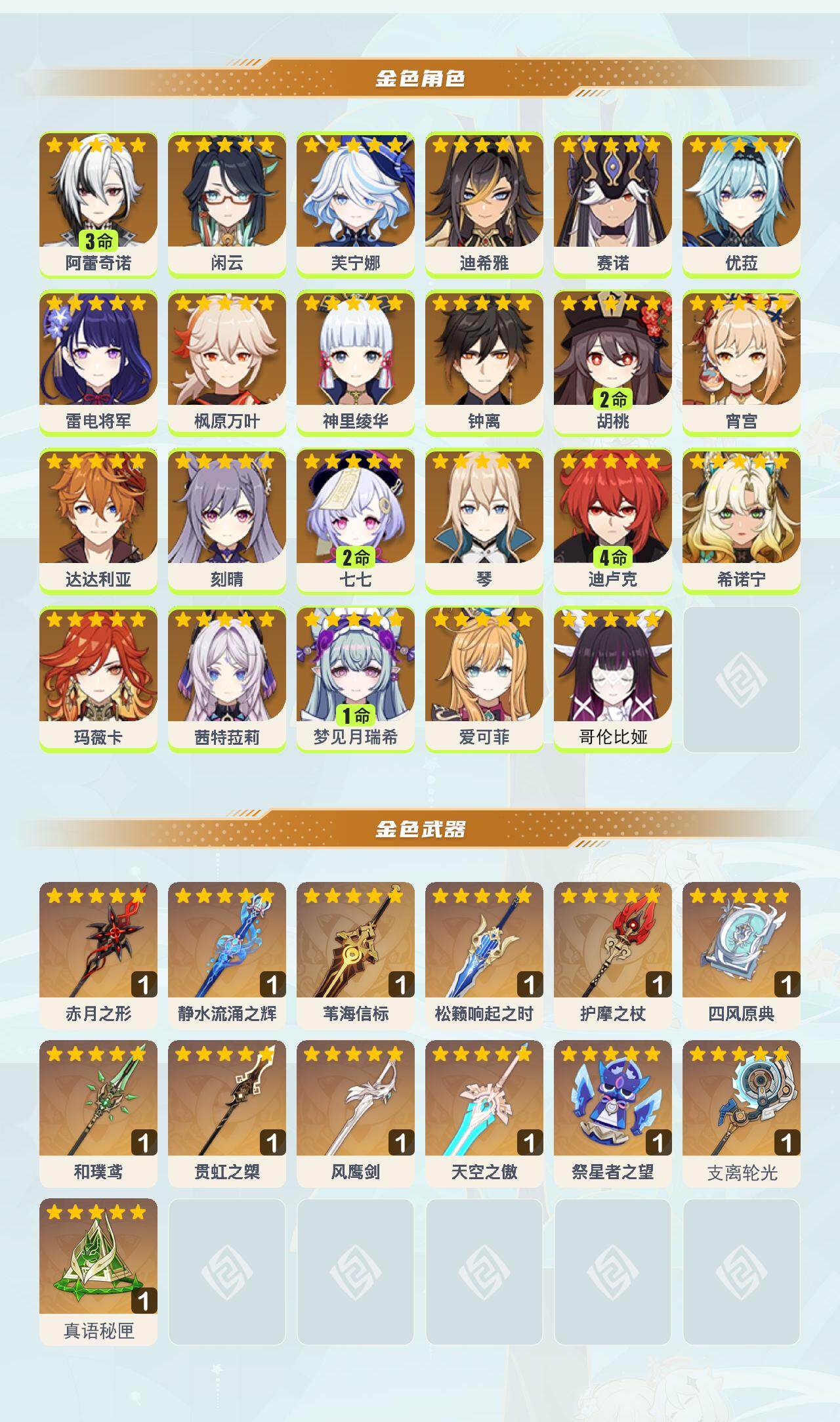 3命阿蕾奇诺,0命闲云,0命芙宁娜,0命迪希雅,0命赛诺,0命优菈,0命雷电将军,0命枫原万叶,0命神里绫华,0命钟离,2命胡桃,0命宵宫,0命达达利亚,0命刻晴,2命七七,0命琴,4命迪卢克,0命希诺宁,0命玛薇卡,0命茜特菈莉,1命梦见月瑞希,0命爱可菲,0命哥伦比娅,精1赤月之形,精1静水流涌之辉,精1苇海信标,精1松籁响起之时,精1护摩之杖,精1四风原典,精1和璞鸢,精1贯虹之槊,精1风鹰剑,精1天空之傲,精1祭星者之望,精1支离轮光,精1真语秘匣