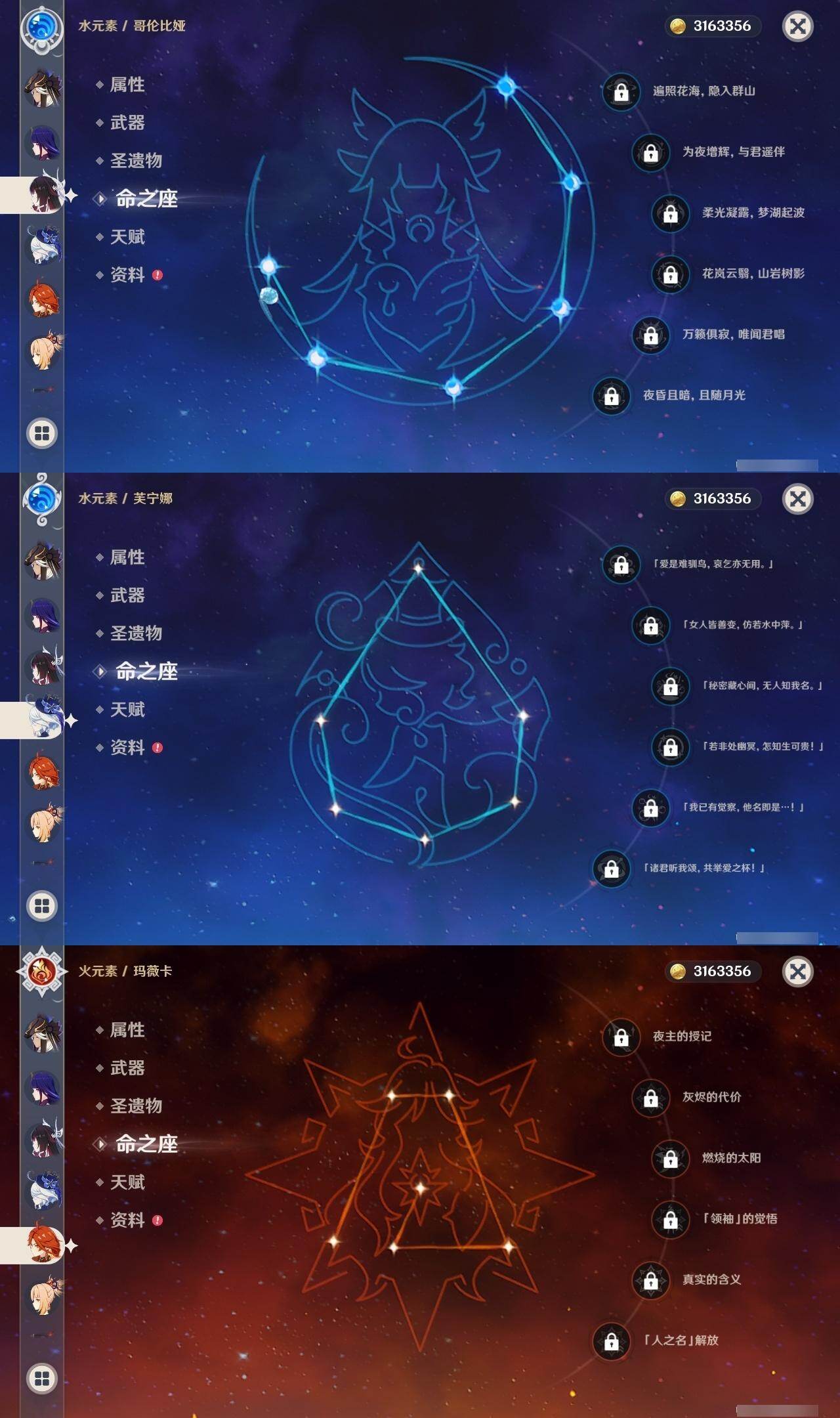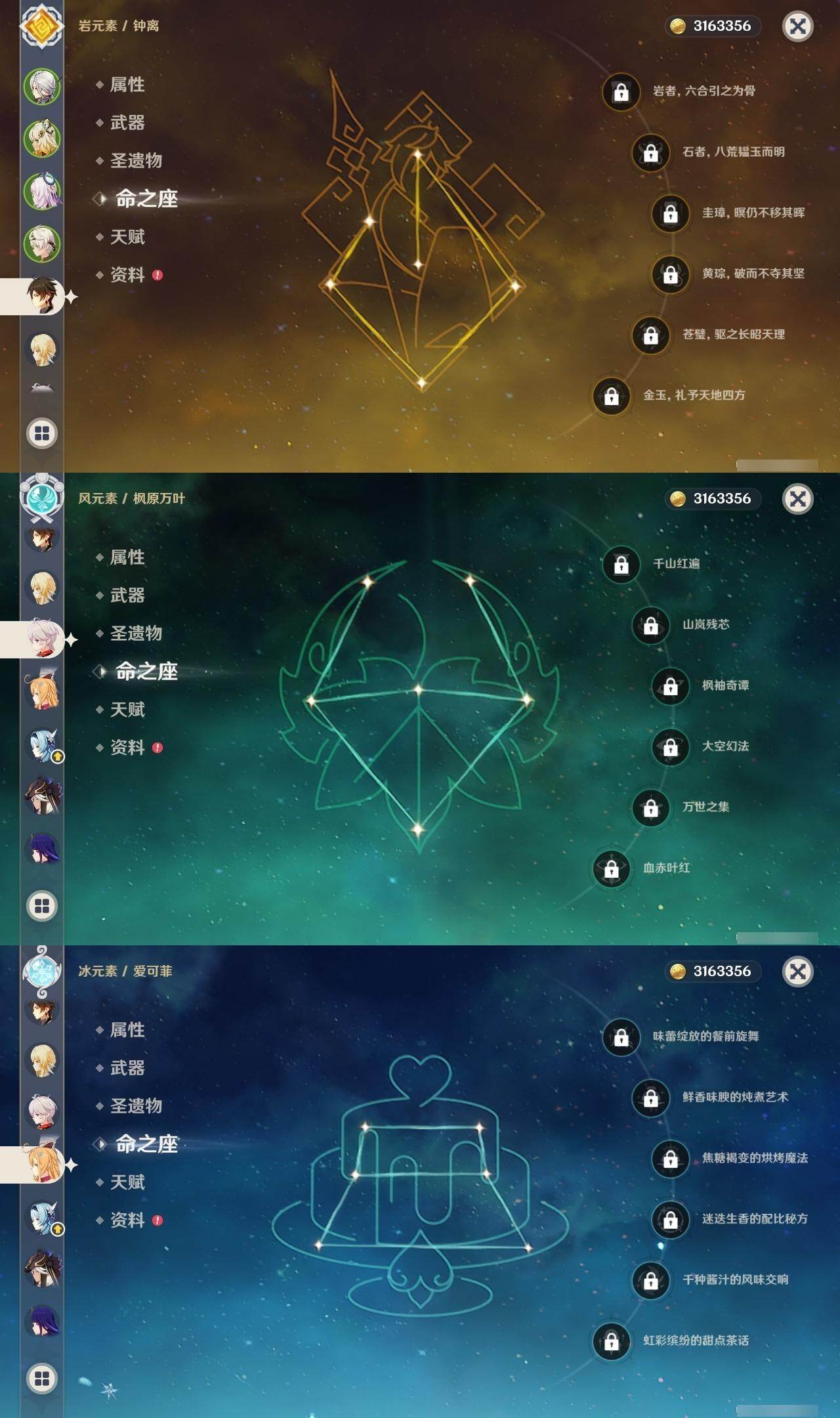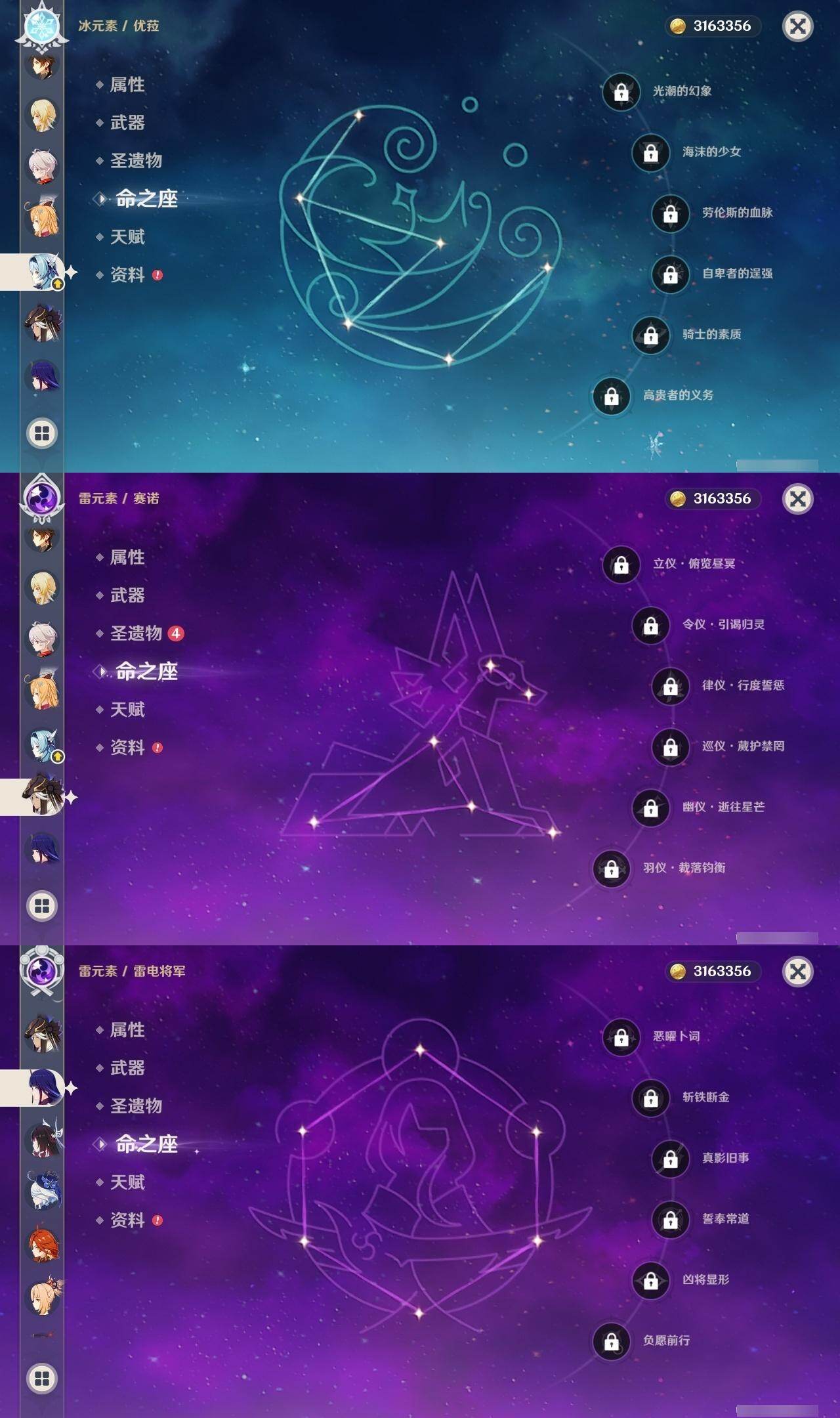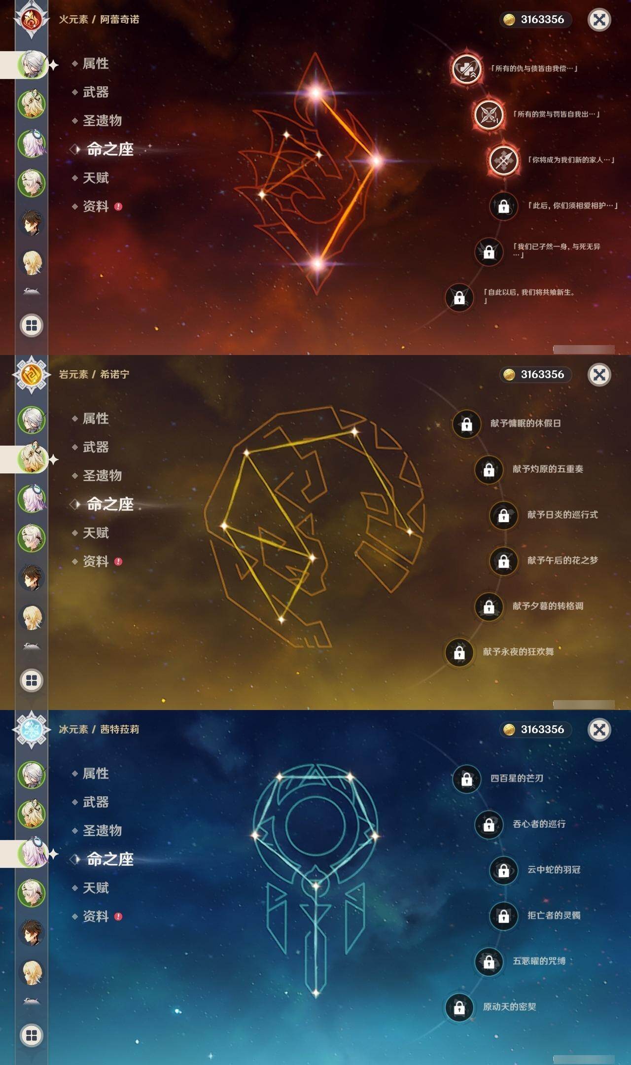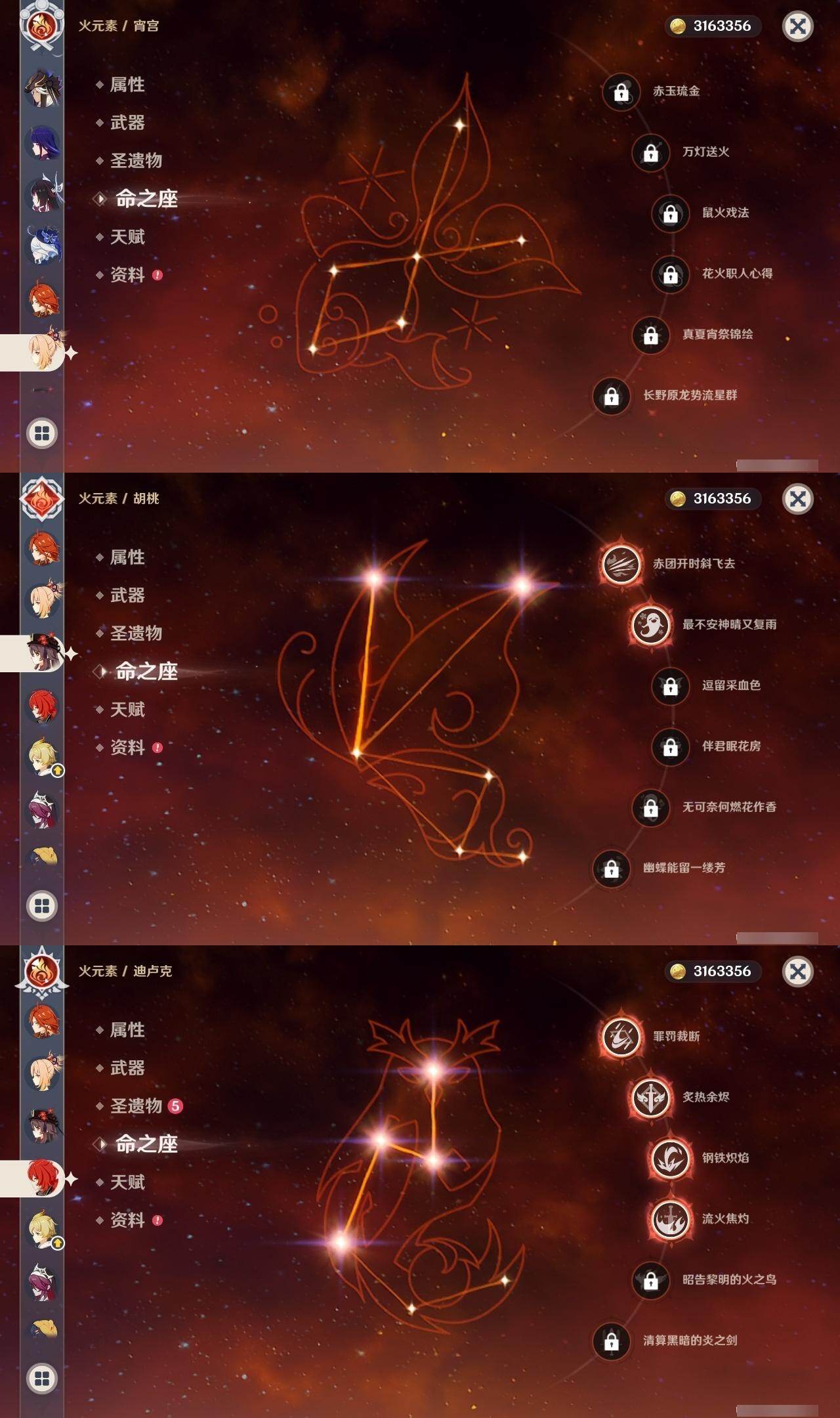 3命阿蕾奇诺,0命闲云,0命芙宁娜,0命迪希雅,0命赛诺,0命优菈,0命雷电将军,0命枫原万叶,0命神里绫华,0命钟离,2命胡桃,0命宵宫,0命达达利亚,0命刻晴,2命七七,0命琴,4命迪卢克,0命希诺宁,0命玛薇卡,0命茜特菈莉,1命梦见月瑞希,0命爱可菲,0命哥伦比娅,精1赤月之形,精1静水流涌之辉,精1苇海信标,精1松籁响起之时,精1护摩之杖,精1四风原典,精1和璞鸢,精1贯虹之槊,精1风鹰剑,精1天空之傲,精1祭星者之望,精1支离轮光,精1真语秘匣