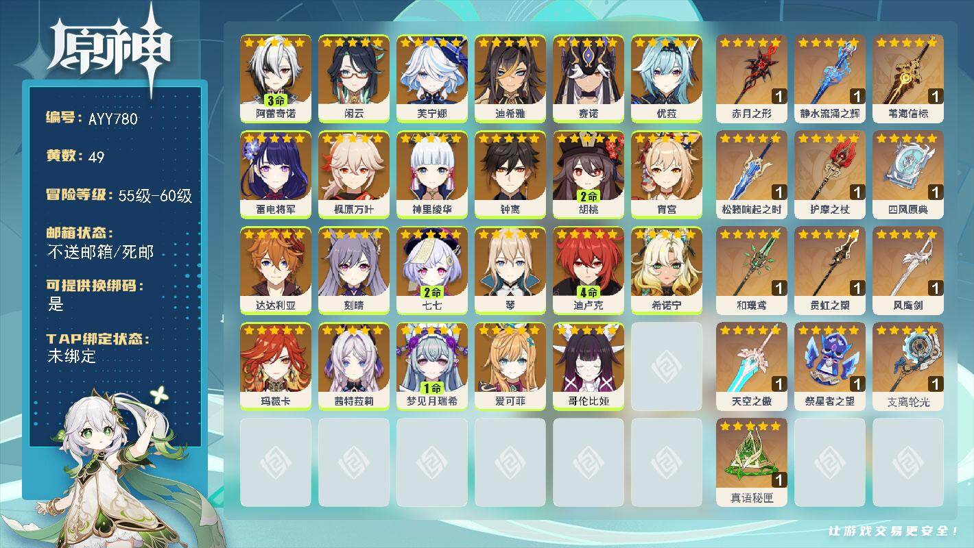 [17837299]60级/49黄/女主/23个五星角色/14个五星武器 3命阿蕾奇诺,0命闲云,0命芙宁娜,0命迪希雅,0命赛诺,0命优菈,0命雷电将军,0命枫原万叶,0命神里绫华,0命钟离,2命胡桃,0命宵宫,0命达达利亚,0命刻晴,2命七七,0命琴,4命迪卢克,0命希诺宁,0命玛薇卡,0命茜特菈莉,1命梦见月瑞希,0命爱可菲,0命哥伦比娅,精1赤月之形,精1静水流涌之辉,精1苇海信标,精1松籁响起之时,精1护摩之杖,精1四风原典,精1和璞鸢,精1贯虹之槊,精1风鹰剑,精1天空之傲,精1祭星者之望,精1支离轮光,精1真语秘匣