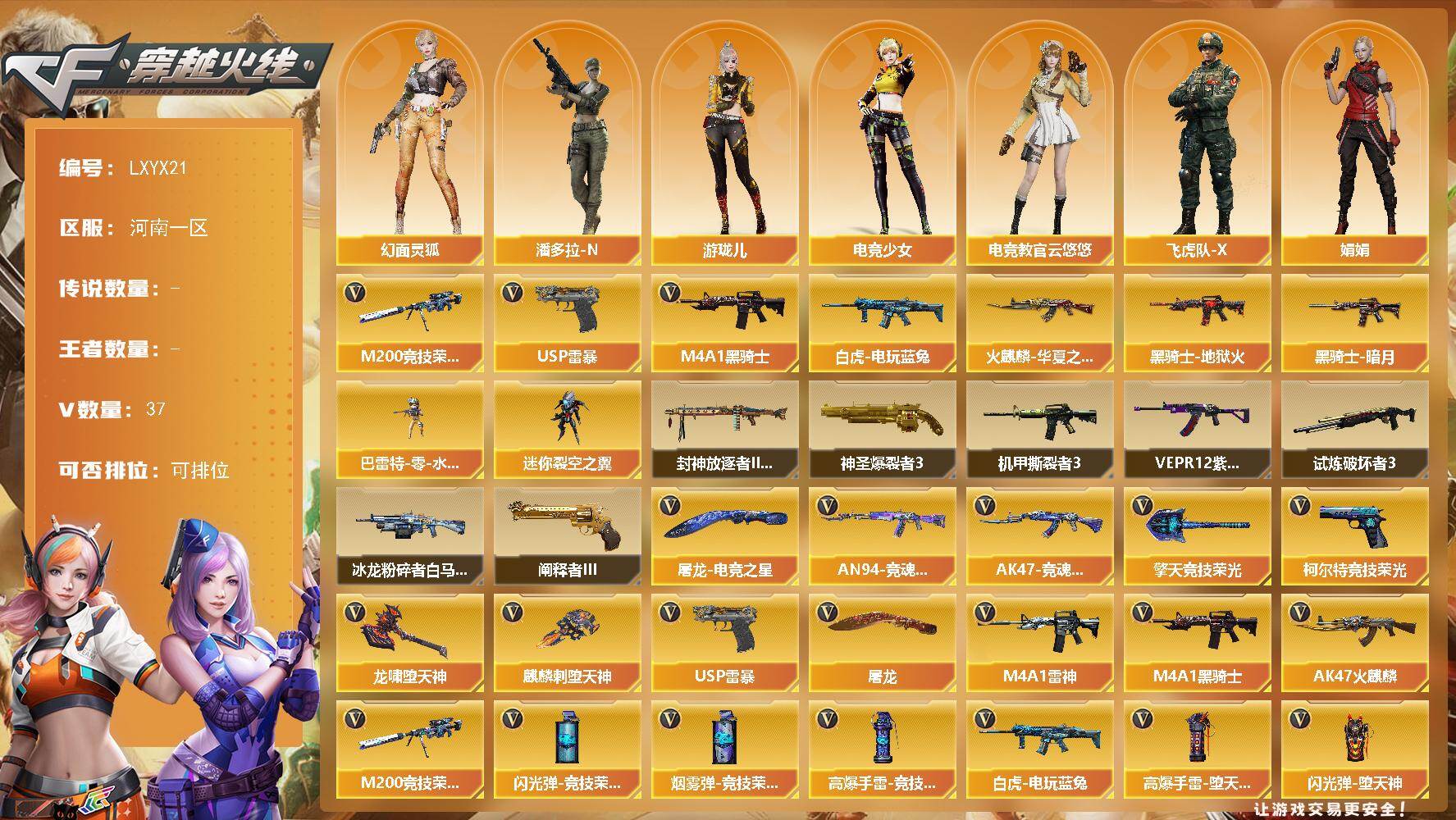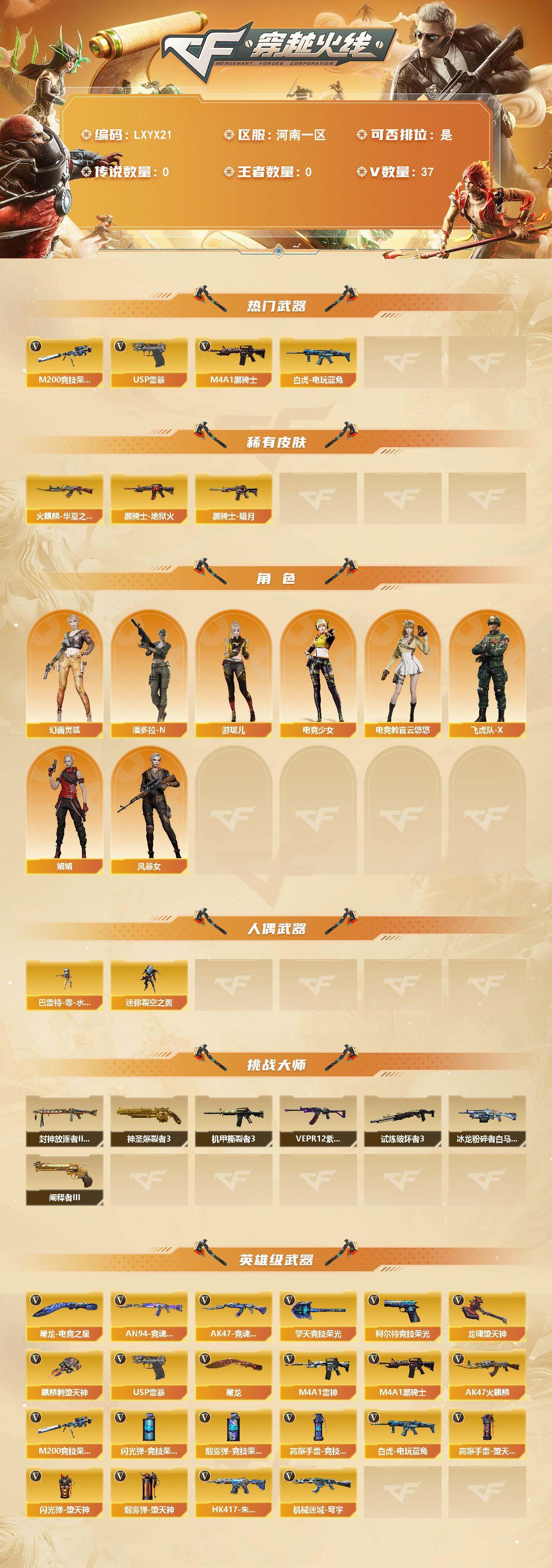 [17837616]【LXYX21】35V/100级/元帅/2英雄/M200-竞技荣光/白虎-电玩蓝兔/M4A1-黑骑士/USP雷暴/火麒麟-华夏之心/黑骑士-暗月/黑骑士-地狱火/电竞教官-云悠悠/幻面灵狐/电竞少女/飞虎队-X/风暴女/娟娟/游珑儿/潘多拉-N/巴雷特-零-水下丽影/迷你裂空之翼/神圣爆裂者/冰龙粉碎者-白马银枪/机甲撕裂者/试炼破坏者/阐释者/封神放逐者III/VEPR-12-紫魔/AK47-火麒麟/M4A1-雷神/HK417-朱雀-电竞之星/机械迷城-穹宇/柯尔特-竞技荣光/屠龙/麒麟刺-堕天神/擎天-竞技荣光/龙啸-堕天神/屠龙-电竞之星/高爆手雷-堕天神/高爆手雷-竞技荣光/闪光弹-堕天神/闪光弹-竞技荣光/烟雾弹-堕天神/烟雾弹-竞技荣光/AK47-竞魂无影/AN94-竞魂超新星/源·雷神/魂·M4A1-雷神-化蛇/魂·雷神-新春神龙/御·雷神-机甲刑天/雷神-赛博幻想/御·雷神-小白龙/魂·黑骑士-现代金属/源·武圣/源·天龙/魂·裁决-凤灵/源·毁灭/魂·毁灭-神秘黑洞/源·武圣glock/源·擎天-萌杀/魂·龙啸-NICE/魂·龙啸-秦师/BS战队炫彩背包/冰冰企鹅背包/炫彩背包/超级背包/金狐背包/女皇终结者-魔龙之吻/绿色巨人/灵魂忍者/变异宝贝/迷雾幽灵/夺命之镰/防化服/星辰流光-枪王排位/枪王排位28赛季金色流光/枪王排位29赛季金色流光/防弹头盔/防弹衣/C4工具钳/手雷包