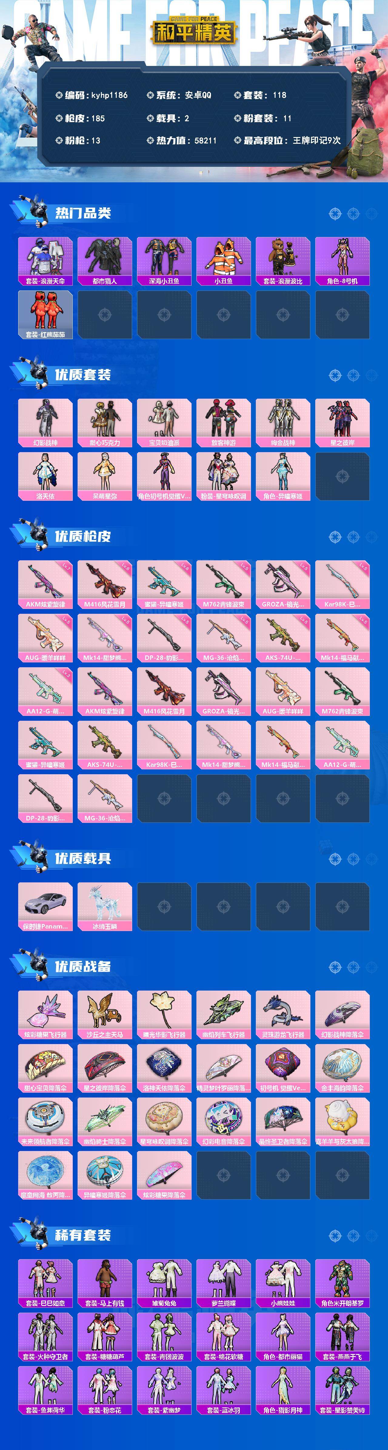 - [17870709]安卓 手Q-1粉装-6特效枪-0载具-2粉色飞行器-51088热力值-7王牌印记-125套装-169枪皮 【热门品类】:套装-浪漫天命,套装-都市猎人,套装-派对舞王,套装-深海小丑鱼,角色-8号机 【粉色套装】:角色-荧海星豚 【粉色枪皮等级】:SCAR-L-纯梦嫁纱(七级),M416-超新星(三级),M416-电玩时刻(五级),UMP45-萌骑冒险(五级),Kar98K-巳巳如意(五级),DP-28-豹影疾电(五级) 【粉色枪皮】:SCAR-L-纯梦嫁纱,M416-超新星,M416-电玩时刻,UMP45-萌骑冒险,Kar98K-巳巳如意,DP-28-豹影疾电 【粉色飞行器】:炫彩糖果飞行器,星夜魔法师飞行翼 【粉色降落伞】:绝对恒星降落伞,梦幻火箭降落伞,星之彼岸降落伞,暗夜鎏金降落伞,精灵梦叶罗丽降落伞,晶梦幻蝶降落伞,星穹咏叹调降落伞,喜羊羊与灰太狼降落伞,炫彩糖果降落伞 【稀有套装】:角色-甜心蒙太奇,套装-雪国风尚,套装-炫彩糖果,套装-糖糖葫芦,套装-青团波波,套装-黑曜寓言,套装-燕燕于飞,套装-鱼渊荷华,角色-海琴烟,套装-晶灵使者,套装-晶辉守护,套装-粉恋花,套装-紫幽梦,套装-蓝冰羽,套装-彩虹兔,套装-云朵鹅,套装-雪绒豹,角色-乐音,套装-蜜露汐语,套装-朱霞炽焰,套装-凌霄紫焰,套装-擎苍青焰,玩偶服-喜羊羊,套装-书海巡游,套装-画境星梦,套装-琴音绮想,套装-雨过天青,套装-红釉青花 【稀有枪皮】:AUG-冰晶雪宝,AKM-彩虹符号,AKM-影袭,AKM-灼热熔岩,AKM-破晓战魂,AKM-缤纷海域,M16A4-幻世战舞者,SCAR-L-玉兔迎春,M416-蓝色火焰,GROZA-影袭,GROZA-田园牧歌,GROZA-紫翼圣骑,AUG-天降萌叽,AUG-甜蜜菠萝,AUG-耀粉歌者,QBZ-飞驰魅影,M762-天降萌叽,M762-奇异狩猎者,M762-云朵鹅,蜜獾-天降萌叽,蜜獾-娇憨猪猪,ACE32-画境星梦,ARX-凌霄紫焰,UZI-啾咪啾咪,UZI-天降萌叽,UZI-娇憨猪猪,UZI-影袭,UZI-幻影飞狐,UMP45-生命誓言,UMP45-极意拳锋,Vector-田园牧歌,汤姆逊-天降萌叽,汤姆逊-像素花束,MP5K-画境星梦,AKS-74U-鬼刀,JS9-凌霄紫焰,P90-飞驰魅影,Kar98K-影袭,Kar98K-炫彩节