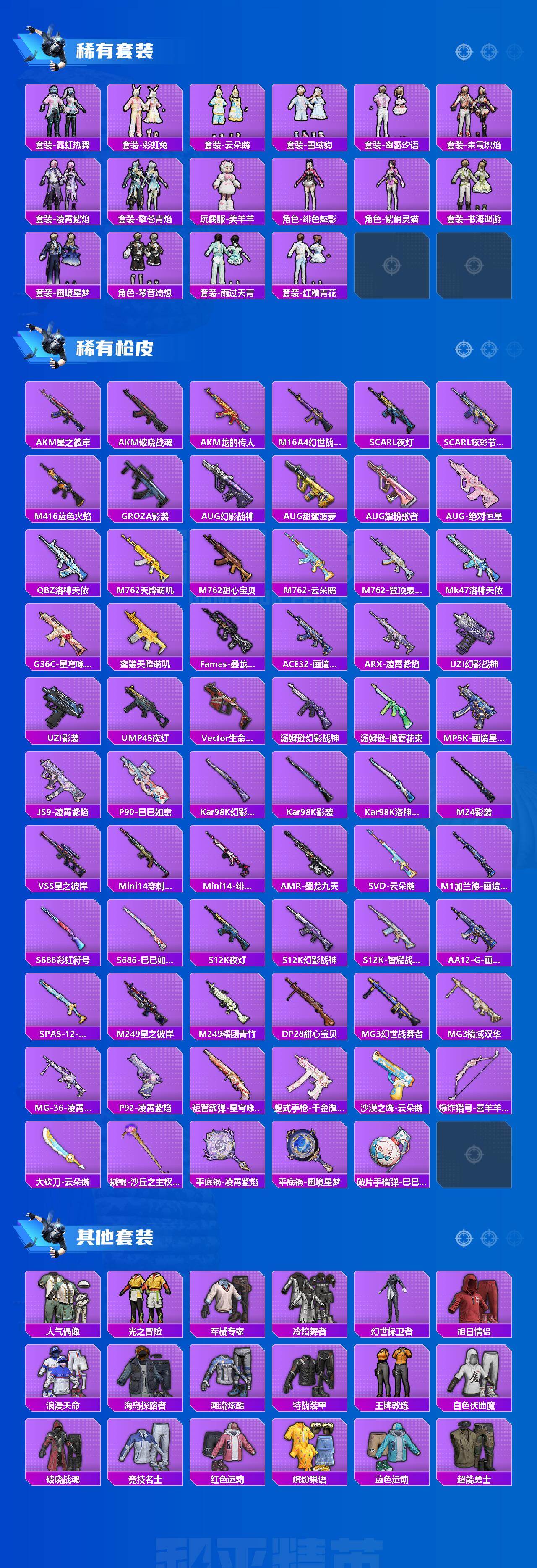 AKM-炫紫旋律,M416-风花雪月,GROZA-镜光银凌,AUG-暖羊咩咩,M762-青锋波束,Kar98K-巳巳如意