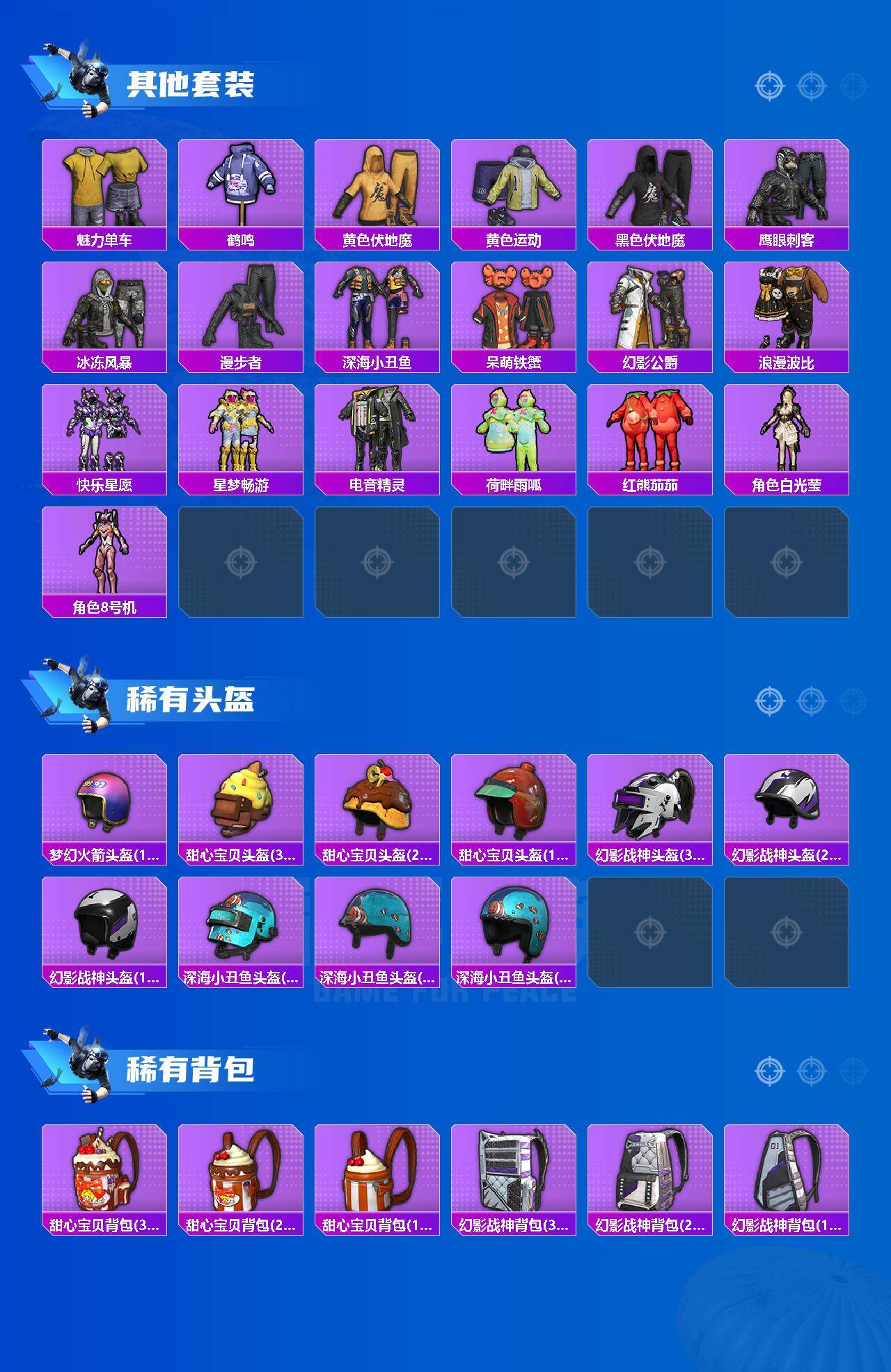 套装-都市猎人,套装-深海小丑鱼,套装-浪漫波比,套装-幻影战神,套装-宝贝奶油派,套装-放客神游,套装-绚金战神,套装-星之彼岸,角色-洛天依,角色-呆萌星弥,角色-觉醒初号机,套装-鹰眼刺客,套装-呆萌铁蟹