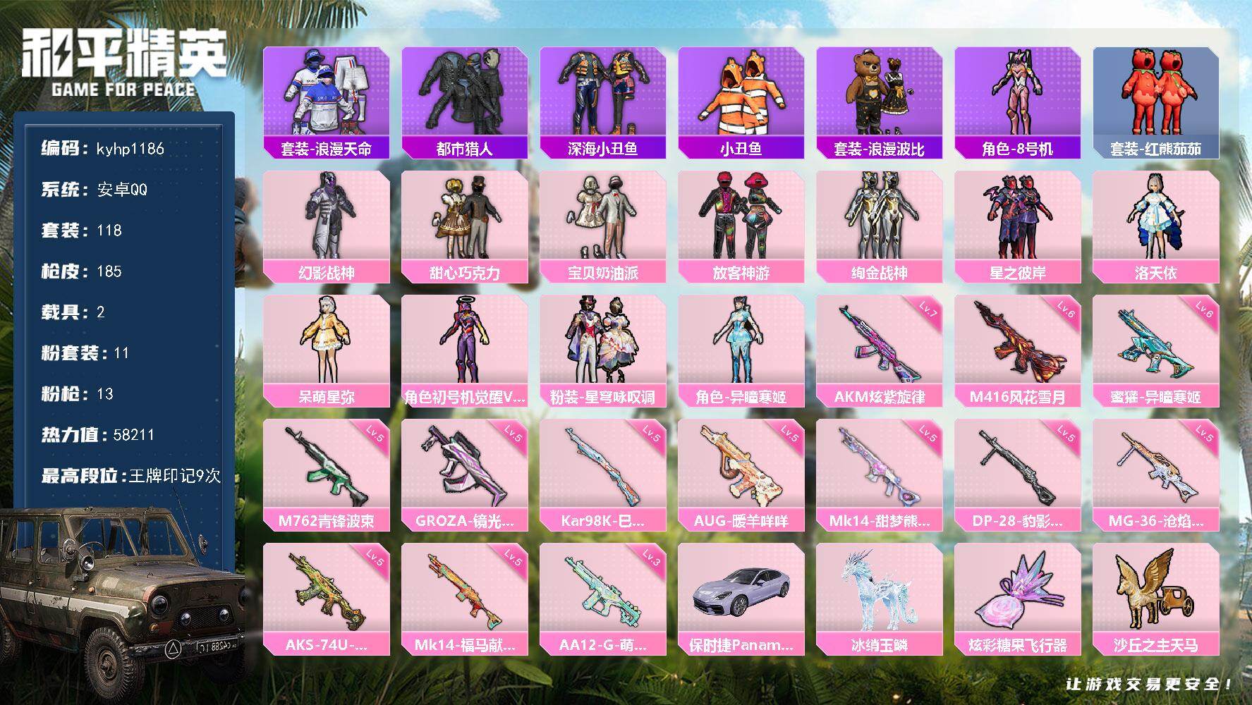[17838012]安卓 手Q-11粉装-13特效枪-2载具-6粉色飞行器-58211热力值-9王牌印记-118套装-185枪皮
