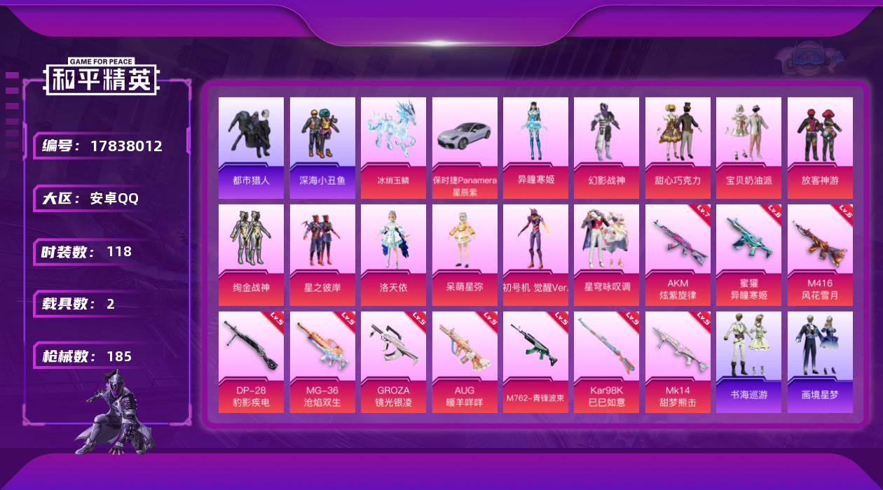 - [17140421]安卓 手Q-6粉装-8特效枪-2载具-1粉色飞行器-60028热力值-3王牌印记-118套装-161枪皮 【热门品类】:套装-胖达圆圆,套装-龟仙人 【粉色套装】:粉装-天使彩虹糖,粉装-翡翠骑士,粉装-银刃赛罗,粉装-冰霜白皇,粉装-炙焰红王,角色-洛天依 【粉色枪皮等级】:M416-风花雪月(四级),AUG-星之彼岸(七级),汤姆逊-热量炸弹(四级),Kar98K-巳巳如意(二级),Mk14-甜梦熊击(五级),Mk14-福马献瑞(一级),S12K-海渊国主(五级),DP-28-豹影疾电(三级) 【粉色载具】:特斯拉Roadster(沁心粉),快艇-塞莎KL27(霓虹粉) 【粉色枪皮】:M416-风花雪月,AUG-星之彼岸,汤姆逊-热量炸弹,Kar98K-巳巳如意,Mk14-甜梦熊击,Mk14-福马献瑞,S12K-海渊国主,DP-28-豹影疾电 【粉色飞行器】:激战未来飞行器 【粉色降落伞】:激战未来降落伞,银刃赛罗降落伞,童趣迷兔降落伞,暗翼战神降落伞,王牌四分卫降落伞,星之彼岸降落伞,洛神天依降落伞,海渊国主降落伞,焦糖拿铁降落伞,橘柚倾心降落伞,圣堂之誓降落伞,动力核心降落伞,鬼刀降落伞 【稀有套装】:套装-龟仙人,套装-小鸟芋圆,套装-雪国风尚,套装-紫幽梦,套装-蓝冰羽,套装-星渊小夜曲,套装-霓虹热舞,套装-彩虹兔,套装-云朵鹅,套装-雪绒豹,玩偶服-懒羊羊 【稀有枪皮】:AKM-夜灯,AKM-山经魅狐,AKM-彩虹符号,AKM-海渊国主,AKM-灼热熔岩,AKM-萌趣颜团子,AKM-虎虎生威,AKM-霓虹街区,AKM-龙的传人,AKM-灵猫魔法师,M16A4-幻世战舞者,SCAR-L-炫彩节奏,SCAR-L-玉兔迎春,SCAR-L-龙宫之主,M416-夜灯,M416-滑板小狐,M416-糯团青竹,GROZA-异彩先驱,GROZA-彩虹符号,GROZA-治愈之星,AUG-幻影战神,AUG-青春冒险家,QBZ-彩虹符号,QBZ-赛罗,QBZ-飞驰魅影,M762-瑞龙福将,M762-云朵鹅,Mk47-青春冒险家,Mk47-湮灭星辰,G36C-时空追击者,G36C-暗夜玫瑰,G36C-星穹咏叹调,AC-VAL-天降萌叽,蜜獾-天降萌叽,UZI-啾咪啾咪,UZI-天降萌叽,UZI-幻影战神,UZI-炫彩节奏,UZI-烈焰拳霸,UMP45-时空追击者,UMP4