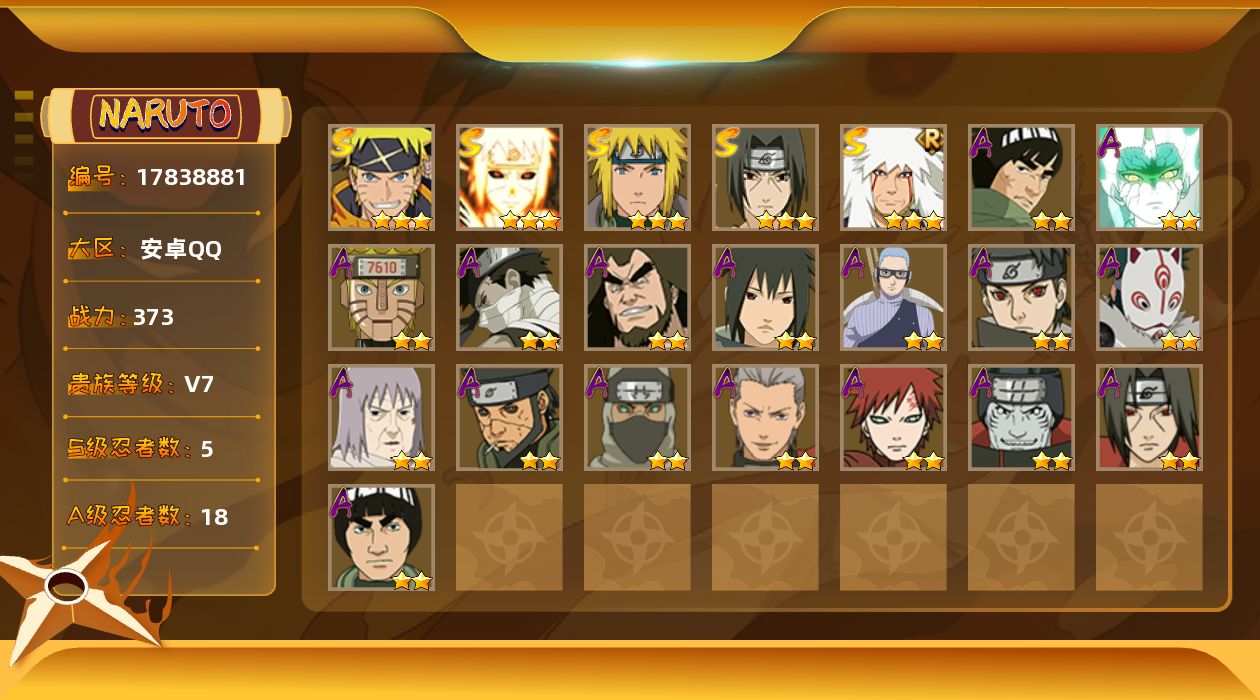 【S级忍者】:宇智波鼬「须佐能乎」(3星),自来也「舞之豪杰」(3星),波风水门(3星),波风水门「九喇嘛连结」(3星),漩涡鸣人·宇智波佐助(3星)