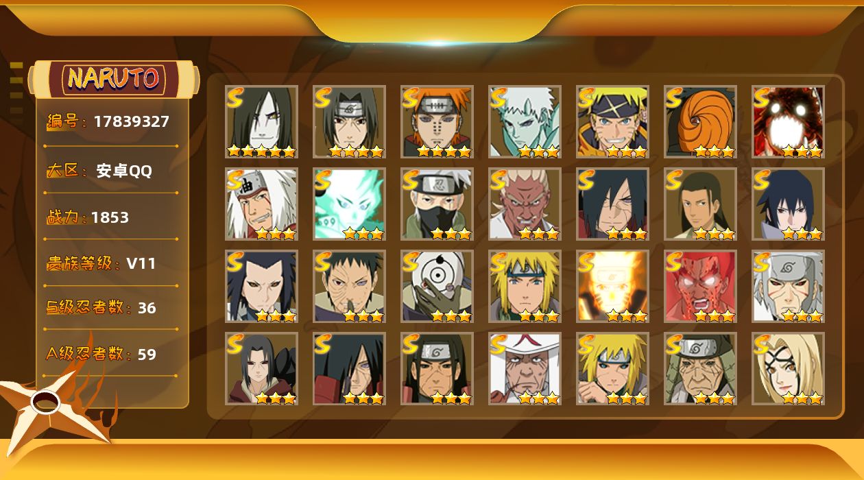 - [15785048]34S级忍者数-50A级忍者数 【S级忍者】:长门「秽土转生」(3星),半藏「秽土转生」(3星),金角·银角「秽土转生」(3星),猿飞日斩「秽土转生」(3星),波风水门「秽土转生」(3星),千手扉间「秽土转生」(3星),千手柱间「秽土转生」(3星),宇智波鼬「秽土转生」(3星),宇智波斑「秽土转生」(3星),宇智波带土「忍界大战」(3星),宇智波鼬「须佐能乎」(4星),旗木卡卡西「须佐能乎」(3星),宇智波斑「木叶创立」(3星),无「二代目土影」(3星),艾「四代目雷影」(3星),艾「三代目雷影」(3星),自来也(3星),自来也「仙人模式」(3星),自来也「舞之豪杰」(3星),大蛇丸(4星),纲手(4星),纲手「百豪」(3星),千手柱间(3星),千手扉间(3星),猿飞日斩(5星),宇智波斑(3星),波风水门(4星),药师兜「仙人模式」(3星),神秘面具男(3星),迈特凯「死门」(3星),佩恩「天道」(4星),宇智波斑 「白面具」(3星宇智波斑「白面具」),大筒木舍人「最终章」(3星),漩涡鸣人·宇智波佐助(3星) 【A级忍者】:艾「青年」(2星),长门「青年」(2星),波风水门「青年」(3星),达鲁伊「博人传」(2星),迪达拉(2星),迪达拉「秽土转生」(2星),大蛇丸「晓」(2星),奇拉比(2星),奇拉比「忍界大战」(2星),飞段(4星),飞段「死司凭血」(5星),干柿鬼鲛(5星),漩涡博人「桃式显现」(2星),漩涡鸣人「仙人模式」(2星),漩涡鸣人「九尾查克拉」(3星),迈特凯(5星),旗木卡卡西「万花筒写轮眼」(2星),桃地再不斩(2星),我爱罗「疾风传」(5星),我爱罗「忍界大战」(2星),蝎(5星),蝎「绯流琥」(2星),小南(2星),小南「夏日泳装」(2星),角都(2星),角都「晓创生」(2星),角都「秽土转生」(2星),猿飞阿斯玛(5星),猿飞阿斯玛「秽土转生」(2星),宇智波止水(2星),宇智波鼬(2星),宇智波佐助「须佐能乎」(2星),宇智波佐助「万花筒写轮眼」(2星),药师兜「半蛇斗篷」(2星),照美冥「五代目水影」(2星),日向雏田「最终章」(2星),长十郎「六代目水影」(2星),李洛克「忍界大战」(2星),猿飞木叶丸「博人传」(2星),黑土「博人传」(2星),勘九郎「忍界大战」(2星),春野樱「百豪」(2星),秋道丁次「忍界大战」(2星),