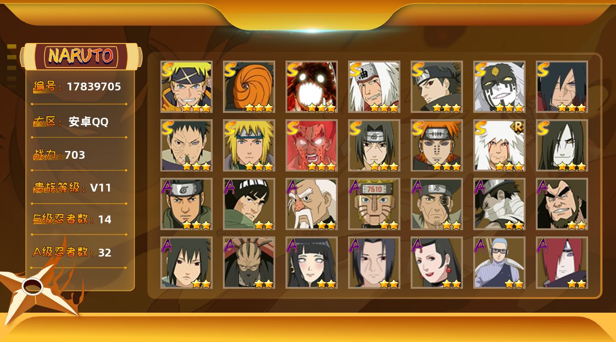 【S级忍者】:宇智波斑「秽土转生·解」(3星),宇智波带土「忍界大战」(3星),宇智波鼬「须佐能乎」(3星),宇智波止水「须佐能乎」(3星),自来也「舞之豪杰」(3星),大蛇丸(3星),自来也「传说中的三忍」(3星),波风水门(3星),迈特凯「死门」(3星),佩恩「天道」(3星),大筒木桃式(3星),漩涡鸣人「暴怒·第六尾」(3星),宇智波斑「五影会谈」(3星),漩涡鸣人·宇智波佐助(3星)