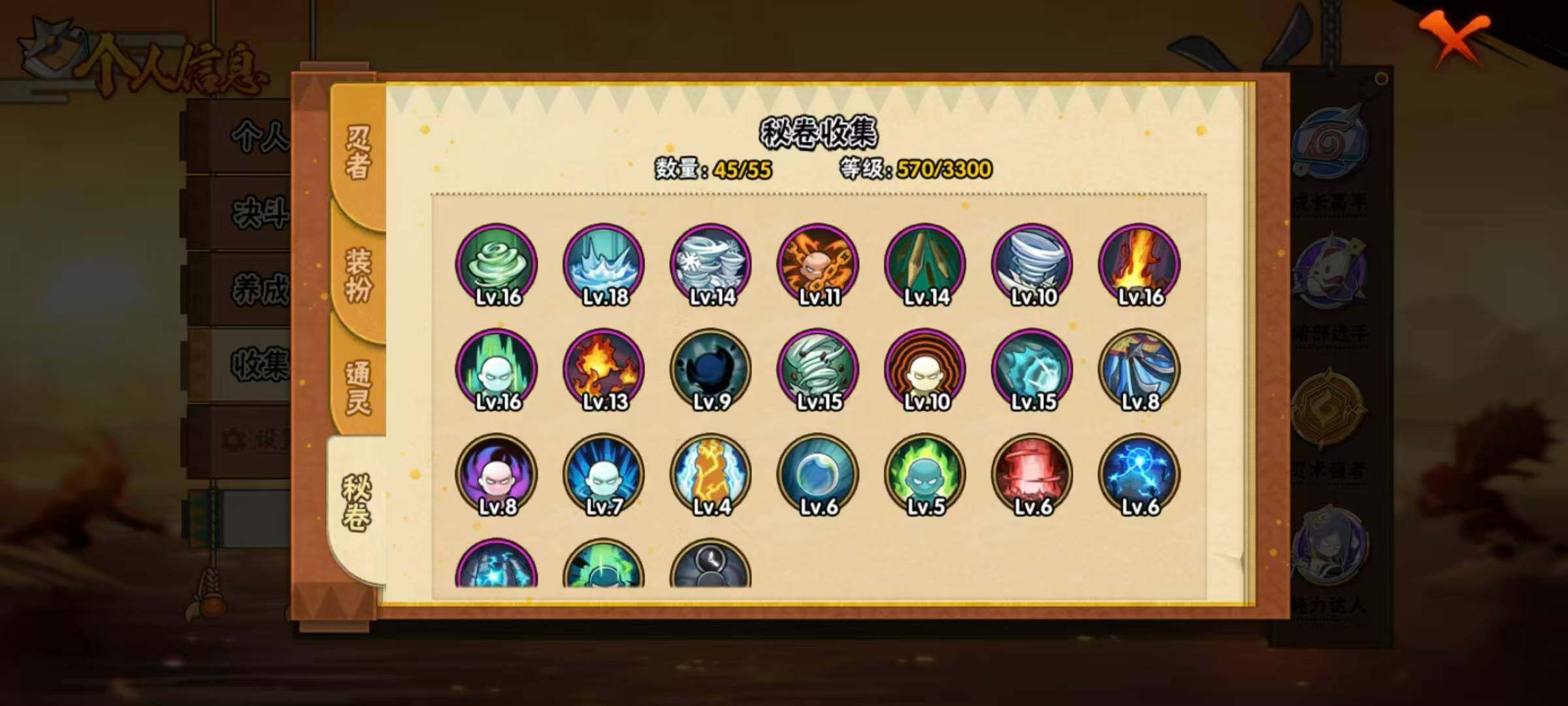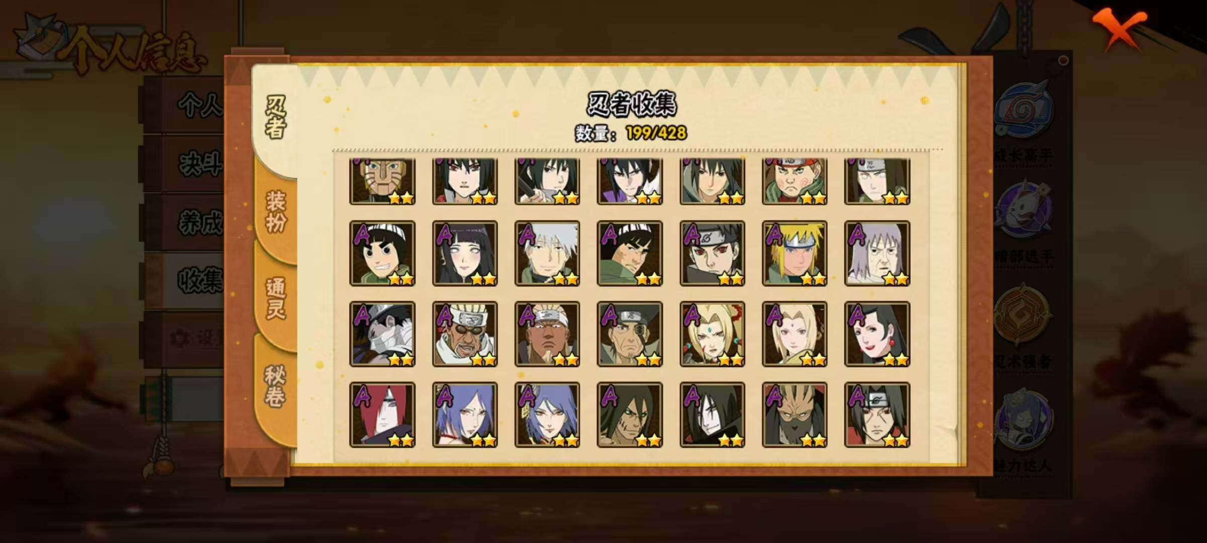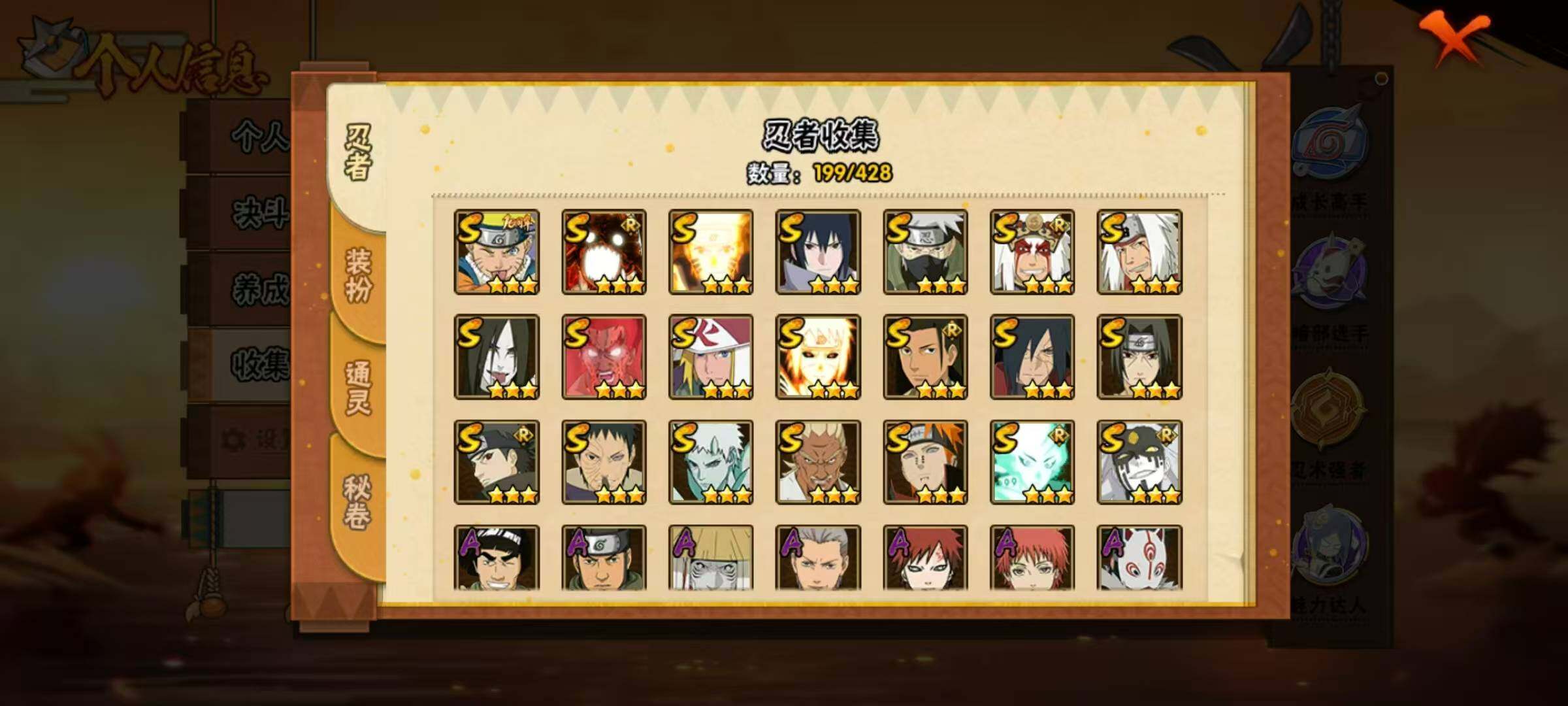 【A级忍者】:波风水门「青年」(2星),迪达拉(2星),迪达拉「秽土转生」(2星),奇拉比「忍界大战」(2星),飞段(3星),飞段「死司凭血」(2星),干柿鬼鲛(5星),漩涡鸣人「仙人模式」(2星),迈特凯(5星),旗木卡卡西「幻之真容」(2星),桃地再不斩(2星),桃地再不斩「秽土转生」(2星),我爱罗「疾风传」(3星),蝎(4星),蝎「绯流琥」(2星),小南「神驹佑将」(2星),角都「地怨虞」(2星),角都「晓创生」(2星),猿飞阿斯玛(5星),猿飞阿斯玛「秽土转生」(2星),宇智波鼬(2星),宇智波鼬「夏日限定」(2星),宇智波佐助「须佐能乎」(2星),宇智波佐助「万花筒写轮眼」(2星),药师兜「半蛇斗篷」(2星),照美冥「五代目水影」(2星),日向宁次「忍界大战」(2星),日向雏田「最终章」(2星),宇智波带土「漂泊浪客」(2星),长十郎「六代目水影」(2星),神秘面具男「忍者之路」(2星),猿飞木叶丸「博人传」(2星),千代「近松十人卫」(2星),土台「忍界大战」(3星),地陆(2星),宇智波泉奈(2星),不动(2星),大野木「侠隐江湖」(2星),巳月「仙人模式」(2星),迈特凯「青春爆炸」(2星)