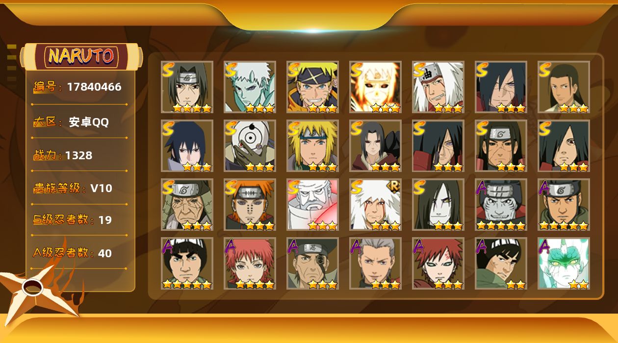 [17840466]19S级忍者数-40A级忍者数 【S级忍者】:猿飞日斩「秽土转生」(3星),千手柱间「秽土转生」(3星),宇智波鼬「秽土转生」(3星),宇智波斑「秽土转生」(3星),宇智波斑「秽土转生·解」(3星),宇智波鼬「须佐能乎」(4星),千手柱间「木叶创立」(3星),自来也「舞之豪杰」(3星),大蛇丸(3星),自来也「传说中的三忍」(3星),宇智波斑(3星),波风水门(3星),佩恩「天道」(3星),宇智波佐助「永恒万花筒」(3星),宇智波斑 「白面具」(3星宇智波斑「白面具」),大筒木金式(3星),波风水门「九喇嘛连结」(3星),漩涡鸣人·宇智波佐助(3星),宇智波带土「十尾人柱力」(3星) 【A级忍者】:波风水门「青年」(2星),迪达拉(2星),迪达拉「秽土转生」(2星),奇拉比「忍界大战」(2星),飞段(3星),飞段「死司凭血」(2星),干柿鬼鲛(5星),漩涡鸣人「仙人模式」(2星),迈特凯(5星),旗木卡卡西「幻之真容」(2星),桃地再不斩(2星),桃地再不斩「秽土转生」(2星),我爱罗「疾风传」(3星),蝎(4星),蝎「绯流琥」(2星),小南「神驹佑将」(2星),角都「地怨虞」(2星),角都「晓创生」(2星),猿飞阿斯玛(5星),猿飞阿斯玛「秽土转生」(2星),宇智波鼬(2星),宇智波鼬「夏日限定」(2星),宇智波佐助「须佐能乎」(2星),宇智波佐助「万花筒写轮眼」(2星),药师兜「半蛇斗篷」(2星),照美冥「五代目水影」(2星),日向宁次「忍界大战」(2星),日向雏田「最终章」(2星),宇智波带土「漂泊浪客」(2星),长十郎「六代目水影」(2星),神秘面具男「忍者之路」(2星),猿飞木叶丸「博人传」(2星),千代「近松十人卫」(2星),土台「忍界大战」(3星),地陆(2星),宇智波泉奈(2星),不动(2星),大野木「侠隐江湖」(2星),巳月「仙人模式」(2星),迈特凯「青春爆炸」(2星)