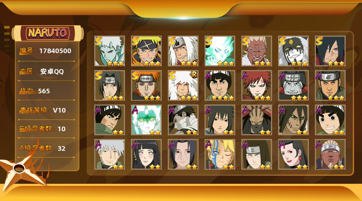 [17840500]10S级忍者数-32A级忍者数 【S级忍者】:宇智波斑「秽土转生·解」(3星),艾「忍界大战」(3星),宇智波鼬「须佐能乎」(3星),自来也「舞之豪杰」(3星),自来也「传说中的三忍」(3星),佩恩「天道」(3星),大筒木桃式(3星),大筒木舍人「最终章」(3星),漩涡鸣人·宇智波佐助(3星),宇智波带土「十尾人柱力」(3星) 【A级忍者】:艾「青年」(2星),波风水门「青年」(2星),迪达拉(2星),飞段(2星),飞段「死司凭血」(2星),干柿鬼鲛(3星),漩涡博人「桃式显现」(2星),迈特凯(4星),旗木卡卡西「幻之真容」(2星),桃地再不斩「秽土转生」(2星),我爱罗「疾风传」(3星),蝎(2星),蝎「绯流琥」(2星),小南「神驹佑将」(2星),角都「秽土转生」(2星),猿飞阿斯玛(3星),宇智波止水「新春限定」(2星),宇智波鼬(2星),宇智波鼬「夏日限定」(2星),宇智波佐助「须佐能乎」(2星),日向宁次「忍界大战」(2星),日向雏田「最终章」(2星),宇智波带土「暴怒」(2星),卑留呼「火之意志继承者」(2星),神秘面具男「忍者之路」(2星),李洛克「忍界大战」(2星),秋道丁次「忍界大战」(2星),千代「近松十人卫」(2星),不缘(2星),宇智波泉奈(2星),巳月「仙人模式」(2星),迈特凯「青春爆炸」(2星)