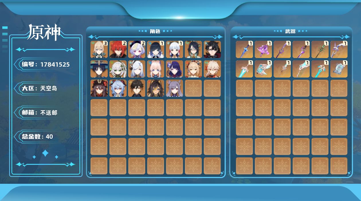 0命闲云,0命莱欧斯利,0命迪希雅,0命流浪者,0命纳西妲,1命夜兰,0命申鹤,0命雷电将军,0命枫原万叶,1命神里绫华,0命钟离,0命胡桃,0命甘雨,0命宵宫,0命珊瑚宫心海,0命刻晴,2命七七,3命琴,2命迪卢克,精1波乱月白经津,精1神乐之真意,精1薙草之稻光,精1雾切之回光,精1四风原典,精1和璞鸢,精1天空之脊,精1天空之翼,精1阿莫斯之弓,精1天空之刃,精1天空之卷,精1天空之傲