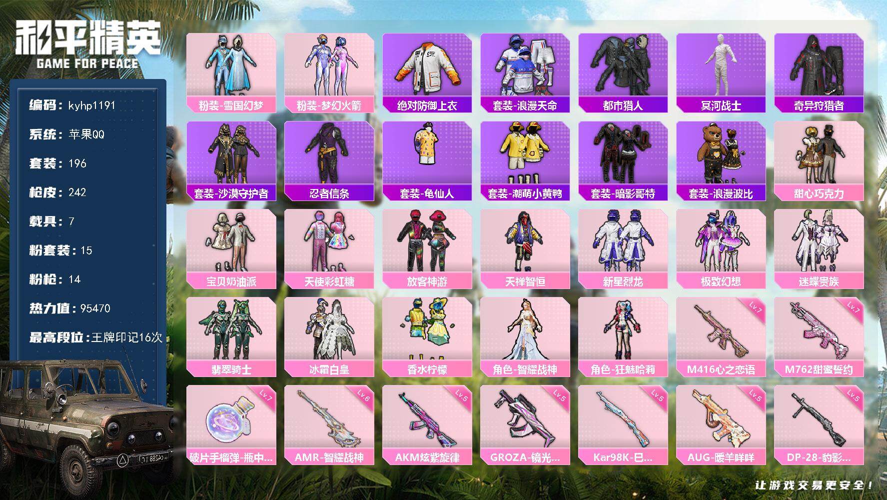 [17841535]苹果 手Q-15粉装-14特效枪-7载具-6粉色飞行器-95470热力值-16王牌印记-196套装-242枪皮