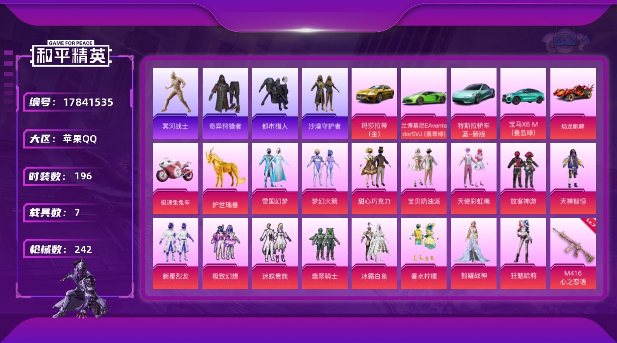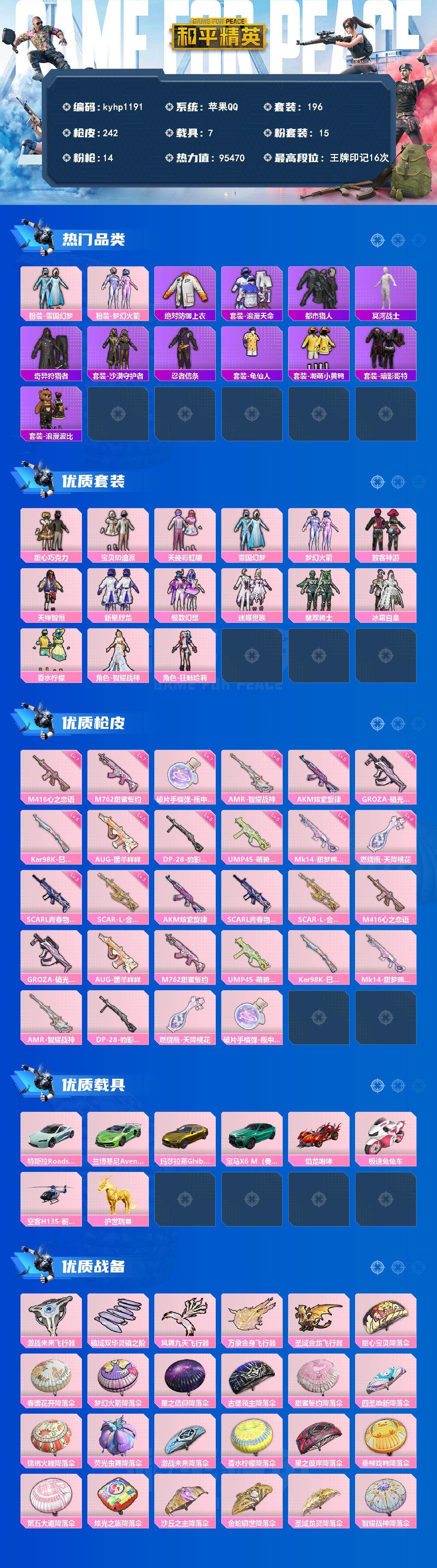 [17841535]苹果 手Q-15粉装-14特效枪-7载具-6粉色飞行器-95470热力值-16王牌印记-196套装-242枪皮 【热门品类】:粉装-雪国幻梦,粉装-梦幻火箭,绝对防御上衣,套装-浪漫天命,套装-都市猎人,套装-冥河战士,套装-奇异狩猎者,套装-沙漠守护者,套装-忍者信条,套装-龟仙人,套装-潮萌小黄鸭,套装-暗影哥特,套装-浪漫波比 【粉色套装】:粉装-甜心巧克力,粉装-宝贝奶油派,粉装-天使彩虹糖,粉装-雪国幻梦,粉装-梦幻火箭,粉装-放客神游,粉装-天禅智恒,粉装-新星烈龙,粉装-极致幻想,粉装-迷蝶贵族,粉装-翡翠骑士,粉装-冰霜白皇,粉装-香水柠檬,角色-智耀战神,角色-狂魅哈莉 【粉色枪皮等级】:AKM-炫紫旋律(五级),SCAR-L-青春物语(三级),SCAR-L-金蛇镇世(三级),M416-心之恋语(七级),GROZA-镜光银凌(五级),AUG-暖羊咩咩(五级),M762-甜蜜誓约(七级),UMP45-萌骑冒险(五级),Kar98K-巳巳如意(五级),Mk14-甜梦熊击(四级),AMR-智耀战神(六级),DP-28-豹影疾电(五级),燃烧瓶-天降桃花(四级),破片手榴弹-瓶中星球(七级) 【粉色载具】:特斯拉Roadster(水滴蓝),兰博基尼Aventador SVJ(翡翠绿),玛莎拉蒂Ghibli(金),宝马X6 M(曼岛绿),焰龙咆哮,极速兔兔车,空客H135-蔚蓝之翼,护世瑞兽 【粉色枪皮】:AKM-炫紫旋律,SCAR-L-青春物语,SCAR-L-金蛇镇世,M416-心之恋语,GROZA-镜光银凌,AUG-暖羊咩咩,M762-甜蜜誓约,UMP45-萌骑冒险,Kar98K-巳巳如意,Mk14-甜梦熊击,AMR-智耀战神,DP-28-豹影疾电,燃烧瓶-天降桃花,破片手榴弹-瓶中星球 【粉色飞行器】:激战未来飞行器,镜域双华-灵镜之阶,凤舞九天飞行器,万象金身飞行器,圣域金龙飞行器 【粉色降落伞】:甜心宝贝降落伞,春暖花开降落伞,梦幻火箭降落伞,星之信仰降落伞,古堡领主降落伞,甜蜜誓约降落伞,四圣焕新降落伞,锦绣火鲤降落伞,荧光虫舞降落伞,激战未来降落伞,香水柠檬降落伞,星之彼岸降落伞,垂柳戏鸭降落伞,第五大道降落伞,炫光之旅降落伞,沙丘之主降落伞,金蛇镇世降落伞,圣域龙灵降落伞,智耀战神降落伞,双重狂想降落伞,冷漠罗丽降落伞,炫彩糖果降落伞 【稀