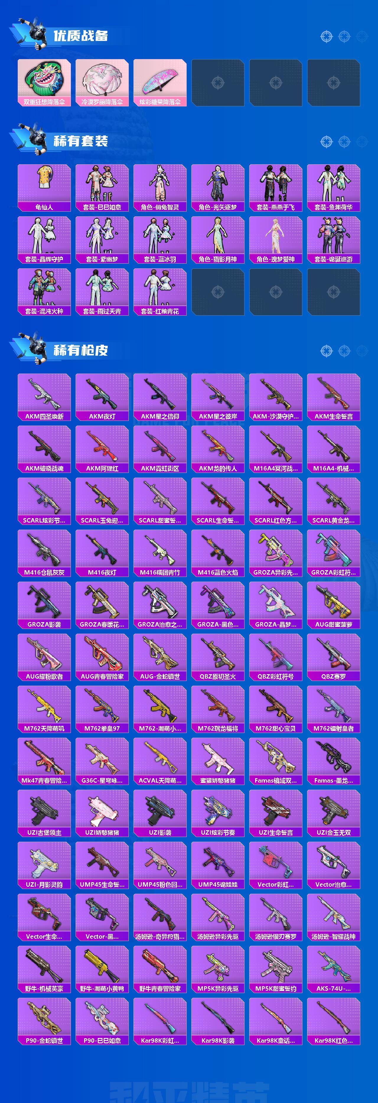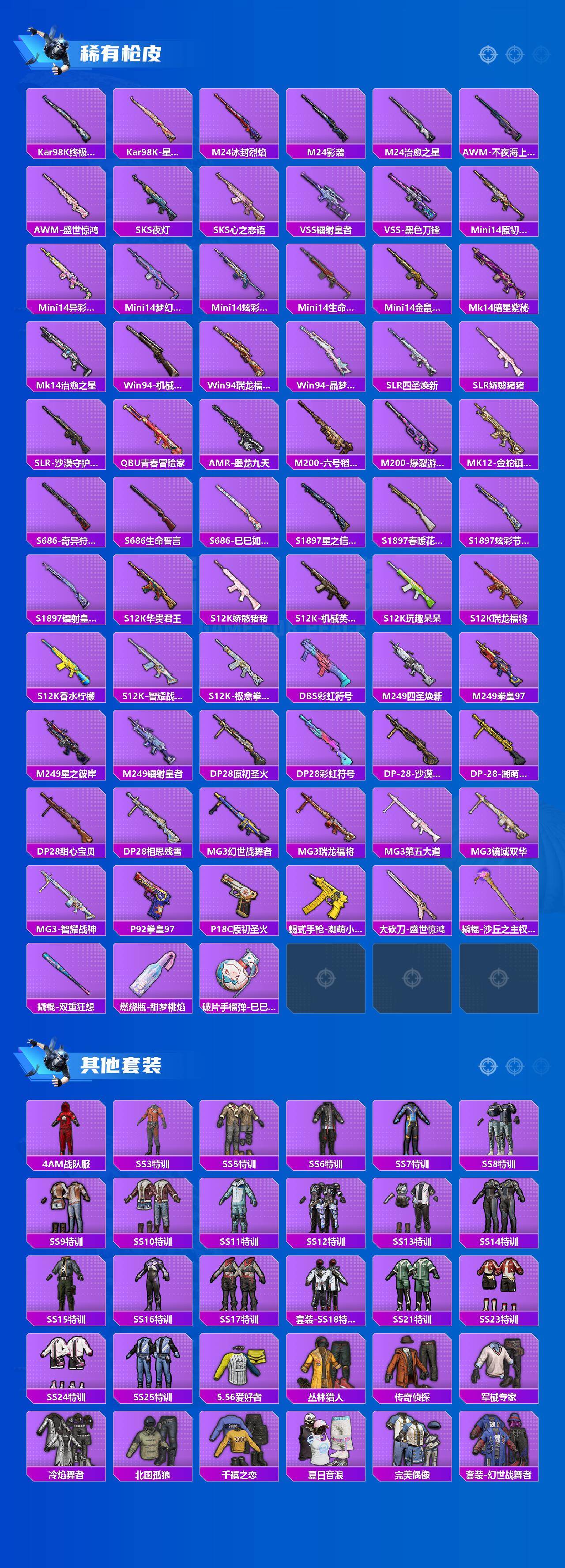 AKM-炫紫旋律,SCAR-L-青春物语,SCAR-L-金蛇镇世,M416-心之恋语,GROZA-镜光银凌,AUG-暖羊咩咩,M762-甜蜜誓约,Kar98K-巳巳如意