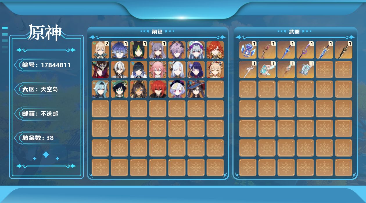 0命阿蕾奇诺,0命迪希雅,1命提纳里,0命夜兰,0命八重神子,0命申鹤,0命优菈,0命雷电将军,0命宵宫,0命温迪,1命刻晴,0命七七,2命琴,0命莫娜,0命迪卢克,0命恰斯卡,0命玛薇卡,0命梦见月瑞希,1命菲林斯,0命杜林,精1最初的大魔术,精1波乱月白经津,精1薙草之稻光,精1松籁响起之时,精1四风原典,精1天空之脊,精1斫峰之刃,精1天空之卷,精1风鹰剑,精1祭星者之望