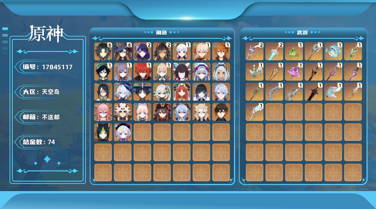 0命闲云,0命芙宁娜,2命迪希雅,0命流浪者,0命纳西妲,0命妮露,0命提纳里,0命夜兰,0命神里绫人,0命八重神子,0命荒泷一斗,2命雷电将军,1命枫原万叶,1命神里绫华,0命钟离,0命胡桃,0命甘雨,满命魈,1命温迪,1命达达利亚,0命阿贝多,0命珊瑚宫心海,1命刻晴,0命七七,1命琴,满命莫娜,1命迪卢克,0命玛拉妮,0命梦见月瑞希,0命哥伦比娅,精1裁叶萃光,精1千夜浮梦,精1圣显之钥,精1神乐之真意,精1赤角石溃杵,精1终末嗟叹之诗,精1冬极白星,精1薙草之稻光,精1雾切之回光,精1和璞鸢,精1天空之脊,精1天空之翼,精2阿莫斯之弓,精1天空之卷,精1狼的末路,精2天空之傲,精1冲浪时光,精1支离轮光,精1真语秘匣