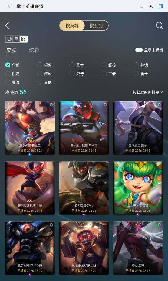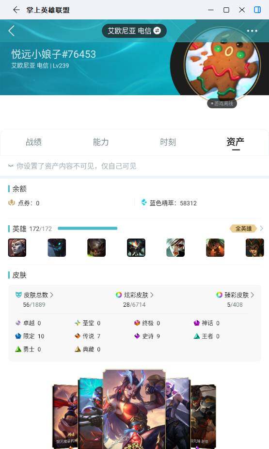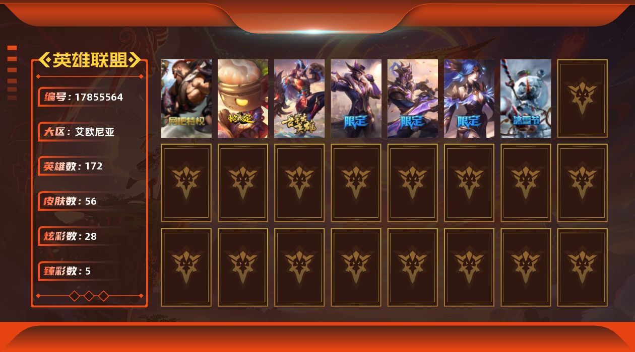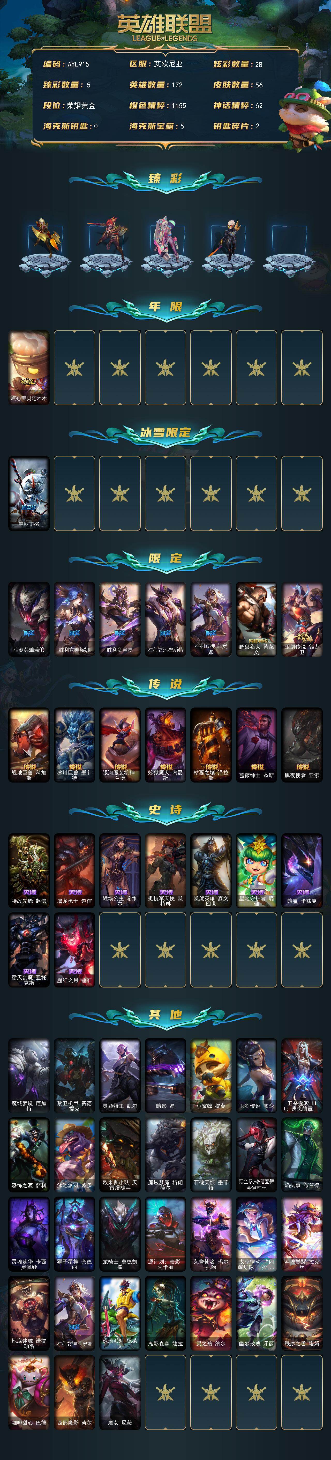 [17855564]黄金段位-172英雄-56皮肤-28炫彩-0终极-0神话-10限定-7传说-9史诗