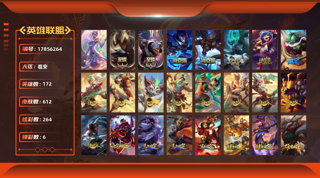 [17856264]铂金段位-172英雄-612皮肤-264炫彩-1终极-6神话-127限定-59传说-144史诗