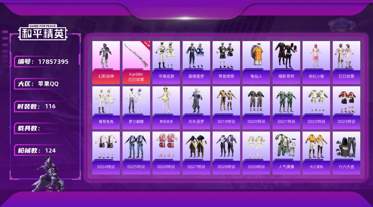 [17857395]苹果 手Q-1粉装-4特效枪-0载具-0粉色飞行器-35250热力值-7王牌印记-116套装-124枪皮 【热门品类】:套装-龟仙人,套装-暗影哥特,套装-粉红小猪 【粉色套装】:粉装-幻影战神 【粉色枪皮等级】:UMP45-萌骑冒险(五级),AKS-74U-森灵之息(五级),Kar98K-巳巳如意(五级),Mk14-福马献瑞(五级) 【粉色枪皮】:UMP45-萌骑冒险,AKS-74U-森灵之息,Kar98K-巳巳如意,Mk14-福马献瑞 【粉色降落伞】:幻影战神降落伞,星之彼岸降落伞,月影灵韵降落伞,鬼刀降落伞 【稀有套装】:套装-龟仙人,套装-巳巳如意,套装-马上有钱,套装-雏菊兔兔,套装-萝兰蝴蝶,套装-青团波波,角色-光矢逐梦,套装-书海巡游,套装-画境星梦,套装-琴音绮想,套装-雨过天青,套装-红釉青花 【稀有枪皮】:AKM-彩虹符号,AKM-灼热熔岩,AKM-缤纷海域,AKM-龙的传人,M16A4-幻世战舞者,SCAR-L-炫彩节奏,SCAR-L-玉兔迎春,SCAR-L-红色方程式,M416-糯团青竹,M416-蓝色火焰,AUG-天降萌叽,AUG-幻影战神,QBZ-彩虹符号,M762-天降萌叽,M762-彩虹甜喵,Mk47-虚空骇客,AC-VAL-天降萌叽,蜜獾-天降萌叽,蜜獾-娇憨猪猪,ACE32-画境星梦,UZI-天降萌叽,UZI-娇憨猪猪,UZI-炫彩节奏,UMP45-夜灯,UMP45-涂山之恋,UMP45-炫光之旅,UMP45-蓝色火焰,Vector-焰鹰斗篷,Vector-生命誓言,汤姆逊-天降萌叽,汤姆逊-环太平洋,汤姆逊-像素花束,MP5K-画境星梦,P90-巳巳如意,Kar98K-幻影战神,M24-炫彩节奏,AWM-焰鹰斗篷,Mini14-炫彩节奏,SLR-娇憨猪猪,SLR-彩虹符号,M417-惊鸿侠骨,M200-惊鸿侠骨,M1加兰德-画境星梦,S686-巳巳如意,S1897-炫彩节奏,S12K-玩趣呆呆,S12K-娇憨猪猪,S12K-幻世战舞者,S12K-幻影战神,DBS-焰鹰斗篷,DBS-彩虹甜喵,AA12-G-画境星梦,M249-彩虹符号,M249-糯团青竹,DP-28-焰鹰斗篷,DP-28-彩虹符号,MG3-幻世战舞者,MG3-惊鸿侠骨,PKM-拂晓神骑,TMP-9-未来歌姬,爆炸猎弓-惊鸿侠骨,平底锅-画境星梦,破片手榴弹-巳