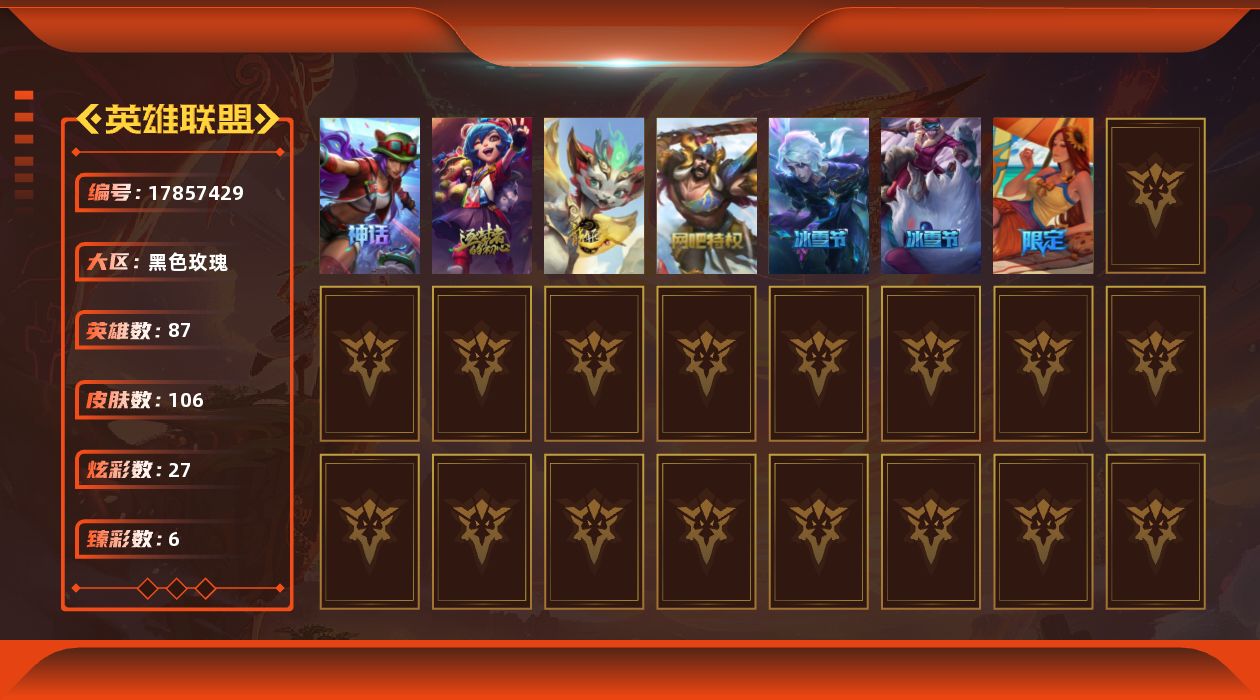 [17857429]未定级段位-87英雄-106皮肤-27炫彩-0终极-2神话-8限定-11传说-16史诗