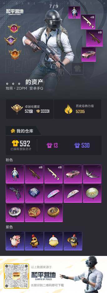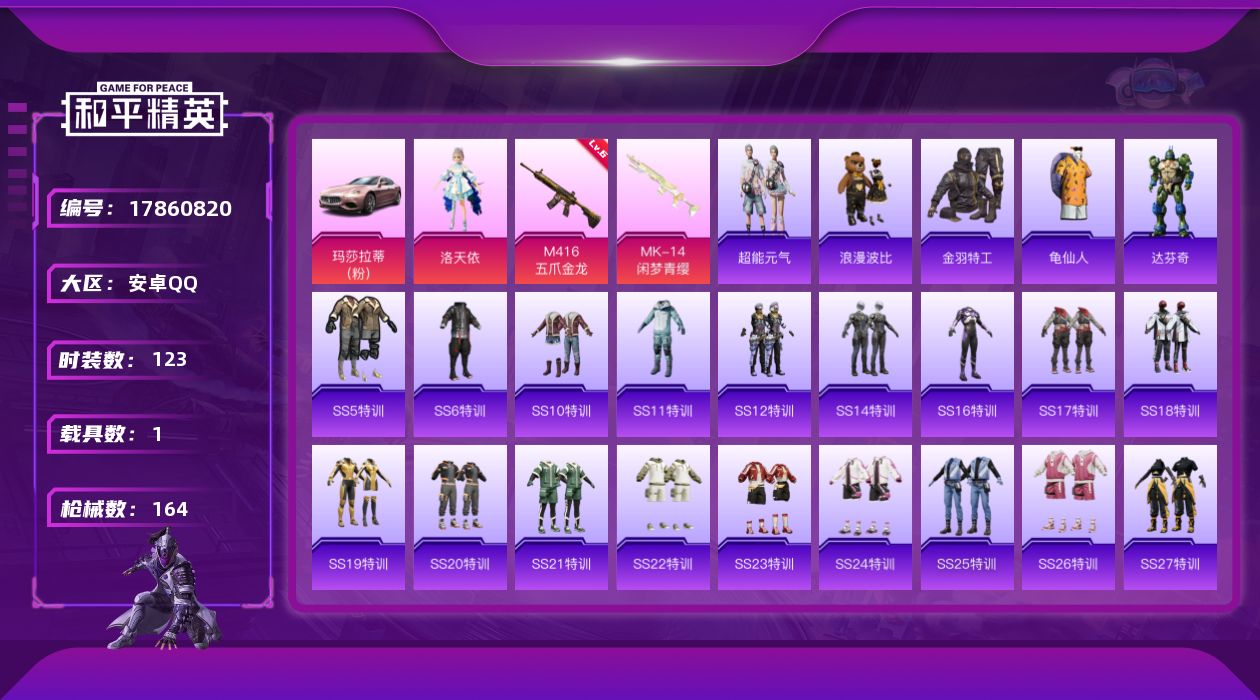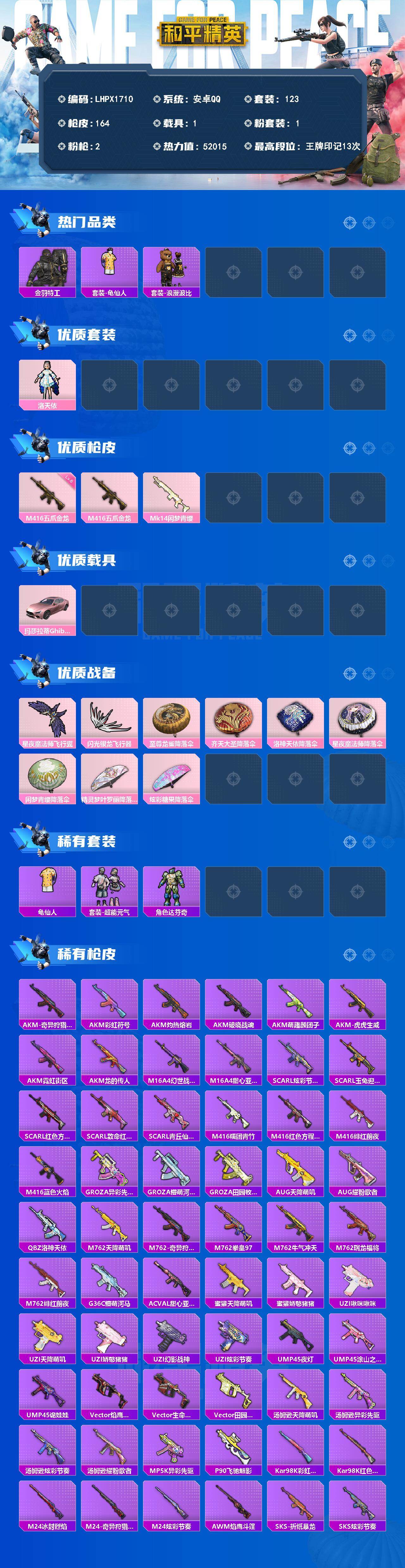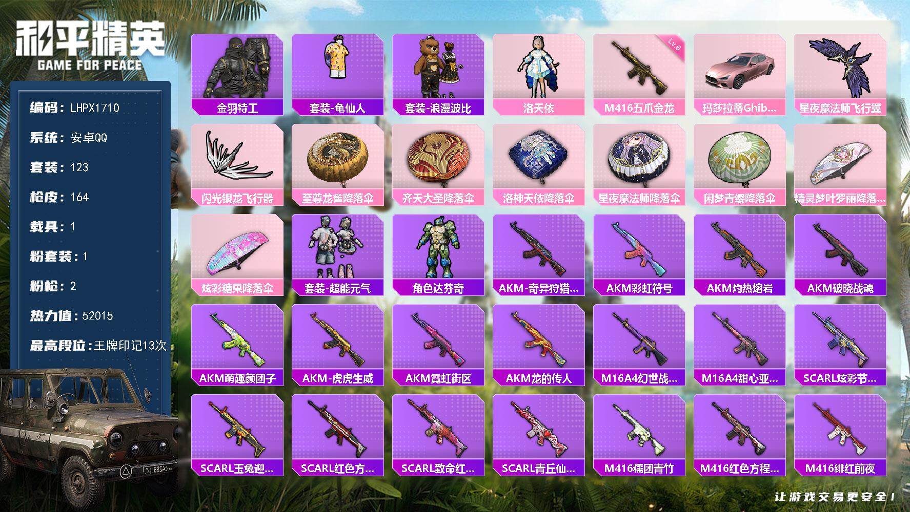 [17860820]【特价出售/店主推荐】安卓 手Q-1粉装-2特效枪-1载具-2粉色飞行器-52015热力值-13王牌印记-123套装-164枪皮 【热门品类】:套装-金羽特工,套装-龟仙人,套装-浪漫波比 【粉色套装】:角色-洛天依 【粉色枪皮等级】:M416-五爪金龙(六级) 【粉色载具】:玛莎拉蒂Ghibli(粉) 【粉色枪皮】:M416-五爪金龙,Mk14-闲梦青缨 【粉色飞行器】:星夜魔法师飞行翼,闪光银龙飞行器 【粉色降落伞】:至尊龙雀降落伞,齐天大圣降落伞,洛神天依降落伞,星夜魔法师降落伞,闲梦青缨降落伞,精灵梦叶罗丽降落伞,炫彩糖果降落伞 【稀有套装】:套装-龟仙人,套装-超能元气,角色-达芬奇 【稀有枪皮】:AKM-奇异狩猎者,AKM-彩虹符号,AKM-灼热熔岩,AKM-破晓战魂,AKM-萌趣颜团子,AKM-虎虎生威,AKM-霓虹街区,AKM-龙的传人,M16A4-幻世战舞者,M16A4-甜心亚梦,SCAR-L-炫彩节奏,SCAR-L-玉兔迎春,SCAR-L-红色方程式,SCAR-L-致命红樱,SCAR-L-青丘仙客,M416-糯团青竹,M416-红色方程式,M416-绯红前夜,M416-蓝色火焰,GROZA-异彩先驱,GROZA-懵萌河马,GROZA-田园牧歌,AUG-天降萌叽,AUG-耀粉歌者,QBZ-洛神天依,M762-天降萌叽,M762-奇异狩猎者,M762-拳皇97,M762-牛气冲天,M762-瑞龙福将,M762-绯红前夜,G36C-懵萌河马,AC-VAL-甜心亚梦,蜜獾-天降萌叽,蜜獾-娇憨猪猪,UZI-啾咪啾咪,UZI-天降萌叽,UZI-娇憨猪猪,UZI-幻影战神,UZI-炫彩节奏,UMP45-夜灯,UMP45-涂山之恋,UMP45-诡娃娃,Vector-焰鹰斗篷,Vector-生命誓言,Vector-田园牧歌,汤姆逊-天降萌叽,汤姆逊-异彩先驱,汤姆逊-炫彩节奏,汤姆逊-耀粉歌者,MP5K-异彩先驱,P90-飞驰魅影,Kar98K-彩虹符号,Kar98K-红色方程式,M24-炫彩节奏,M24-冰封烈焰,M24-奇异狩猎者,AWM-焰鹰斗篷,SKS-折纸暴龙,SKS-炫彩节奏,SKS-糯团青竹,VSS-田园牧歌,Mini14-异彩先驱,Mini14-旋转彩虹,Mini14-涂山之恋,Mini14-耀粉歌者,Mini14-银河战甲,Win94-瑞龙福