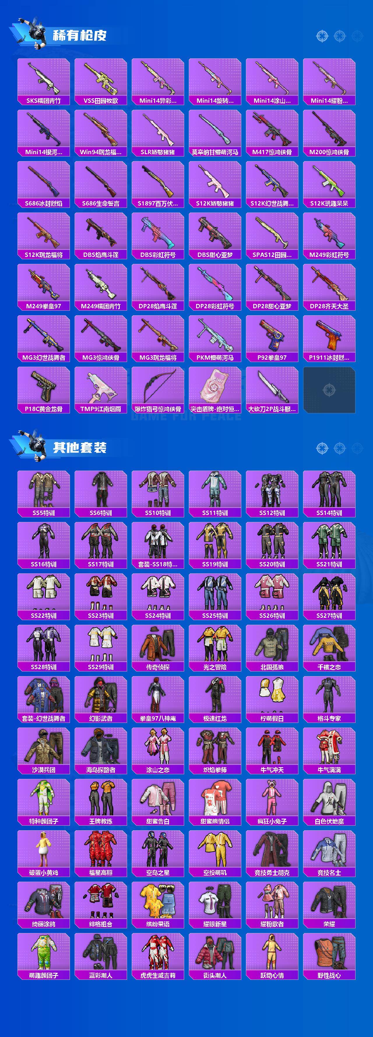 【稀有枪皮】:AKM-奇异狩猎者,AKM-彩虹符号,AKM-灼热熔岩,AKM-破晓战魂,AKM-萌趣颜团子,AKM-虎虎生威,AKM-霓虹街区,AKM-龙的传人,M16A4-幻世战舞者,M16A4-甜心亚梦,SCAR-L-炫彩节奏,SCAR-L-玉兔迎春,SCAR-L-红色方程式,SCAR-L-致命红樱,SCAR-L-青丘仙客,M416-糯团青竹,M416-红色方程式,M416-绯红前夜,M416-蓝色火焰,GROZA-异彩先驱,GROZA-懵萌河马,GROZA-田园牧歌,AUG-天降萌叽,AUG-耀粉歌者,QBZ-洛神天依,M762-天降萌叽,M762-奇异狩猎者,M762-拳皇97,M762-牛气冲天,M762-瑞龙福将,M762-绯红前夜,G36C-懵萌河马,AC-VAL-甜心亚梦,蜜獾-天降萌叽,蜜獾-娇憨猪猪,UZI-啾咪啾咪,UZI-天降萌叽,UZI-娇憨猪猪,UZI-幻影战神,UZI-炫彩节奏,UMP45-夜灯,UMP45-涂山之恋,UMP45-诡娃娃,Vector-焰鹰斗篷,Vector-生命誓言,Vector-田园牧歌,汤姆逊-天降萌叽,汤姆逊-异彩先驱,汤姆逊-炫彩节奏,汤姆逊-耀粉歌者,MP5K-异彩先驱,P90-飞驰魅影,Kar98K-彩虹符号,Kar98K-红色方程式,M24-炫彩节奏,M24-冰封烈焰,M24-奇异狩猎者,AWM-焰鹰斗篷,SKS-折纸暴龙,SKS-炫彩节奏,SKS-糯团青竹,VSS-田园牧歌,Mini14-异彩先驱,Mini14-旋转彩虹,Mini14-涂山之恋,Mini14-耀粉歌者,Mini14-银河战甲,Win94-瑞龙福