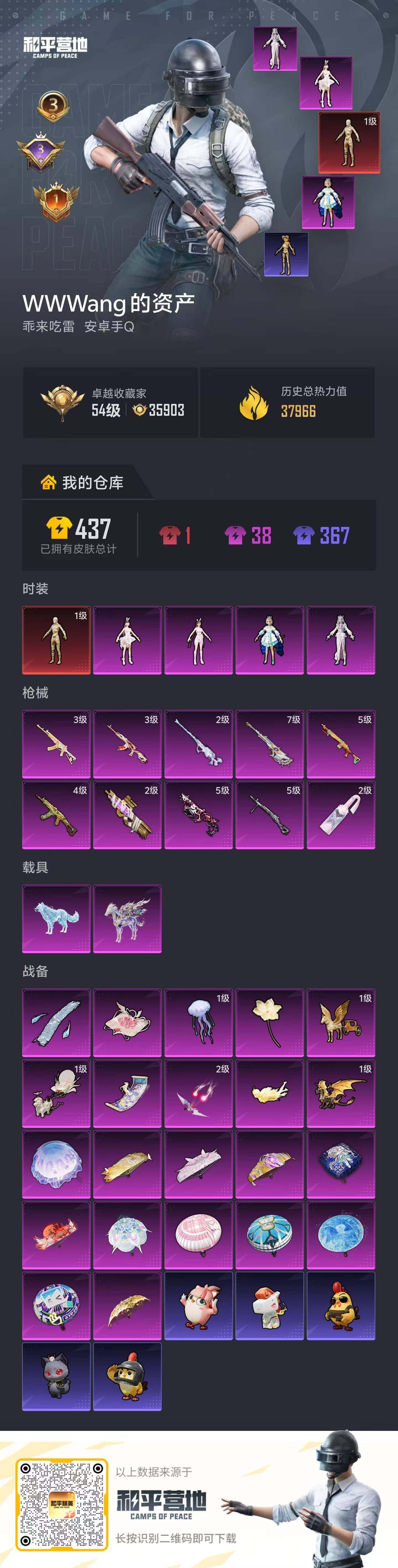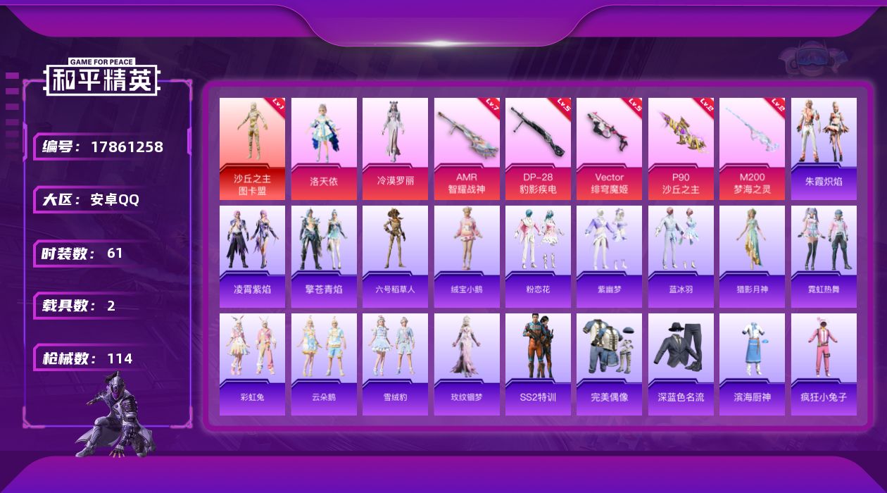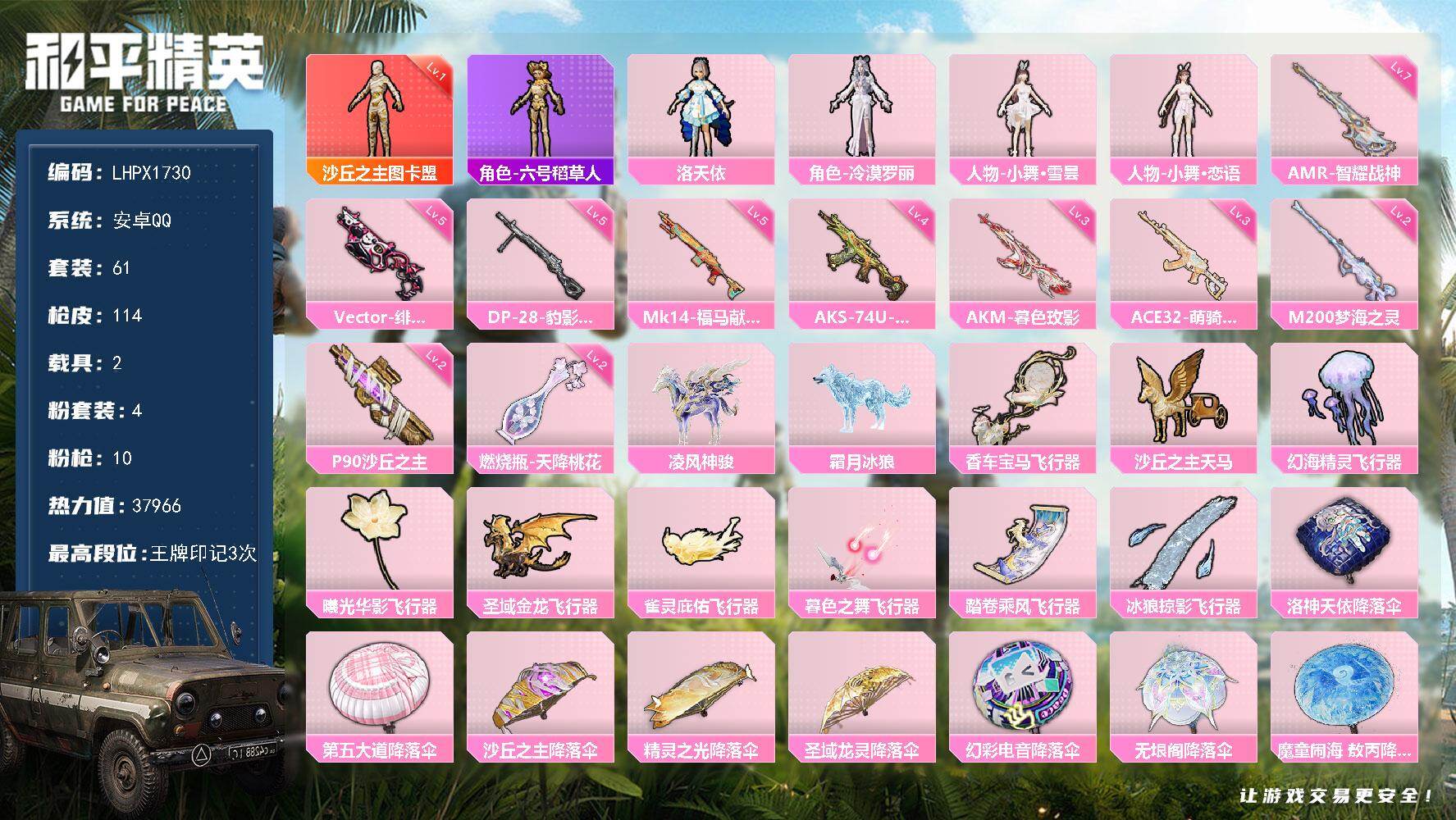 [17861258]安卓 手Q-1神装-4粉装-10特效枪-2载具-10粉色飞行器-37966热力值-3王牌印记-61套装-114枪皮