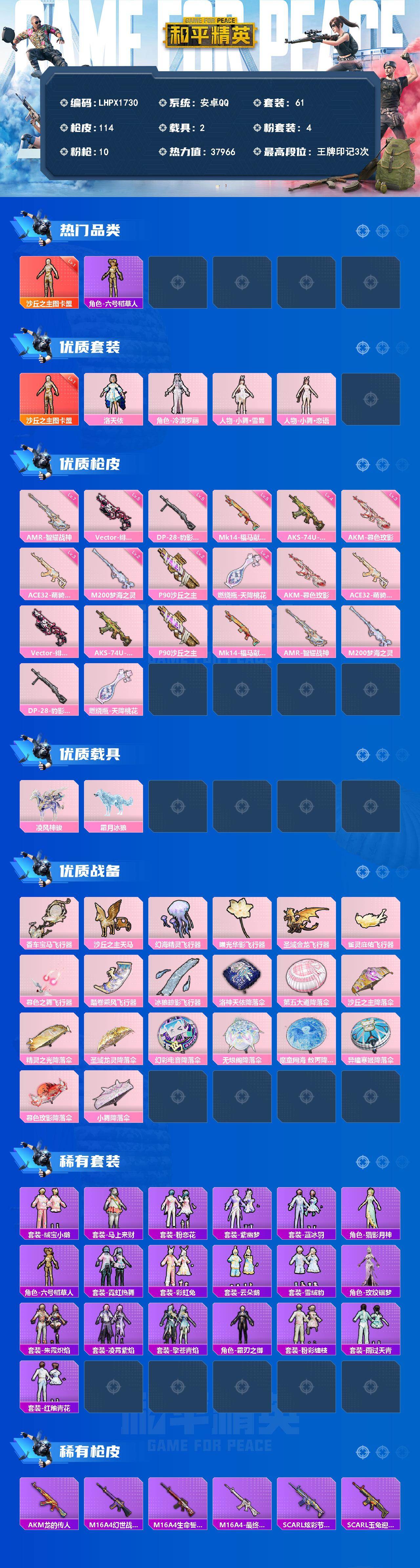 - [18003331]安卓 手Q-2粉装-6特效枪-1载具-2粉色飞行器-43482热力值-6王牌印记-104套装-143枪皮 【热门品类】:套装-浪漫天命,套装-金羽特工,套装-龟仙人,套装-暗影哥特,角色-Mark.06 【粉色套装】:角色-守护天翼,角色-樱桃泡泡 【粉色枪皮等级】:M416-五爪金龙(七级),AUG-暖羊咩咩(五级),AKS-74U-森灵之息(五级),Kar98K-巳巳如意(五级),Mk14-甜梦熊击(五级),DP-28-豹影疾电(五级) 【粉色载具】:玛莎拉蒂Ghibli(粉) 【粉色枪皮】:M416-五爪金龙,AUG-暖羊咩咩,AKS-74U-森灵之息,Kar98K-巳巳如意,Mk14-甜梦熊击,DP-28-豹影疾电 【粉色飞行器】:炫彩糖果飞行器,极意拳锋飞行器 【粉色降落伞】:闪光银龙降落伞,环太平洋降落伞,初号机 觉醒Ver.降落伞,异瞳寒姬降落伞,炫彩糖果降落伞 【稀有套装】:套装-龟仙人,套装-雪国风尚,套装-炫彩糖果,角色-糖霜甜心,角色-时希公主,角色-绯色魅影,套装-书海巡游,套装-画境星梦,套装-琴音绮想 【稀有枪皮】:AUG-冰晶雪宝,AKM-彩虹符号,AKM-百万伏特,AKM-破晓战魂,AKM-龙的传人,M16A4-幻世战舞者,M16A4-甜心亚梦,M16A4-红色方程式,SCAR-L-夜灯,SCAR-L-炫彩节奏,SCAR-L-玉兔迎春,SCAR-L-红色方程式,M416-糯团青竹,M416-绯红前夜,M416-蓝色火焰,GROZA-彩虹符号,GROZA-懵萌河马,AUG-天降萌叽,AUG-耀粉歌者,QBZ-彩虹符号,QBZ-飞驰魅影,M762-天降萌叽,M762-彩虹符号,M762-第五大道,G36C-懵萌河马,AC-VAL-彩虹甜喵,AC-VAL-甜心亚梦,蜜獾-天降萌叽,蜜獾-娇憨猪猪,ACE32-画境星梦,UZI-啾咪啾咪,UZI-娇憨猪猪,UMP45-夜灯,UMP45-涂山之恋,UMP45-生命誓言,UMP45-蓝色火焰,Vector-彩虹符号,Vector-生命誓言,汤姆逊-天降萌叽,汤姆逊-环太平洋,汤姆逊-樱桃泡泡,MP5K-画境星梦,P90-飞驰魅影,Kar98K-炫彩节奏,Kar98K-飞驰魅影,M24-炫彩节奏,M24-奇异狩猎者,SKS-炫彩节奏,SKS-糯团青竹,SKS-青丘仙客,Mini14-炫彩节奏,Mi