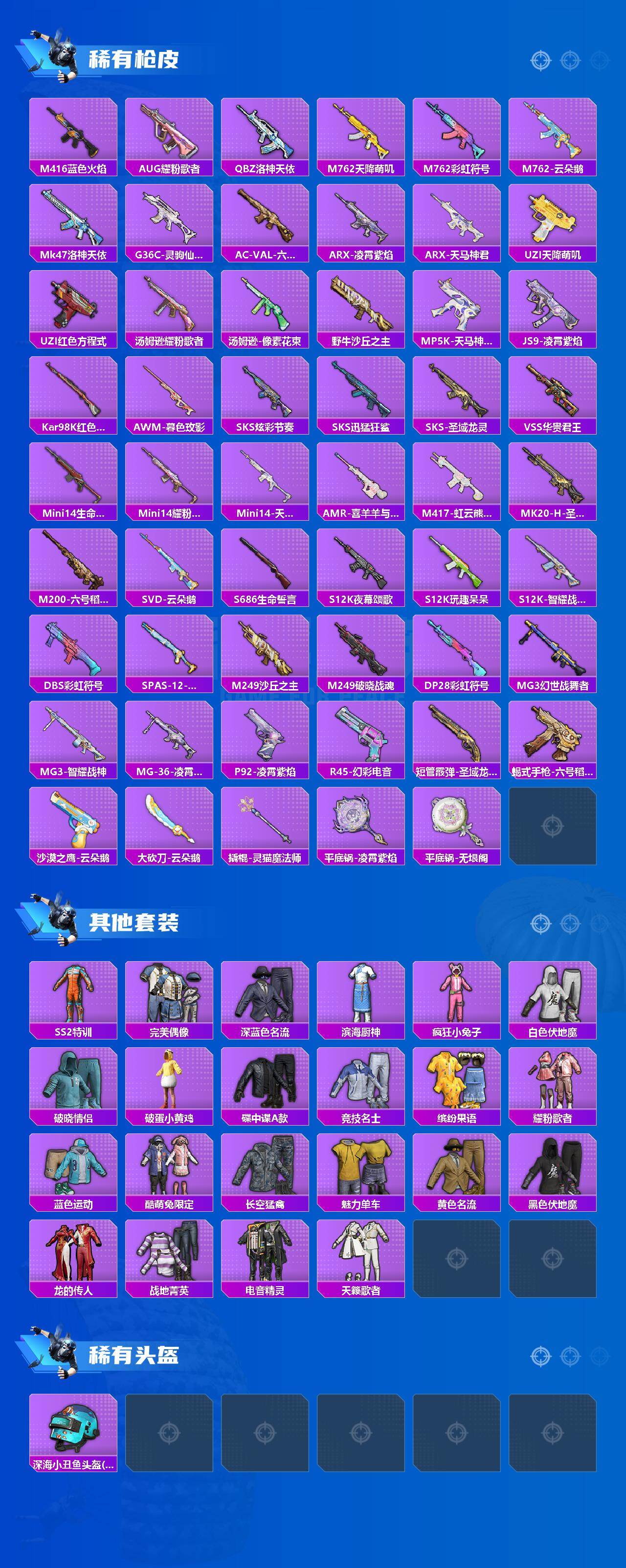 【稀有枪皮】:AKM-龙的传人,M16A4-幻世战舞者,M16A4-生命誓言,M16A4-最终圣卫者,SCAR-L-炫彩节奏,SCAR-L-玉兔迎春,M416-蓝色火焰,AUG-耀粉歌者,QBZ-洛神天依,M762-天降萌叽,M762-彩虹符号,M762-云朵鹅,Mk47-洛神天依,G36C-灵驹仙姬,AC-VAL-六号稻草人,ARX-凌霄紫焰,ARX-天马神君,UZI-天降萌叽,UZI-红色方程式,汤姆逊-耀粉歌者,汤姆逊-像素花束,野牛-沙丘之主,M