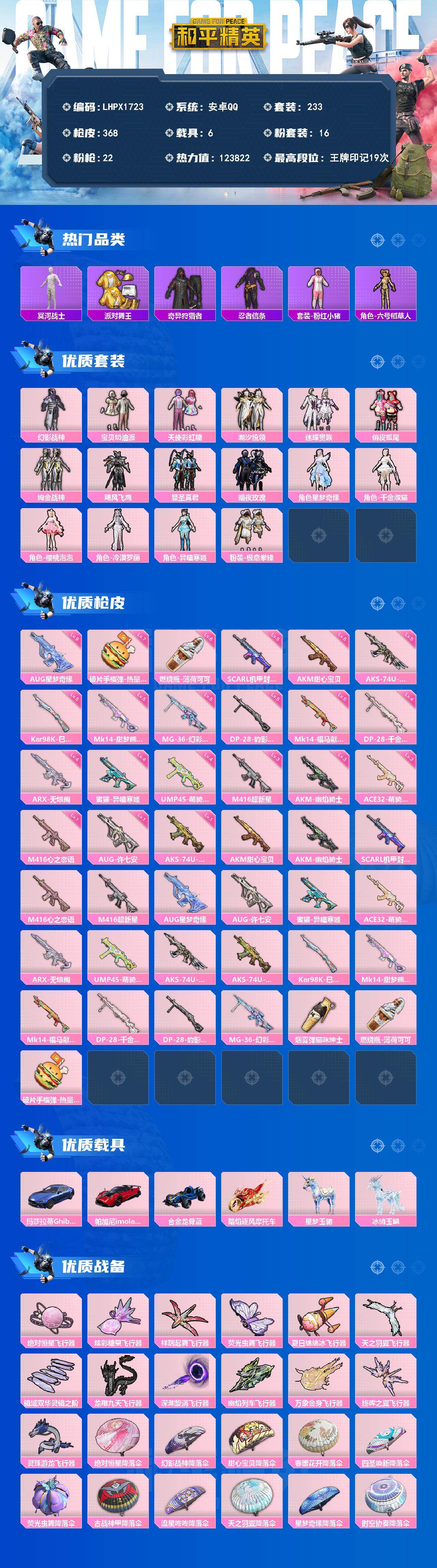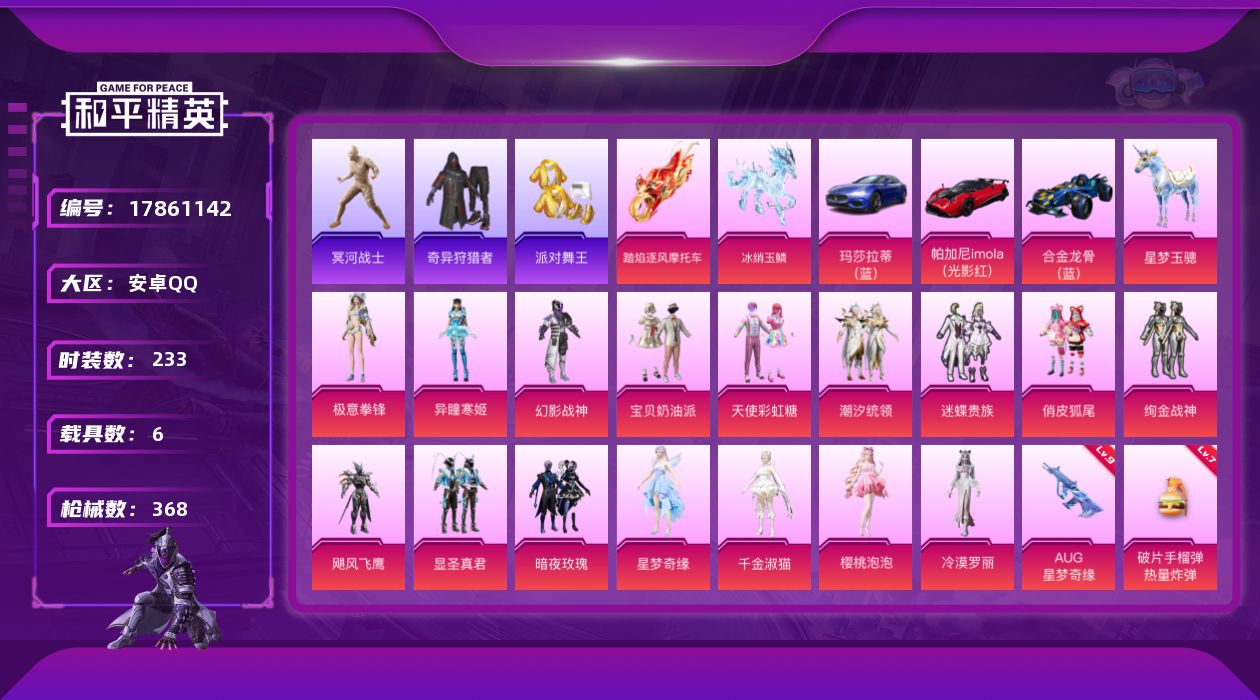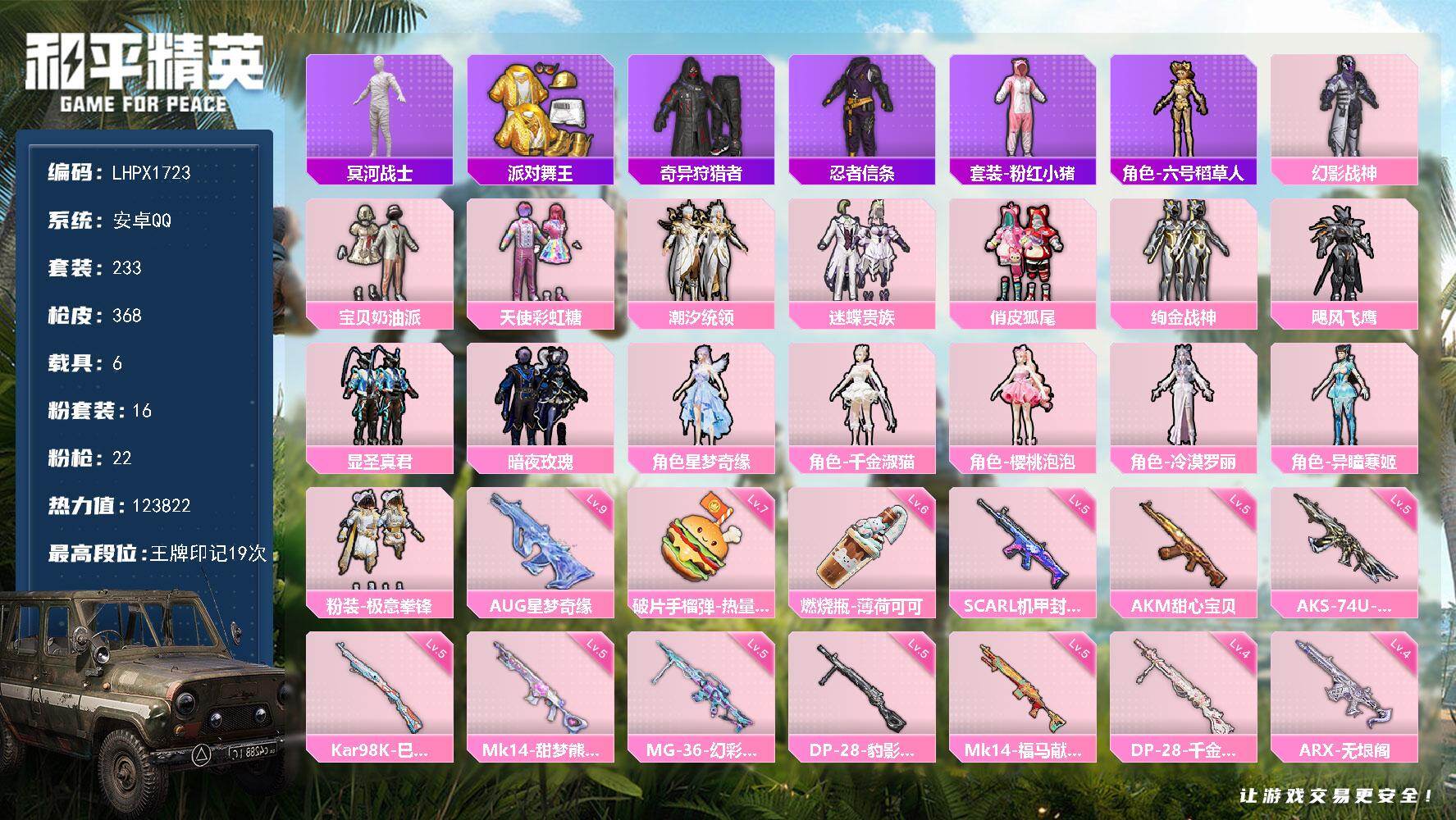 [17861142]可二次【特价出售/店主推荐】 AUG-星梦奇缘(九级)/绝世印记8/老木乃伊 安卓 手Q-16粉装-22特效枪-6载具-13粉色飞行器-123822热力值-19王牌印记-233套装-368枪皮【热门品类】:套装-冥河战士,套装-派对舞王,套装-奇异狩猎者,套装-忍者信条,套装-粉红小猪,角色-六号稻草人【粉色套装】:粉装-幻影战神,粉装-宝贝奶油派,粉装-天使彩虹糖,粉装-潮汐统领,粉装-迷蝶贵族,粉装-俏皮狐尾,粉装-绚金战神,粉装-飓风飞鹰,粉装-显圣真君,粉装-暗夜玫瑰,角色-星梦奇缘,角色-千金淑猫,角色-樱桃泡泡,角色-冷漠罗丽,角色-异瞳寒姬,粉装-极意拳锋【粉色枪皮等级】:AKM-甜心宝贝(五级),AKM-幽焰骑士(三级),SCAR-L-机甲封神(五级),M416-心之恋语(一级),M416-超新星(三级),AUG-星梦奇缘(九级),AUG-许七安(一级),蜜獾-异瞳寒姬(四级),ACE32-萌骑漫游(三级),ARX-无垠阁(四级),UMP45-萌骑冒险(四级),AKS-74U-信仰神谕(五级),AKS-74U-森灵之息(一级),Kar98K-巳巳如意(五级),Mk14-甜梦熊击(五级),Mk14-福马献瑞(五级),DP-28-千金淑猫(四级),DP-28-豹影疾电(五级),MG-36-幻彩电音(五级),燃烧瓶-薄荷可可(六级),破片手榴弹-热量炸弹(七级)【粉色载具】:玛莎拉蒂Ghibli(蓝),帕加尼imola(光影红),合金龙骨(蓝),踏焰逐风摩托车,星梦玉骢,冰绡玉鳞【粉色枪皮】:AKM-甜心宝贝,AKM-幽焰骑士,SCAR-L-机甲封神,M416-心之恋语,M416-超新星,AUG-星梦奇缘,AUG-许七安,蜜獾-异瞳寒姬,ACE32-萌骑漫游,ARX-无垠阁,UMP45-萌骑冒险,AKS-74U-信仰神谕,AKS-74U-森灵之息,Kar98K-巳巳如意,Mk14-甜梦熊击,Mk14-福马献瑞,DP-28-千金淑猫,DP-28-豹影疾电,MG-36-幻彩电音,烟雾弹-猫咪绅士,燃烧瓶-薄荷可可,破片手榴弹-热量炸弹【粉色飞行器】:绝对恒星飞行器,炫彩糖果飞行器,祥瑞起舞飞行器,荧光虫舞飞行器,夏日绵绵冰飞行器,天之羽翼飞行器,镜域双华-灵镜之阶,龙翔九天飞行器,深渊漩涡飞行器,幽焰列车飞行器,万象金身飞行器,终晖之翼飞行器,灵珠游龙飞行