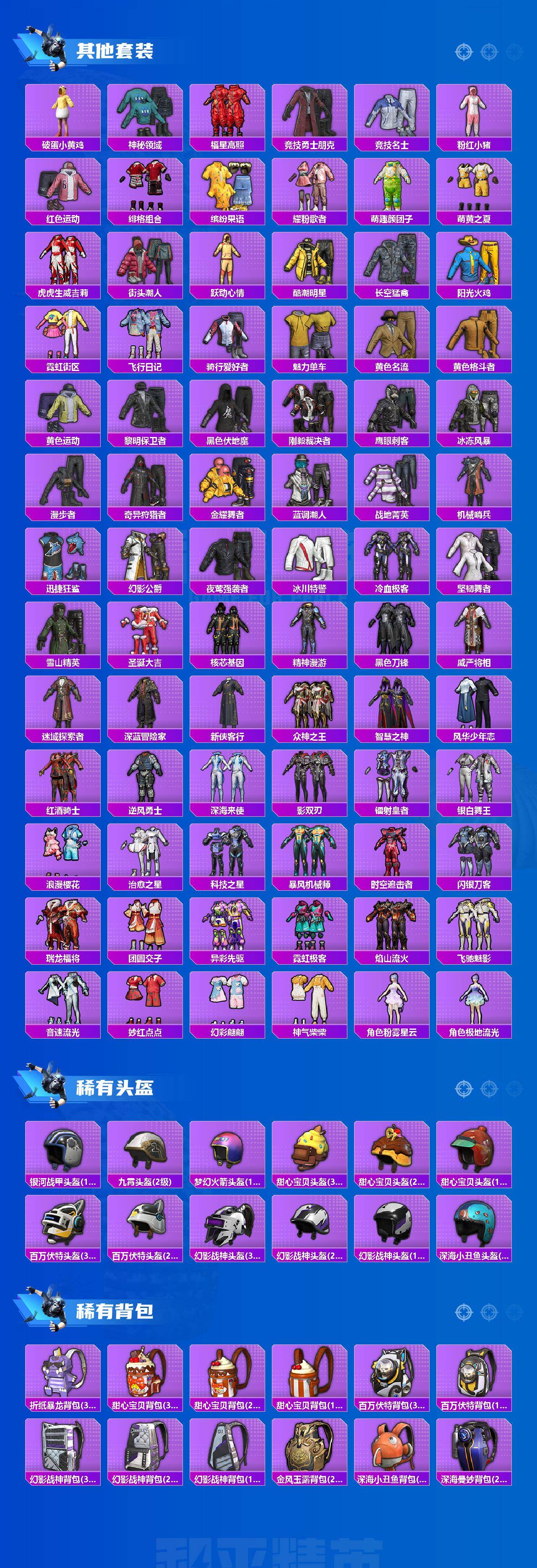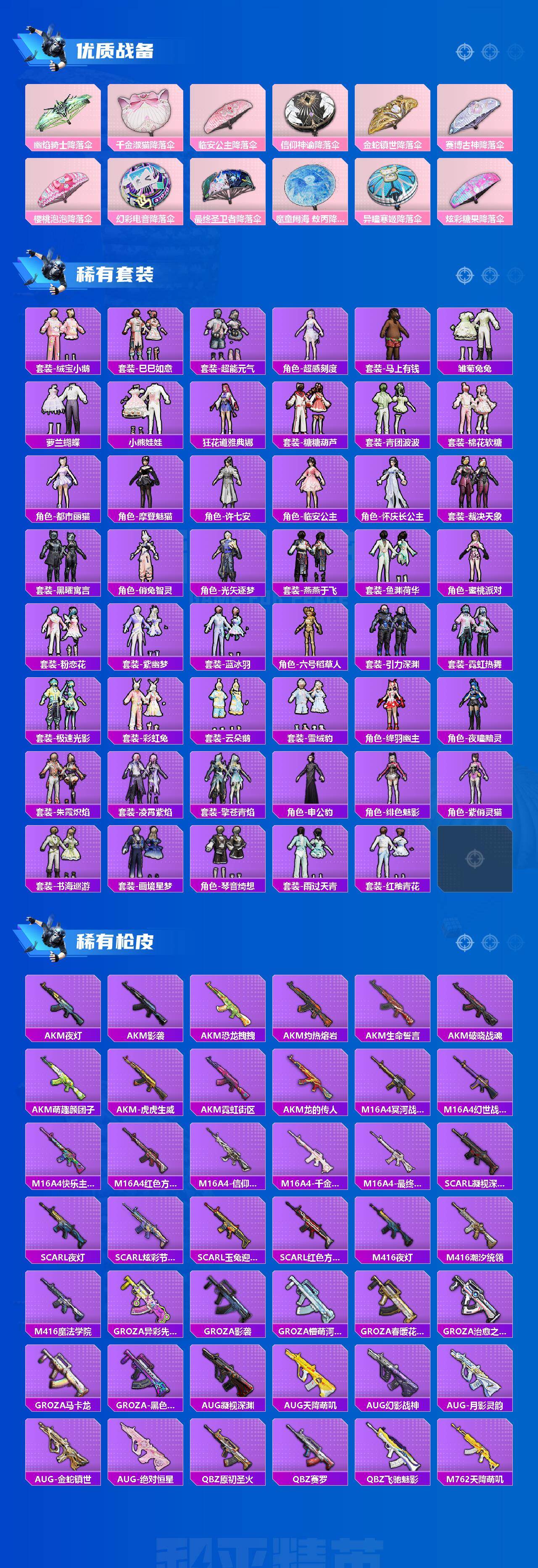- [16334212]【特价出售/店主推荐】苹果 微信-1神装-4粉装-4特效枪-1载具-2粉色飞行器-34569热力值-4王牌印记-78套装-115枪皮 【红色神装等级】:灵猫魔法师-塞维尔(二级) 【红色角色神装】:灵猫魔法师-塞维尔 【热门品类】:套装-都市猎人,套装-小丑鱼,套装-星河浪客 【粉色套装】:粉装-未来战士,角色-荧海星豚,角色-绯穹魔姬,角色-异瞳寒姬 【粉色枪皮等级】:M416-灵猫魔法师(三级),蜜獾-荧海星豚(五级),Kar98K-巳巳如意(五级),DP-28-豹影疾电(五级) 【粉色载具】:黑曜夜骑 【粉色枪皮】:M416-灵猫魔法师,蜜獾-荧海星豚,Kar98K-巳巳如意,DP-28-豹影疾电 【粉色飞行器】:灵猫魔法师飞行器 【粉色降落伞】:绝对恒星降落伞,未来战士降落伞,冷漠罗丽降落伞,荧海星豚降落伞,灵猫魔法师降落伞,绯穹魔姬降落伞,喜羊羊与灰太狼降落伞,异瞳寒姬降落伞,炫彩糖果降落伞 【稀有套装】:套装-超能元气,套装-荧光像素,套装-雪国风尚,套装-炫彩糖果,套装-燕燕于飞,套装-鱼渊荷华,套装-彩虹兔,套装-云朵鹅,套装-雪绒豹,套装-混沌火种,角色-灵公主,套装-蜜露汐语,套装-蓝海鲸歌,套装-极光猎影,角色-绛羽幽主,角色-夜瞳黯灵,套装-朱霞炽焰,套装-凌霄紫焰,套装-擎苍青焰,玩偶服-喜羊羊,角色-绯色魅影,角色-紫俏灵猫,套装-书海巡游,套装-画境星梦,套装-琴音绮想 【稀有枪皮】:AUG-冰晶雪宝,AKM-影袭,AKM-缤纷海域,AKM-灵猫魔法师,AKM-极光猎影,M16A4-幻世战舞者,SCAR-L-未来战士,SCAR-L-炫彩节奏,SCAR-L-冷漠罗丽,SCAR-L-天象三御,GROZA-影袭,GROZA-荧海星豚,AUG-绝对恒星,QBZ-魔药课室,M762-云朵鹅,蜜獾-绯穹魔姬,ACE32-钛晶裂爪,ACE32-画境星梦,ARX-凌霄紫焰,UZI-影袭,UMP45-绒宝小鹅,Vector-生命誓言,汤姆逊-环太平洋,汤姆逊-灵猫魔法师,MP5K-画境星梦,AKS-74U-极光猎影,AKS-74U-荧光像素,JS9-凌霄紫焰,Kar98K-影袭,M24-影袭,SKS-迅猛狂鲨,VSS-未来战士,Mini14-绯穹魔姬,AMR-喜羊羊与灰太狼,M200-爆裂游戏,SVD-云朵鹅,M1加兰德-画境星梦,S686-未来战士,
