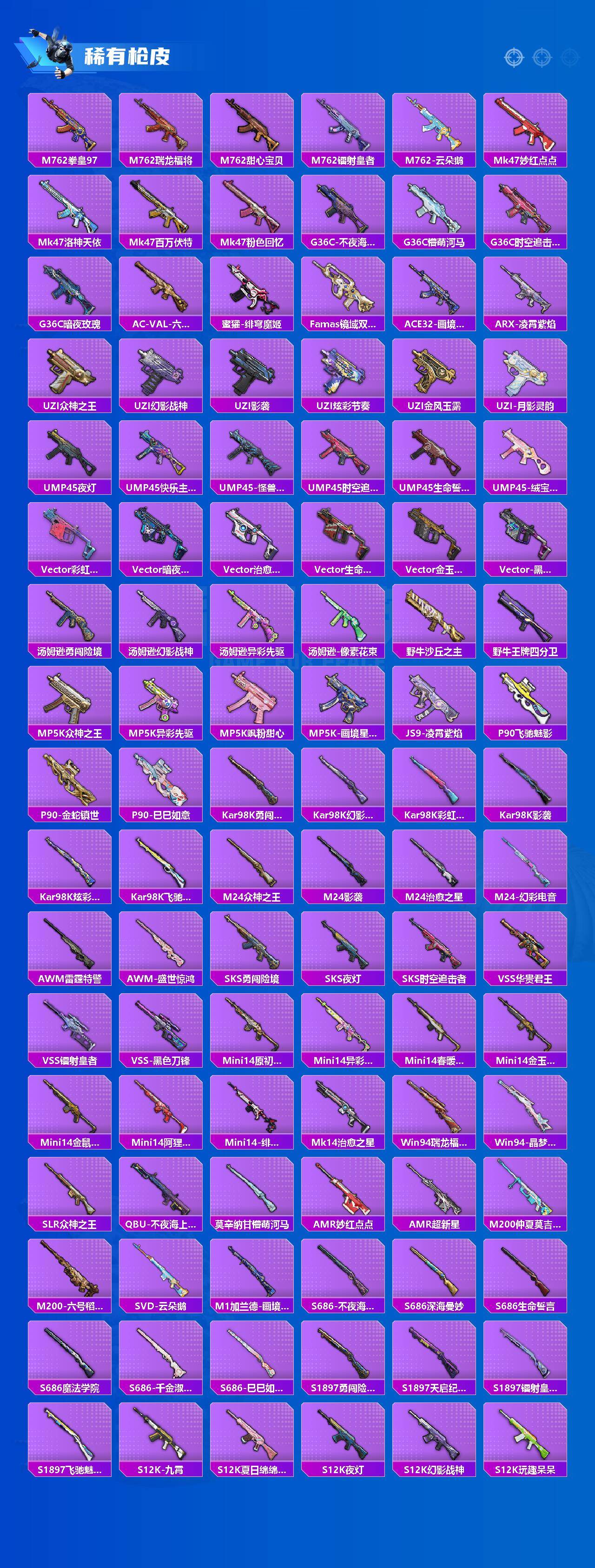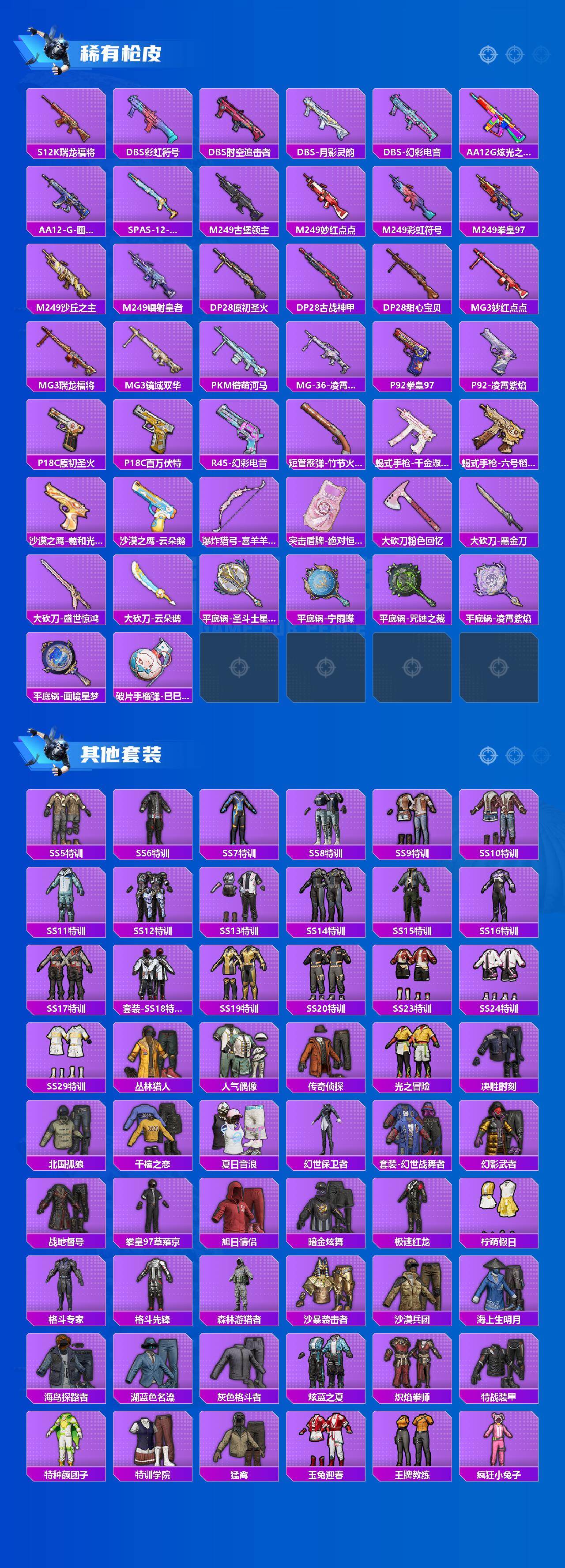 - [16933698]19m总资产-1246k哈伏币-60烽火等级-铂金-11战场等级-列兵 【干员外观】:红狼-蚀金玫瑰,无名-夜鹰,深蓝-不破誓约,红狼-电锯惊魂 【近战皮肤】:近战-北极星,近战-黑鹰 【传说外观】:M4A1突击步枪-蚀金玫瑰,M4A1突击步枪-阿米娅,ASh-12战斗步枪-鹅鸭杀,SG552突击步枪-运动员,AK-12突击步枪-夜鹰,AK-12突击步枪-特斯拉线圈,SCAR-H战斗步枪-启航,G3战斗步枪-骑士,CAR-15突击步枪-黑鹰坠落,K437突击步枪-北极星,KC17突击步枪-电锯惊魂,Vector冲锋枪-能天使-午夜邮差,UZI冲锋枪-特斯拉线圈,SMG-45冲锋枪-骑士,SR-3M紧凑突击步枪-特斯拉线圈,勇士冲锋枪-能天使-午夜邮差,QCQ171冲锋枪-北极星,QCQ171冲锋枪-鹅鸭杀,M250通用机枪-骑士之心,QJB201轻机枪-鹅鸭杀,M14射手步枪-电锯惊魂 【史诗外观】:AKM突击步枪-林中猎手,ASh-12战斗步枪-守夜人,ASh-12战斗步枪-无极限,AUG突击步枪-蝮蛇,SG552突击步枪-尖端治疗,SG552突击步枪-深海恐惧,SCAR-H战斗步枪-囚徒,AS Val突击步枪-尖端治疗,AS Val突击步枪-百步穿杨,腾龙突击步枪-猎鳄行动,K437突击步枪-守护者,MP5冲锋枪-深海恐惧,MP5冲锋枪-战术竞备,Vector冲锋枪-阿萨拉文明,Vector冲锋枪-异域战争,SR-3M紧凑突击步枪-战术竞备,勇士冲锋枪-工业狂潮,MP7冲锋枪-守护者,M1014霰弹枪-林中猎手,S12K霰弹枪-曙光,PKM通用机枪-蝮蛇,PKM通用机枪-守夜人,M250通用机枪-囚徒,Mini-14射手步枪-守护者,SVD狙击步枪-阿萨拉工艺,M14射手步枪-黑鹰坠落,SR-25射手步枪-尖端治疗,SR-25射手步枪-聚光灯,SV-98狙击步枪-囚徒,M700狙击步枪-守夜人,AWM狙击步枪-无极限,.357左轮-幸运时刻,复合弓-守护者 【稀有外观】:PKM通用机枪-极地勘察队,AKM突击步枪-战术演练,QBZ95-1突击步枪-公平竞技,K416突击步枪-黑骑士,M16A4突击步枪-远航,M7战斗步枪-捣蛋鬼,SCAR-H战斗步枪-童趣,SCAR-H战斗步枪-远航,SCAR-H战斗步枪-荣耀列队,SCAR-H战斗步枪-黄昏,G3战斗步枪-战