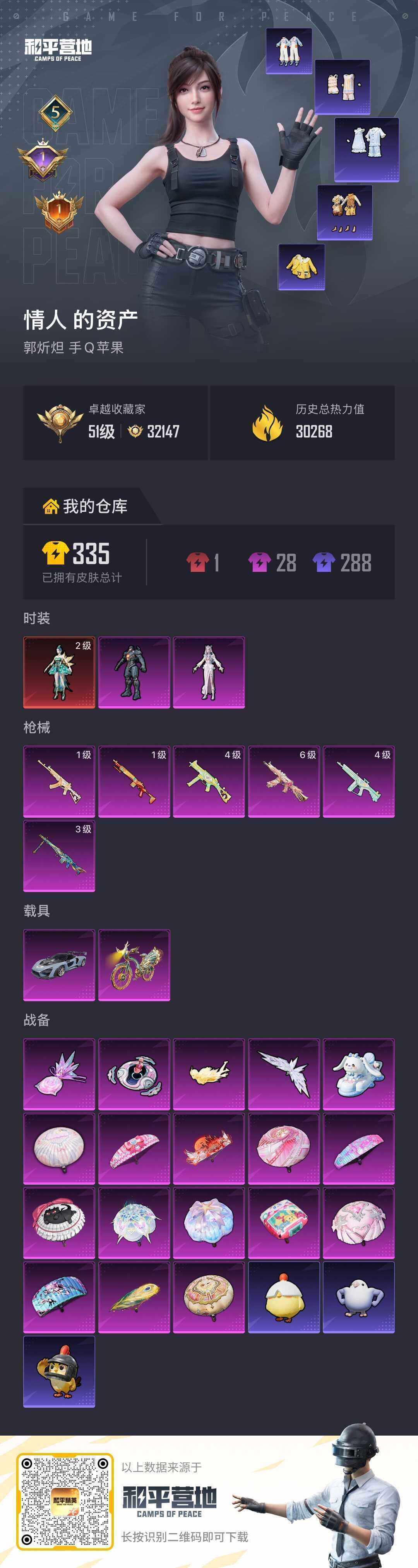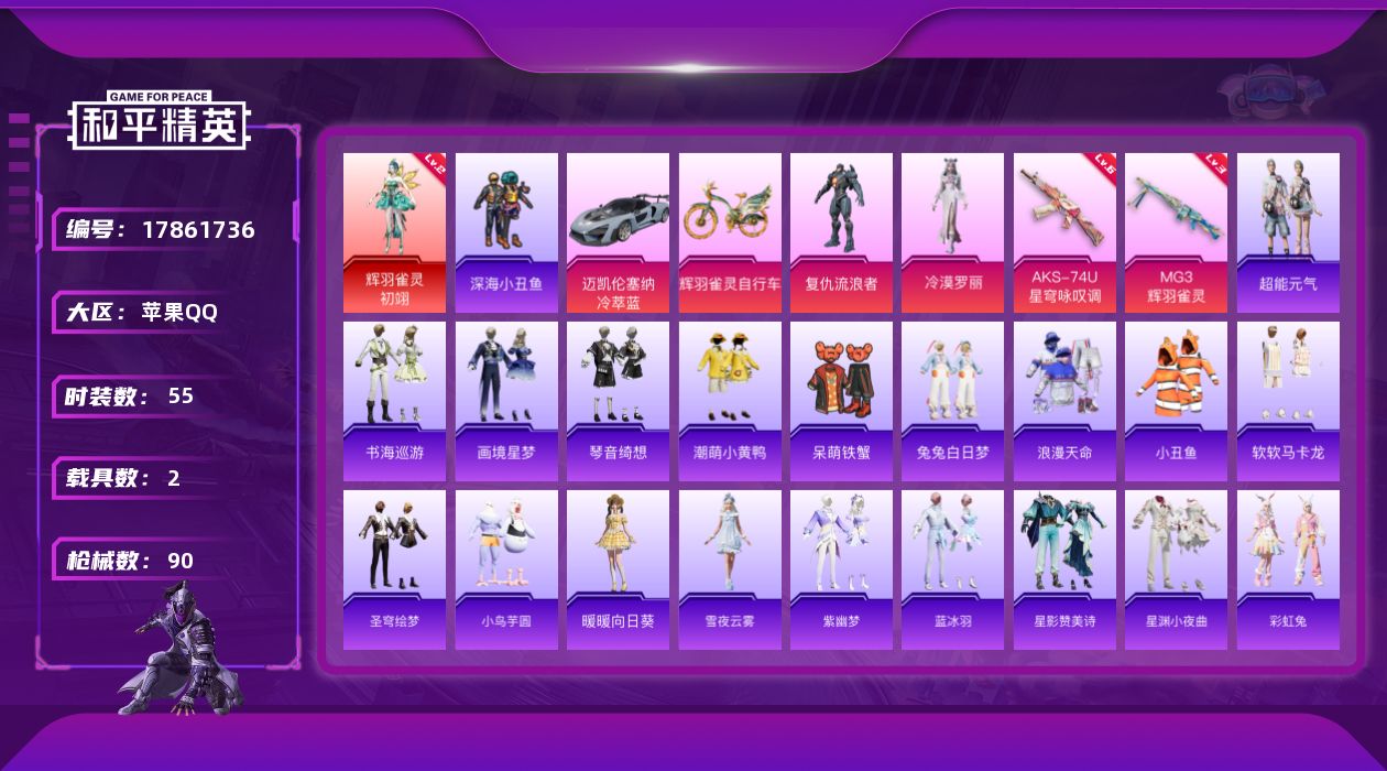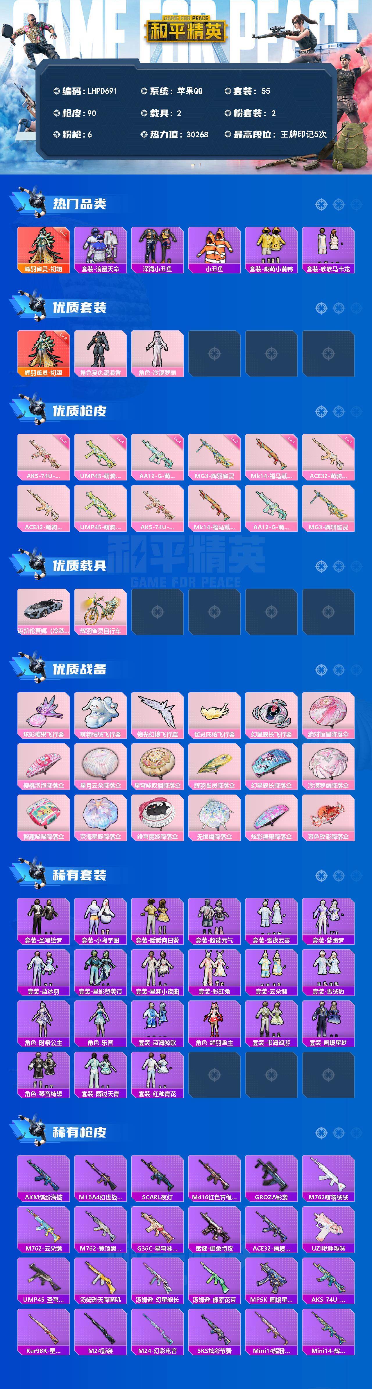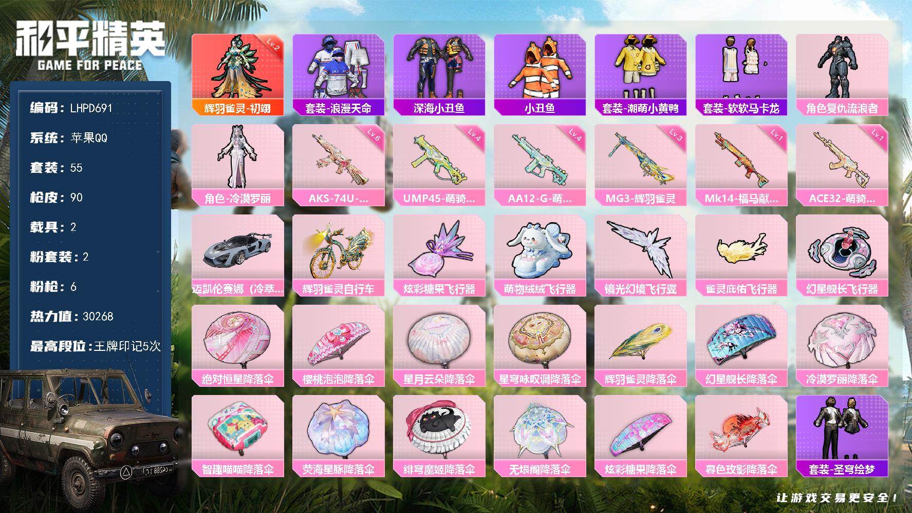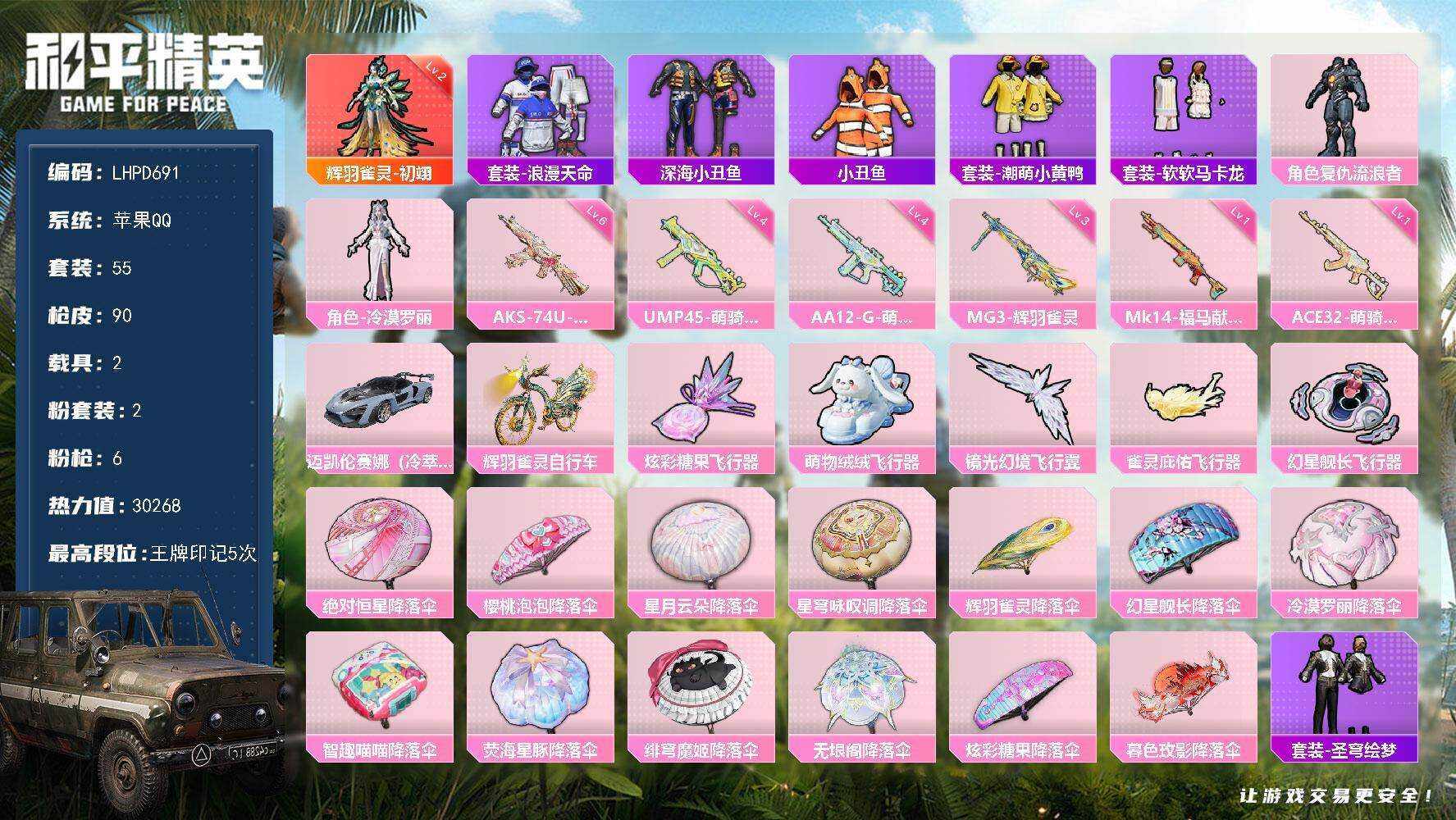 [17861736]【店主推荐捡漏号!可直接换绑】苹果 手Q-1神装-2粉装-6特效枪-2载具-5粉色飞行器-30268热力值-5王牌印记-55套装-90枪皮【红色神装等级】:辉羽雀灵-初翊(二级)【红色角色神装】:辉羽雀灵-初翊【热门品类】:套装-浪漫天命,套装-深海小丑鱼,套装-小丑鱼,套装-潮萌小黄鸭,套装-软软马卡龙【粉色套装】:角色-复仇流浪者,角色-冷漠罗丽【粉色枪皮等级】:ACE32-萌骑漫游(一级),UMP45-萌骑冒险(四级),AKS-74U-星穹咏叹调(六级),Mk14-福马献瑞(一级),AA12-G-萌骑幻想(四级),MG3-辉羽雀灵(三级)【粉色载具】:迈凯伦塞纳(冷萃蓝),辉羽雀灵自行车【粉色枪皮】:ACE32-萌骑漫游,UMP45-萌骑冒险,AKS-74U-星穹咏叹调,Mk14-福马献瑞,AA12-G-萌骑幻想,MG3-辉羽雀灵【粉色飞行器】:炫彩糖果飞行器,萌物绒绒飞行器,镜光幻境飞行翼,雀灵庇佑飞行器,幻星舰长飞行器