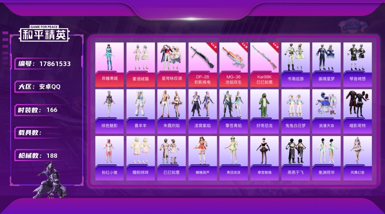 - [15225362]【店主推荐捡漏号!可直接换绑】素材身法号 安卓 手Q-3粉装-5特效枪-3载具-2粉色飞行器-6.7w热力值-15王牌印记-142套装-200枪皮 【热门品类】:套装-粉红小猪 【粉色套装】:粉装-海渊国主,粉装-暗夜鎏金,角色-绯穹魔姬 【粉色枪皮等级】:M16A4-垂柳戏鸭(七级),SCAR-L-青春物语(七级),M416-五爪金龙(七级),Kar98K-巳巳如意(五级),DP-28-豹影疾电(五级) 【粉色载具】:帕加尼imola(艺术银),星河领航(磐石银),灵鼠银迹 【粉色枪皮】:M16A4-垂柳戏鸭,SCAR-L-青春物语,M416-五爪金龙,Kar98K-巳巳如意,DP-28-豹影疾电 【粉色飞行器】:青春物语飞行器 【粉色降落伞】:环太平洋降落伞,垂柳戏鸭降落伞,千金淑猫降落伞,星穹咏叹调降落伞,荧海星豚降落伞 【稀有套装】:套装-巳巳如意,套装-超能元气,套装-雪国风尚,角色-都市丽猫,套装-彩虹兔,套装-云朵鹅,套装-雪绒豹,角色-乐音,套装-朱霞炽焰,套装-凌霄紫焰,套装-擎苍青焰,玩偶服-懒羊羊,套装-炫彩糖果 【稀有枪皮】:AUG-冰晶雪宝,AKM-星之彼岸,AKM-江南烟雨,AKM-灼热熔岩,AKM-虎虎生威,M16A4-幻世战舞者,M16A4-甜心亚梦,M16A4-生命誓言,M16A4-红色方程式,M16A4-蓝色火焰,SCAR-L-炫彩节奏,SCAR-L-玉兔迎春,SCAR-L-生命誓言,SCAR-L-冷漠罗丽,M416-红色方程式,M416-蓝色火焰,GROZA-异彩先驱,GROZA-懵萌河马,GROZA-生命誓言,GROZA-田园牧歌,GROZA-荧海星豚,AUG-天降萌叽,AUG-海螺星光,AUG-耀粉歌者,QBZ-彩虹符号,QBZ-洛神天依,QBZ-飞驰魅影,M762-天降萌叽,M762-牛气冲天,M762-瑞龙福将,M762-云朵鹅,Mk47-妙红点点,G36C-懵萌河马,G36C-暗夜玫瑰,AC-VAL-天降萌叽,AC-VAL-甜心亚梦,蜜獾-垂柳戏鸭,蜜獾-天降萌叽,蜜獾-娇憨猪猪,ARX-凌霄紫焰,UZI-天降萌叽,UZI-娇憨猪猪,UZI-炫彩节奏,UZI-生命誓言,UZI-红色方程式,UMP45-夜灯,UMP45-生命誓言,Vector-焰鹰斗篷,Vector-生命誓言,Vector-田园牧歌,汤姆逊-异彩先驱,
