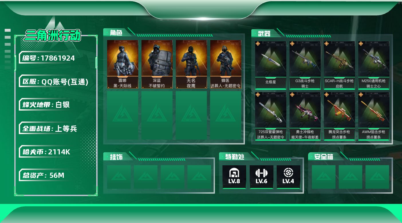 [17861924]56m总资产-2114k哈夫币-60烽火等级-白银-41战场等级-上等兵 【干员外观】:露娜-黑·天际线,蜂医-送葬人·无题密令,无名-夜鹰,深蓝-不破誓约 【近战皮肤】:近战-北极星,近战-黑鹰 【传说外观】:M4A1突击步枪-阿米娅,AK-12突击步枪-夜鹰,AK-12突击步枪-特斯拉线圈,SCAR-H战斗步枪-启航,G3战斗步枪-骑士,CAR-15突击步枪-阿米娅,腾龙突击步枪-捞点薯条,K437突击步枪-北极星,UZI冲锋枪-特斯拉线圈,SMG-45冲锋枪-骑士,SR-3M紧凑突击步枪-特斯拉线圈,勇士冲锋枪-能天使-午夜邮差,QCQ171冲锋枪-北极星,725双管霰弹枪-送葬人-无题密令,M250通用机枪-骑士之心,SR-25射手步枪-水墨云图,AWM狙击步枪-捞点薯条,93R-捞点薯条,复合弓-黑·天际线 【史诗外观】:AKM突击步枪-林中猎手,QBZ95-1突击步枪-曙光,ASh-12战斗步枪-守夜人,ASh-12战斗步枪-无极限,K416突击步枪-阿萨拉特攻,AUG突击步枪-蝮蛇,SG552突击步枪-尖端治疗,SG552突击步枪-深海恐惧,AS Val突击步枪-尖端治疗,AS Val突击步枪-典狱官,腾龙突击步枪-无垢,腾龙突击步枪-猎鳄行动,K437突击步枪-守护者,MP5冲锋枪-深海恐惧,MP5冲锋枪-战术竞备,P90冲锋枪-紧急戒备,Vector冲锋枪-阿萨拉文明,Vector冲锋枪-猎鳄行动,SR-3M紧凑突击步枪-荒野求生,SR-3M紧凑突击步枪-战术竞备,勇士冲锋枪-深海恐惧,MP7冲锋枪-无垢,MP7冲锋枪-守护者,M1014霰弹枪-林中猎手,S12K霰弹枪-曙光,PKM通用机枪-守夜人,PKM通用机枪-荒野求生,M250通用机枪-囚徒,QJB201轻机枪-Old Habits,Mini-14射手步枪-守护者,SVD狙击步枪-荒野求生,SR-25射手步枪-尖端治疗,PSG-1射手步枪-无垢,SV-98狙击步枪-林中猎手,SV-98狙击步枪-囚徒,SV-98狙击步枪-猎鳄行动,M700狙击步枪-蝮蛇,M700狙击步枪-守夜人,AWM狙击步枪-无极限,QSZ92G-风林火山,沙漠之鹰-曙光,复合弓-守护者 【稀有外观】:PTR-32突击步枪-黑潮,野牛冲锋枪-黑潮,M4A1突击步枪-蜂窝科技,AKM突击步枪-浅鲨小队,AKM突击步枪-战术