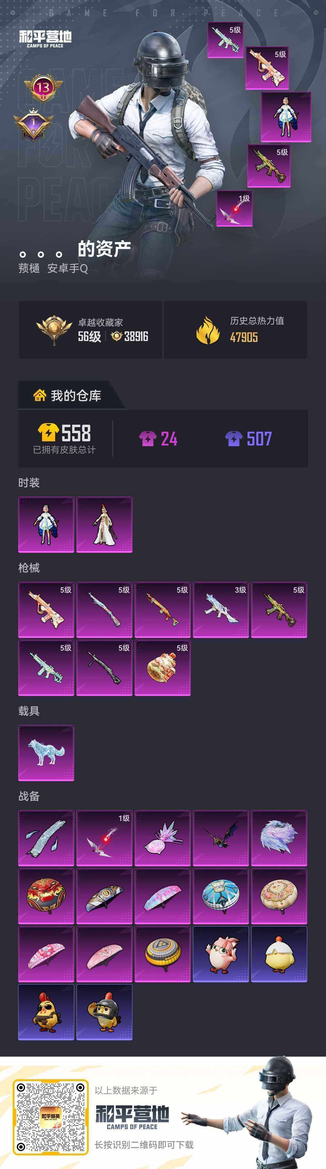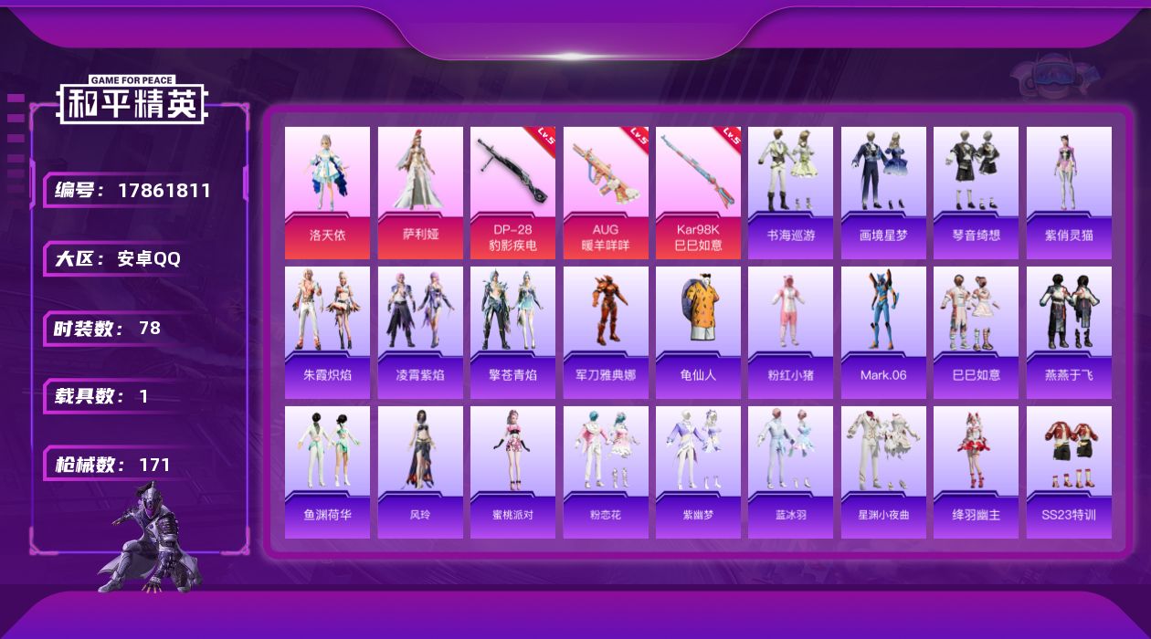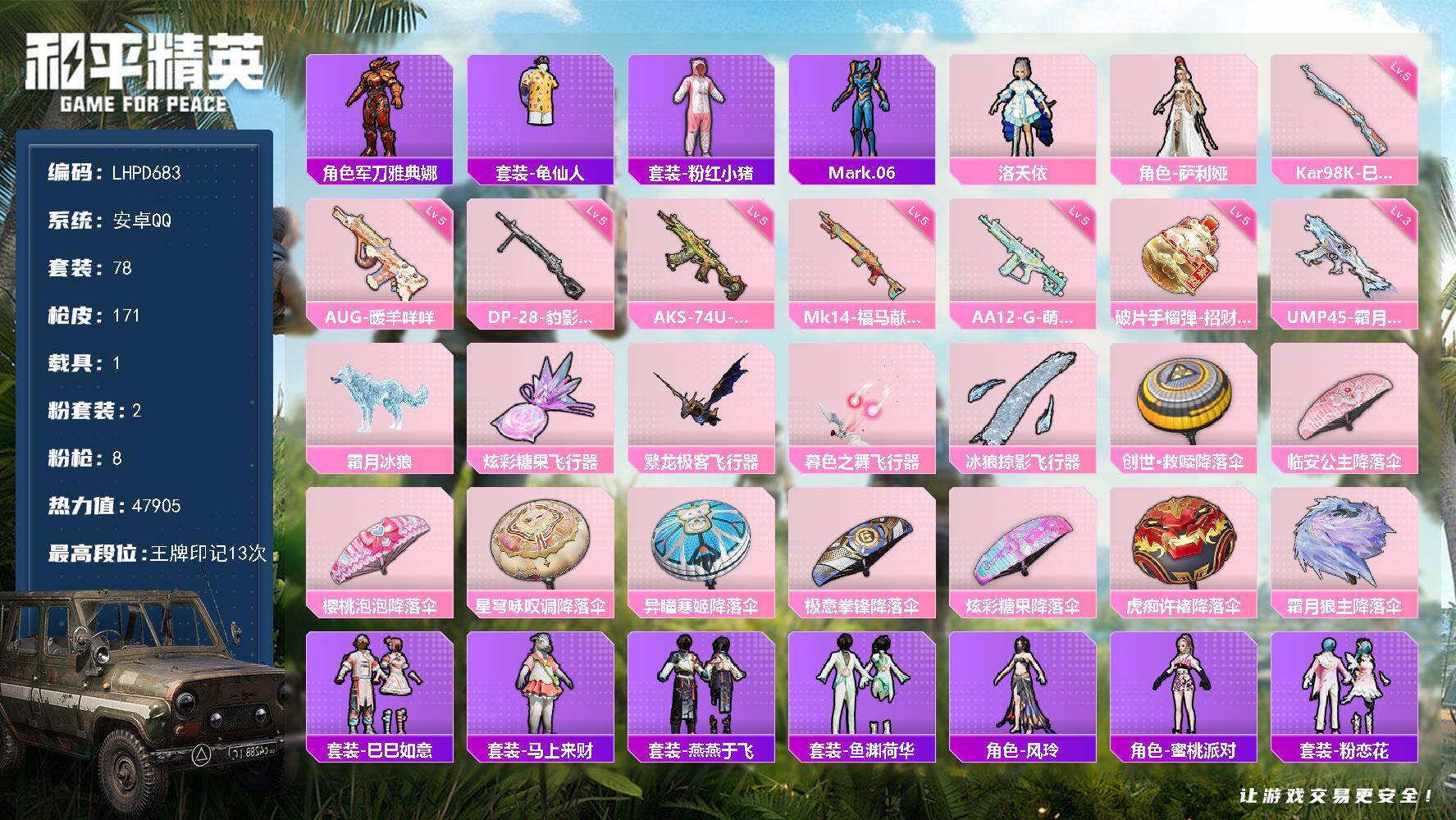 [17861811]【店主推荐捡漏号!可直接换绑】安卓 手Q-2粉装-8特效枪-1载具-4粉色飞行器-47905热力值-13王牌印记-78套装-171枪皮【热门品类】:角色-军刀雅典娜,套装-龟仙人,套装-粉红小猪,角色-Mark.06【粉色套装】:角色-洛天依,角色-萨利娅【粉色枪皮等级】:UMP45-霜月狼主(三级),AUG-暖羊咩咩(五级),AKS-74U-森灵之息(五级),Kar98K-巳巳如意(五级),Mk14-福马献瑞(五级),AA12-G-萌骑幻想(五级),DP-28-豹影疾电(五级),破片手榴弹-招财进宝(五级)【粉色载具】:霜月冰狼【粉色枪皮】:AUG-暖羊咩咩,UMP45-霜月狼主,AKS-74U-森灵之息,Kar98K-巳巳如意,Mk14-福马献瑞,AA12-G-萌骑幻想,DP-28-豹影疾电,破片手榴弹-招财进宝【粉色飞行器】:炫彩糖果飞行器,繁龙极客飞行器,暮色之舞飞行器,冰狼掠影飞行器